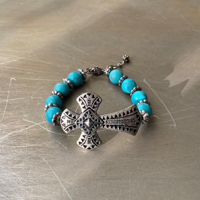 Used USA cross turquoise blue beads bracelet レトロ アメリカ ユーズド アクセサリー クロス ターコイズブルー ビーズ ブレスレット