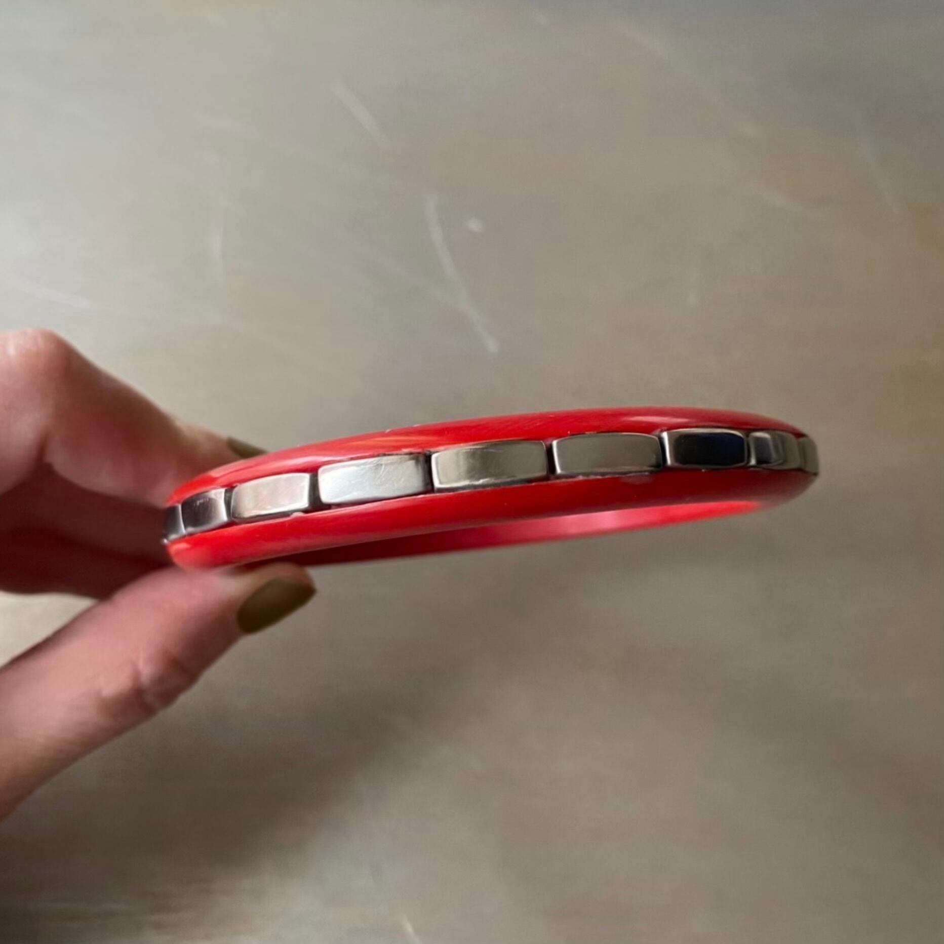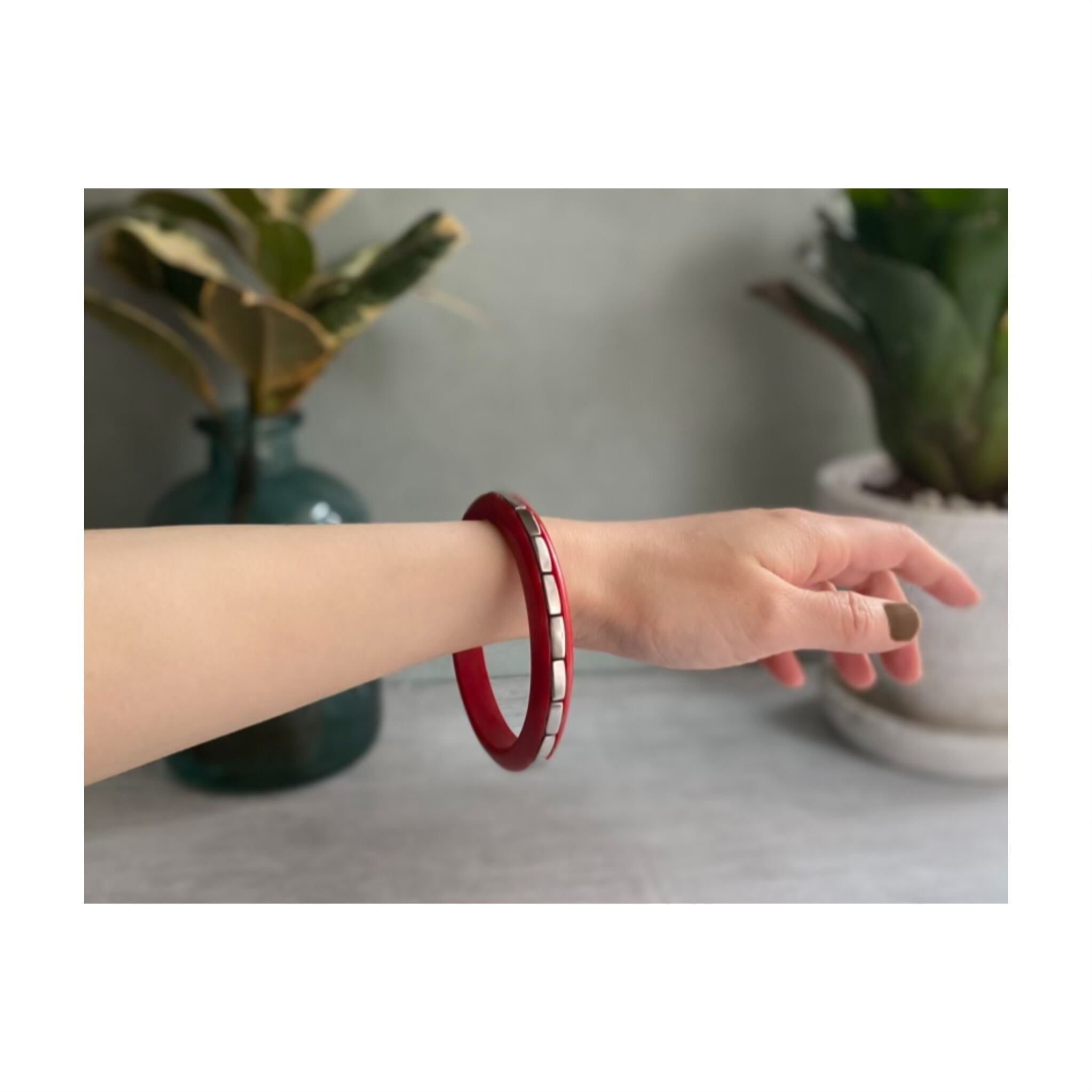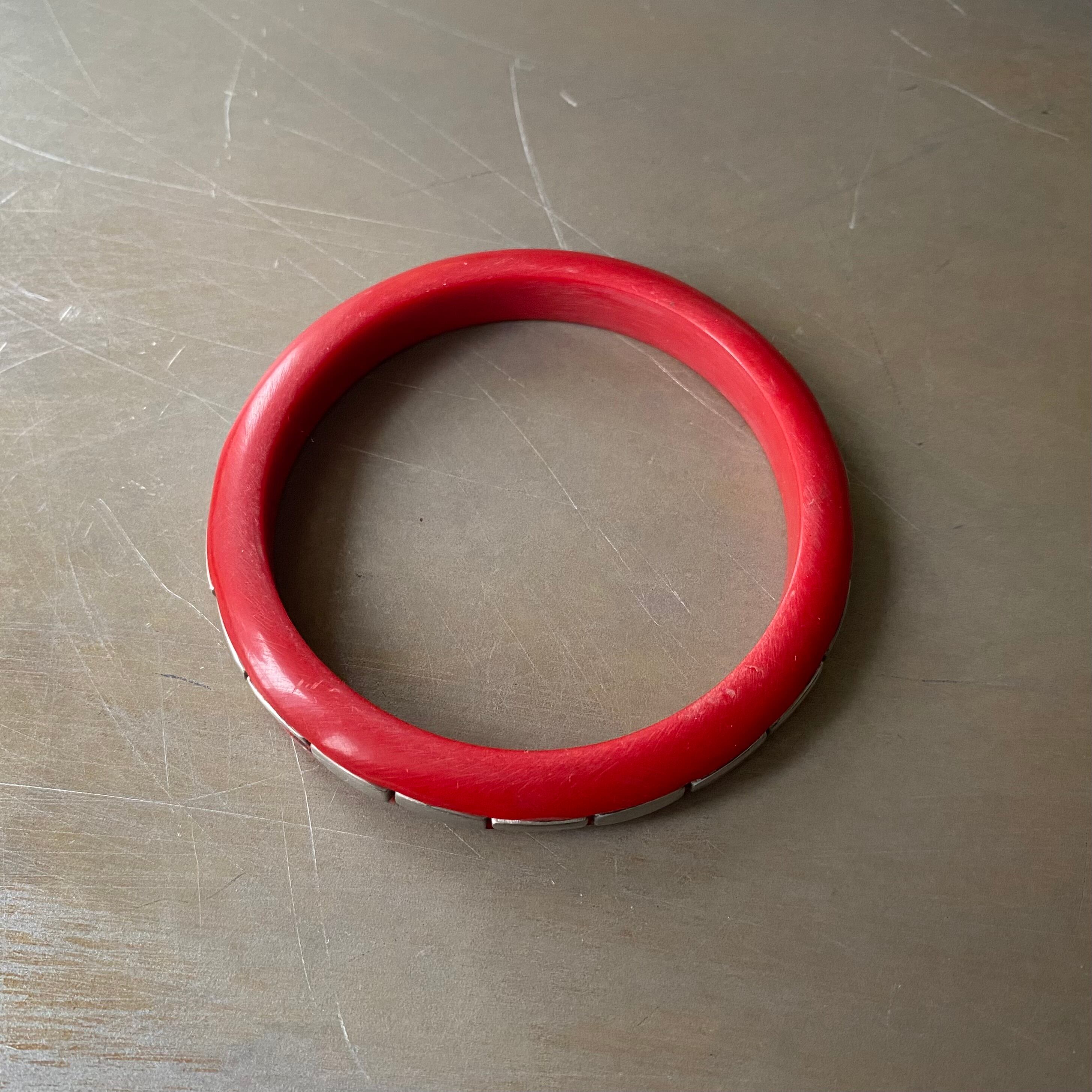レトロモードな雰囲気のUSAヴィンテージバングル。真っ赤なベースにシルバーのメタルパーツが一周はめ込まれた個性的なデザイン。軽やかな着け心地でコーディネートの差し色に。古着スタイルにもオススメです。