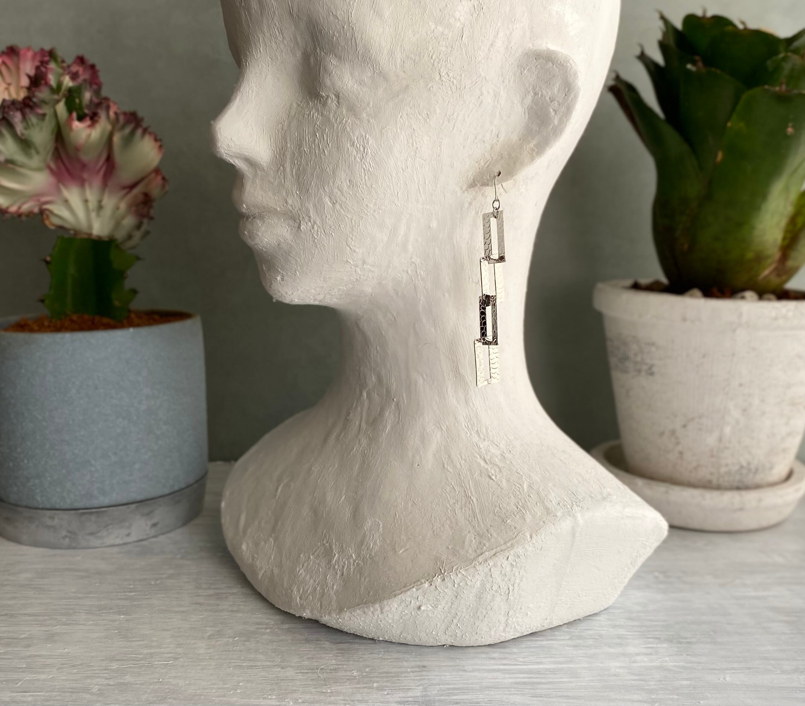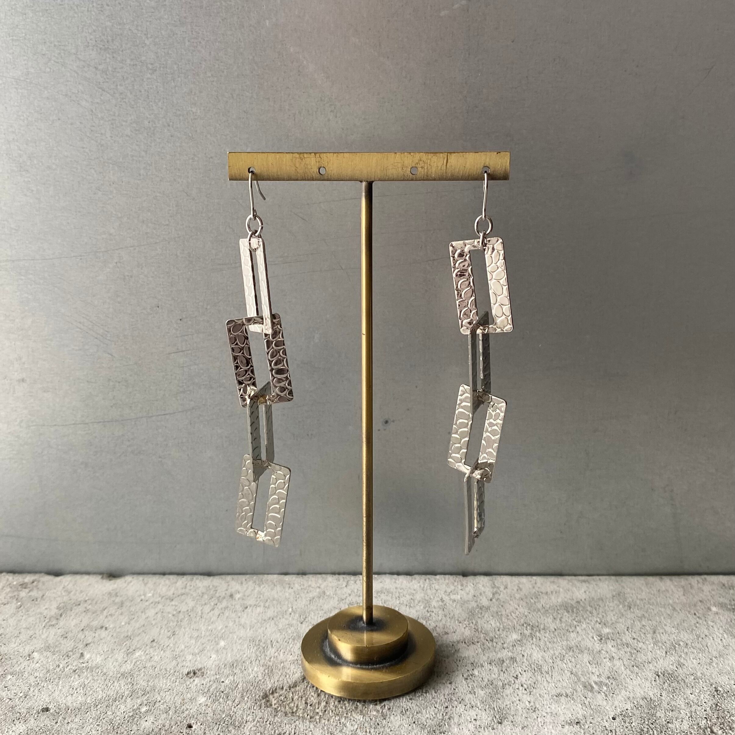 スタイリッシュなデザインのUSAヴィンテージピアス。レザー風テクスチャー入りの個性的なチェーンが揺らめき、コーディネートにお洒落な雰囲気をプラスしてくれます。