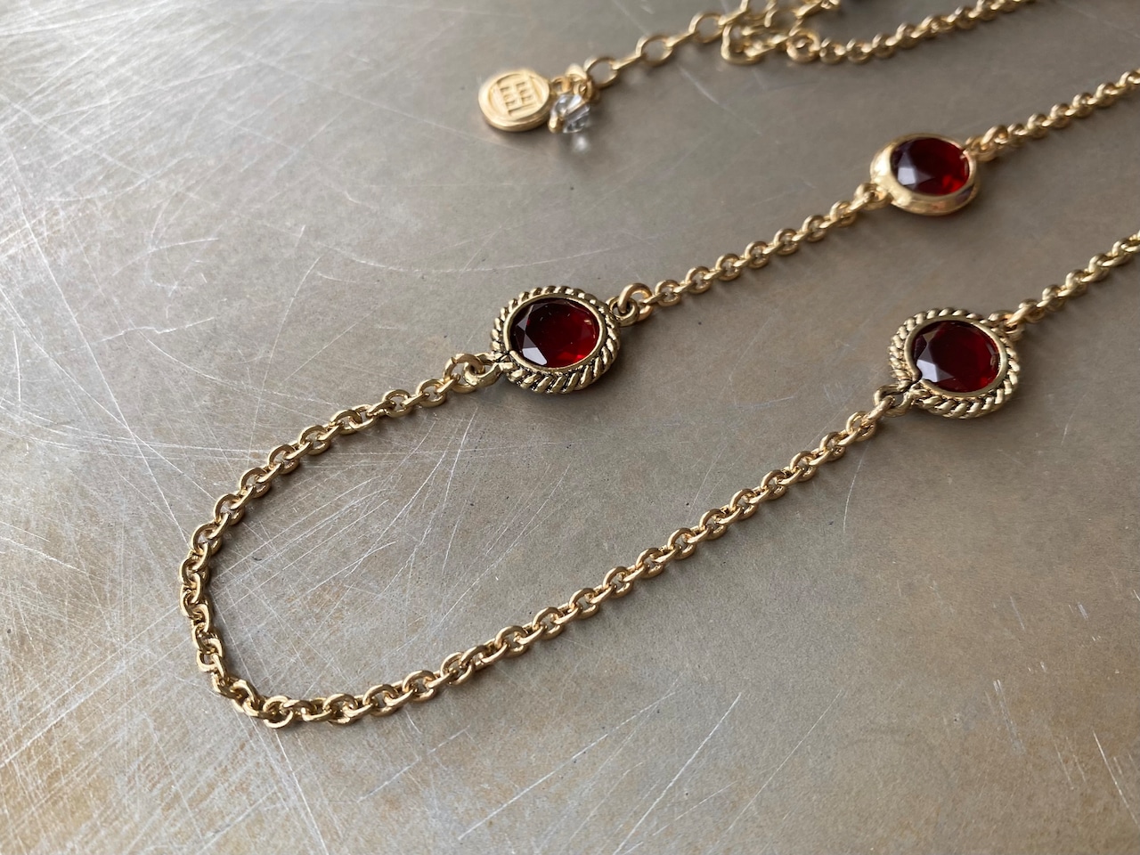 ルビーのような赤いクリスタルが輝くクラシカルな雰囲気のUSAヴィンテージネックレス。ビジューが贅沢に使われた存在感のあるデザイン。ロングタイプですのでスタイリングに合わせて2連にしてもお使いいただけます。古着Tシャツなどカジュアルなスタイルにもおすすめです。