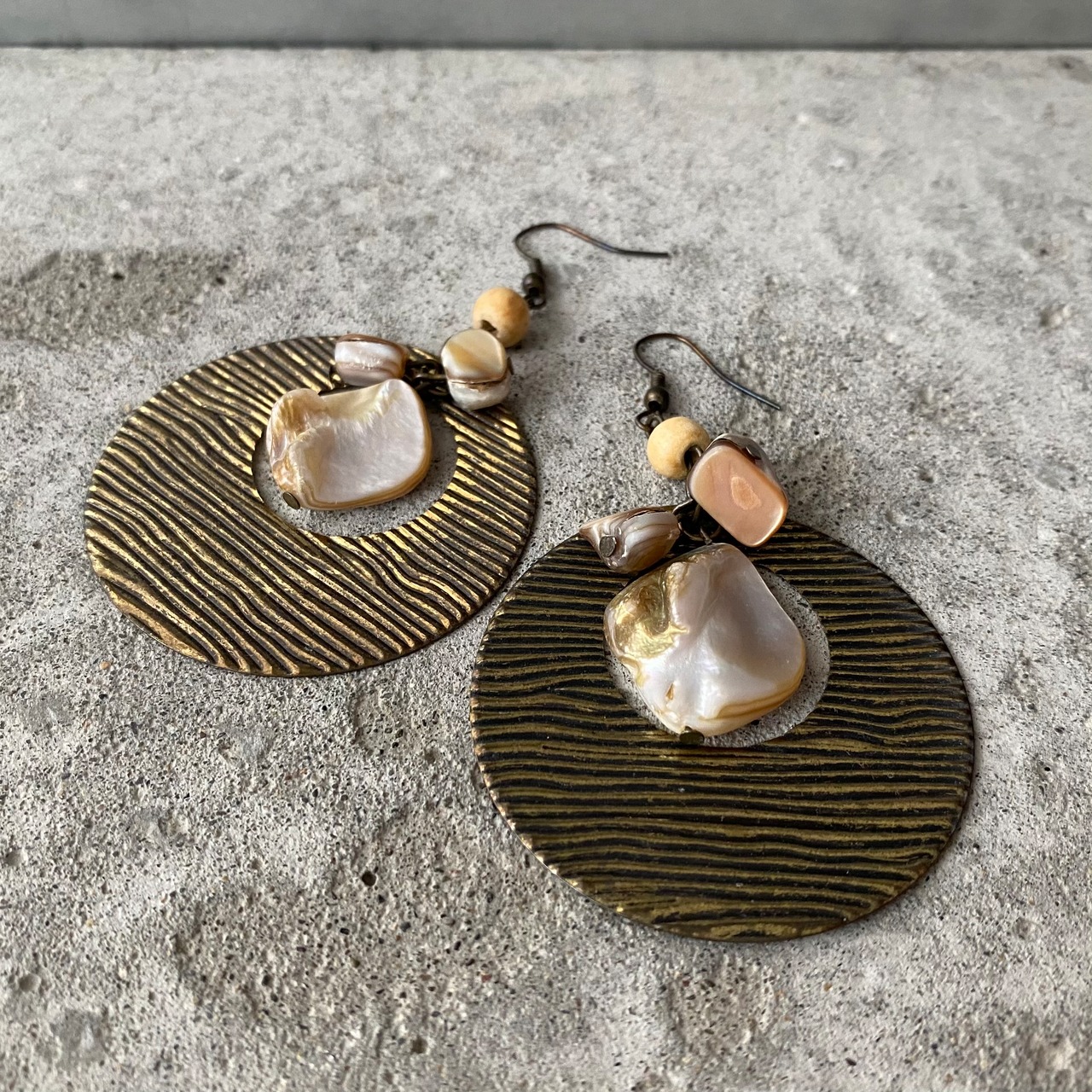 大きなメタルパーツと揺らめくシェルがおしゃれなUSAヴィンテージピアス。大ぶりで存在感たっぷり。古びたメタルの色味もクラシカルな雰囲気です。古着スタイルのアクセントにおすすめです。