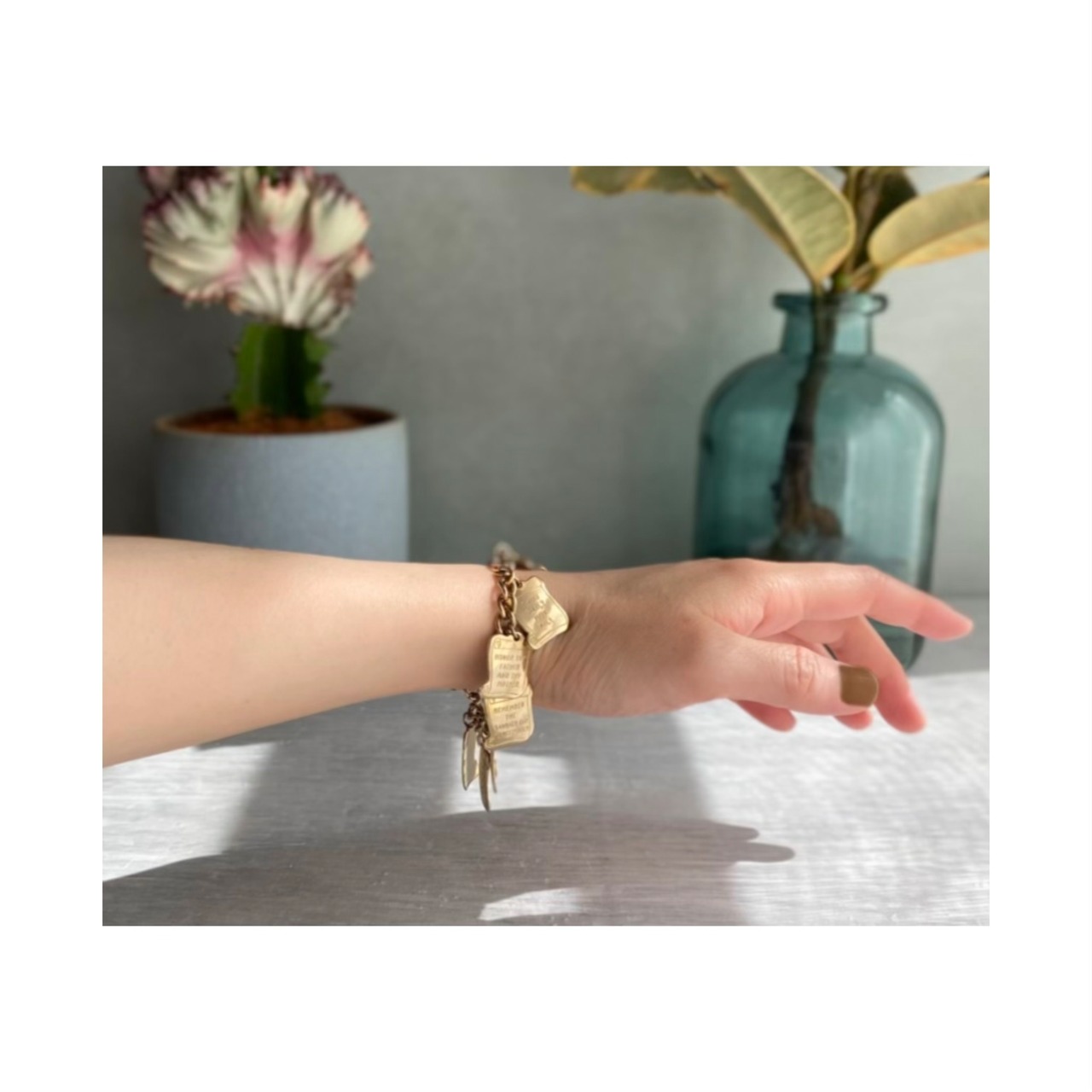 60年代のUSAヴィンテージブレスレットです。それぞれのチャームには聖書の10戒がデザインされています。揺れ動くチャームが存在感たっぷり。古着スタイルにもおすすめです。