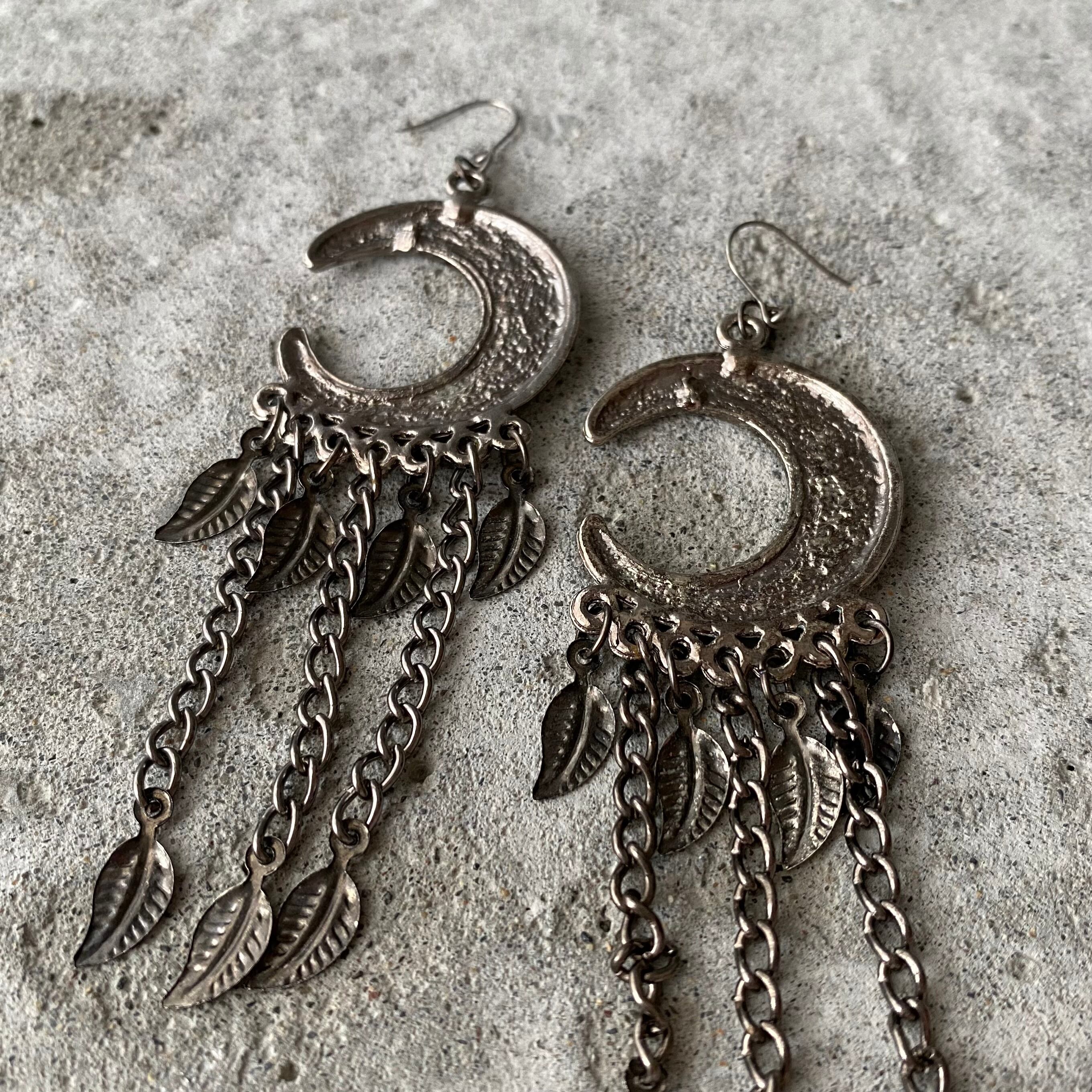 大きな三日月パーツにリーフのフリンジが揺らめく個性的なUSAユーズドピアス。ブラックカラーのメタルがクールな雰囲気。大ぶりで存在感がありコーディネートのアクセントに。古着やユニセックスなスタイルにもおすすめです。
