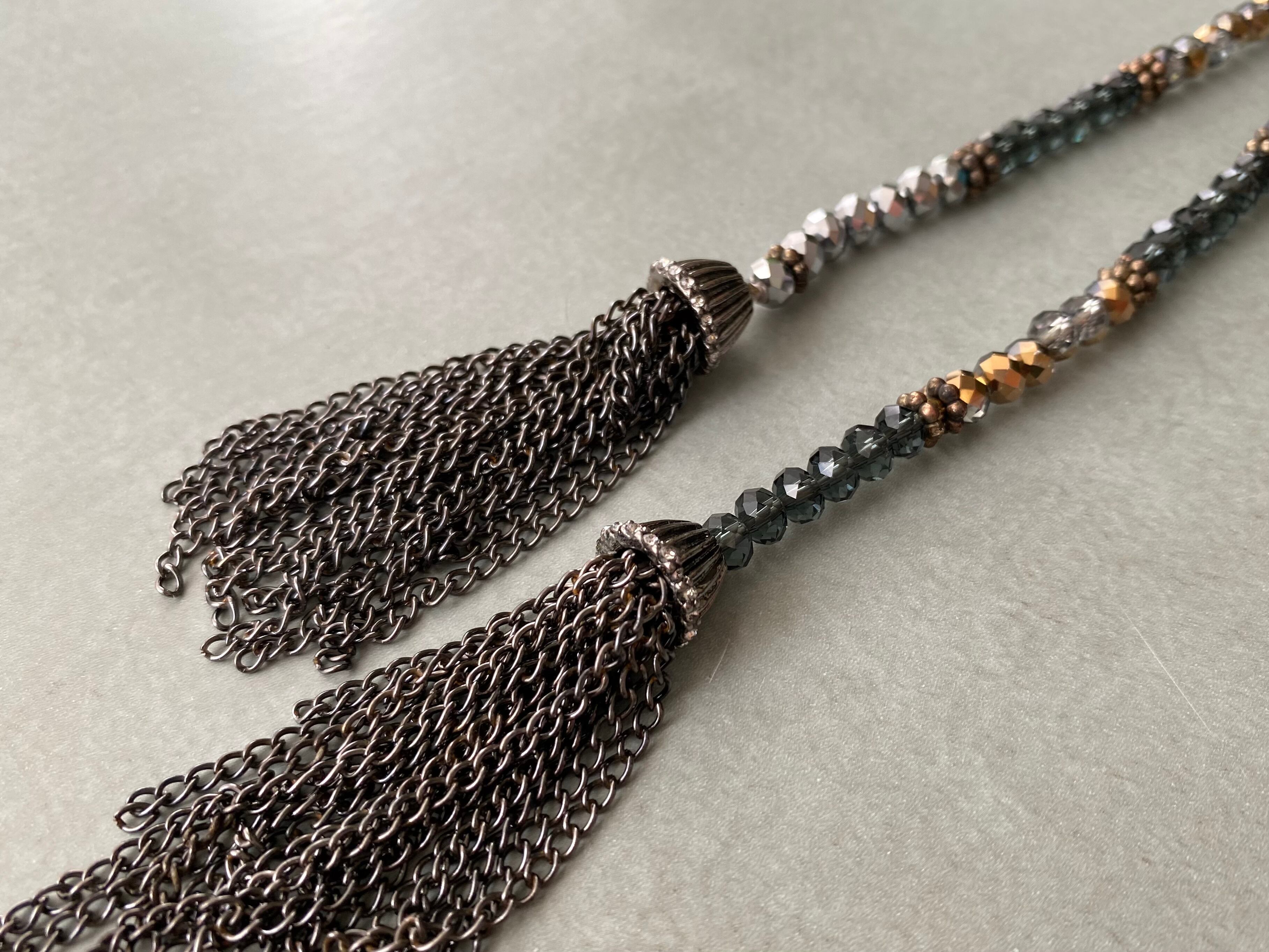 スタイリッシュな雰囲気のUSAユーズドラリエット。メタリックカラーのガラスビーズがキラキラと輝き先端にはチェーンのタッセルが揺らめきます。存在感がありコーディネートのアクセントに。クールな色合いがスタイリングにお洒落な雰囲気をプラスしてくれます。