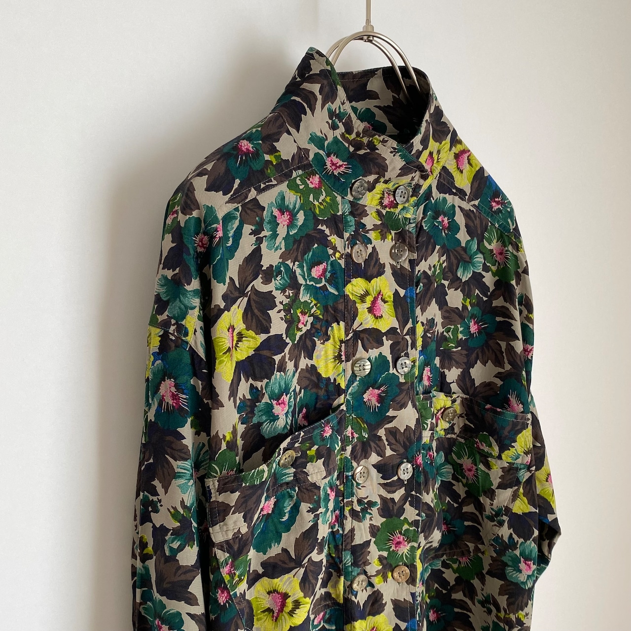西ドイツ製のヴィンテージ古着ブラウス。落ち着いた色合いのボタニカル模様がお洒落な雰囲気。薄手のサラッとした生地感でゆったりとした着心地。ボトムスにインしてもバランス良く着こなしていただけます。ボタンをあけてアウターがわりに羽織っていただくのもおすすめです。