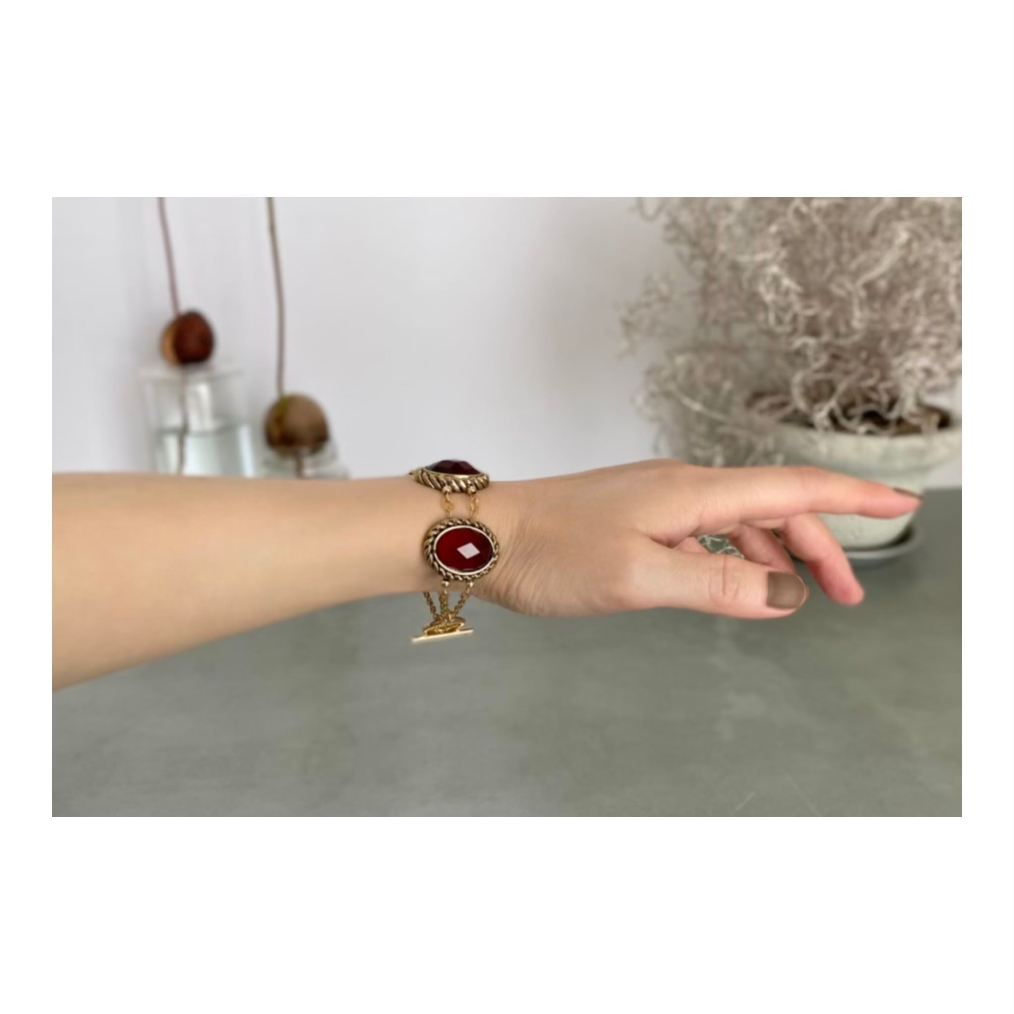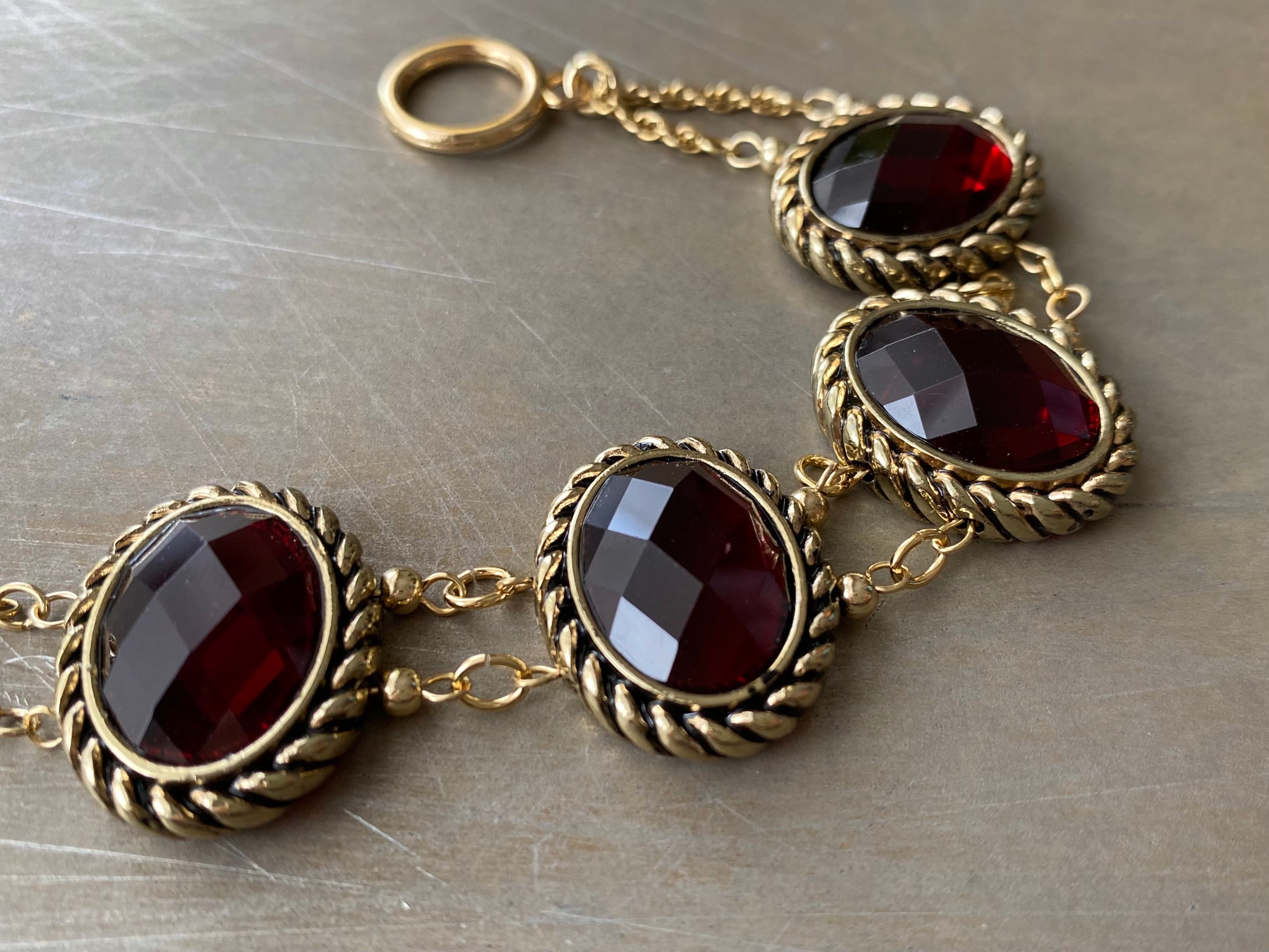 ルビーのような赤いクリスタルが輝くクラシカルな雰囲気のUSAヴィンテージブレスレット。大きなビジューが贅沢に使われた存在感のあるデザイン。大人の古着スタイルにおすすめのアイテムです。