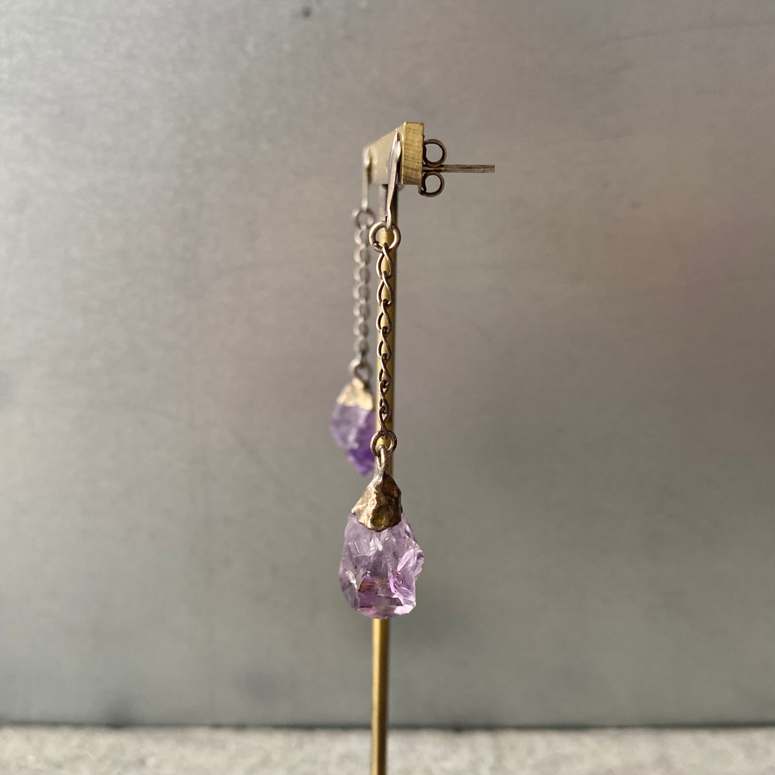 ラフカットのアメジストが揺らめくUSAヴィンテージピアス。2月の誕生石「アメジスト」は、持つ人に安らぎと癒しをもたらすと言い伝えられています。シンプルなデザインと身につけやすいサイズ感で様々なコーディネートに合わせていただけます。