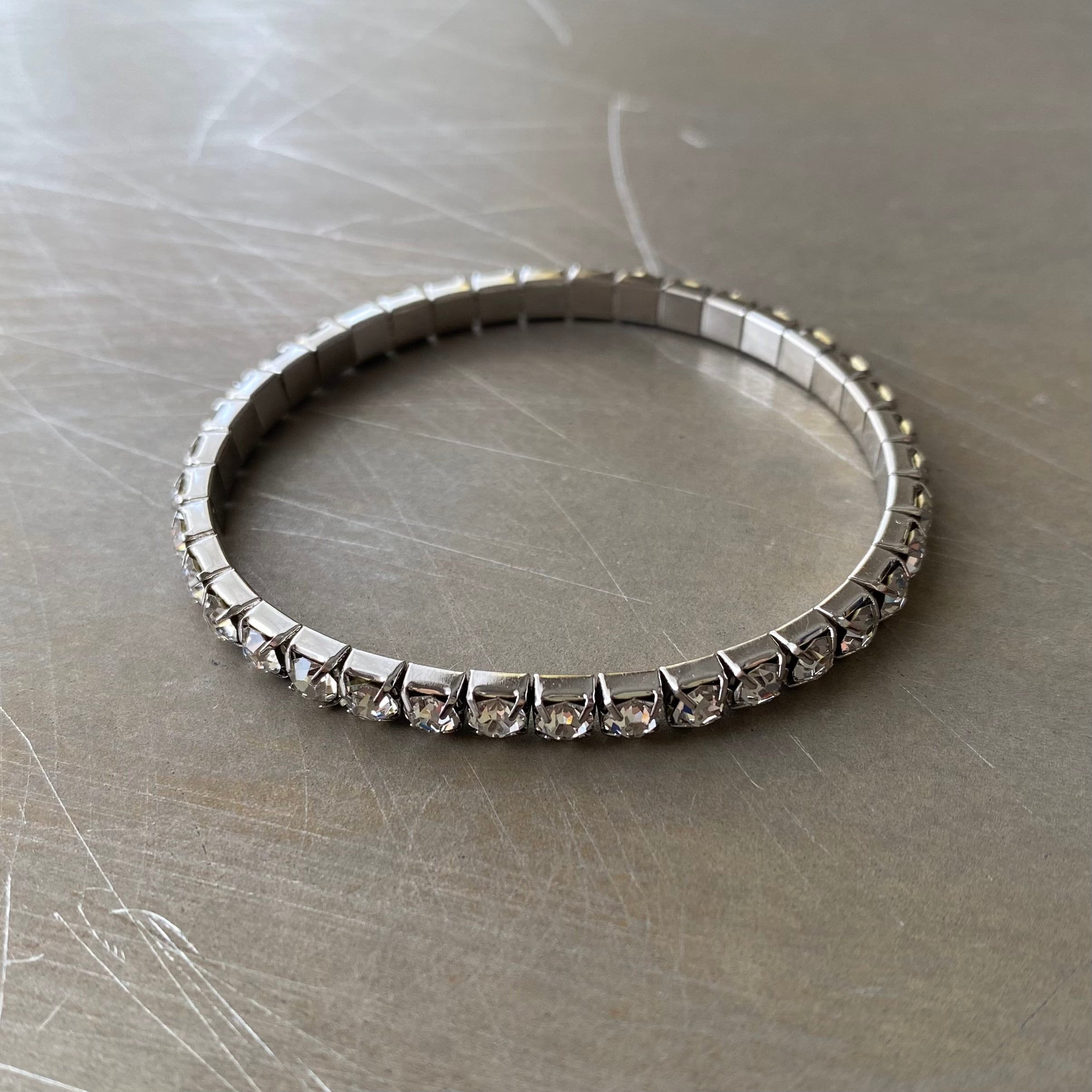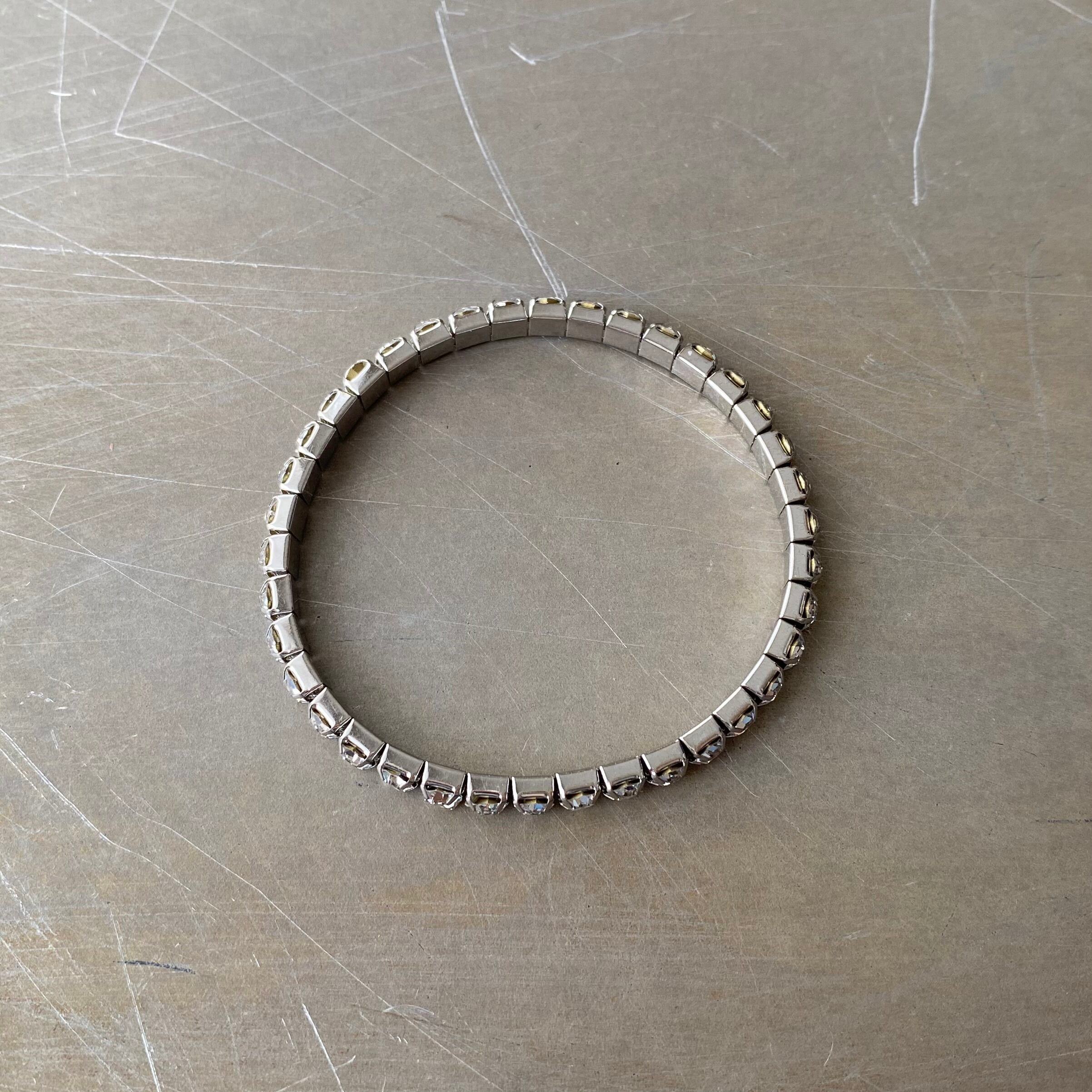 キラキラと輝くラインストーンのUSAヴィンテージブレスレット。着脱のしやすいストレッチタイプです。シンプルなデザインで身につけやすく様々なスタイルに合わせていただけます。