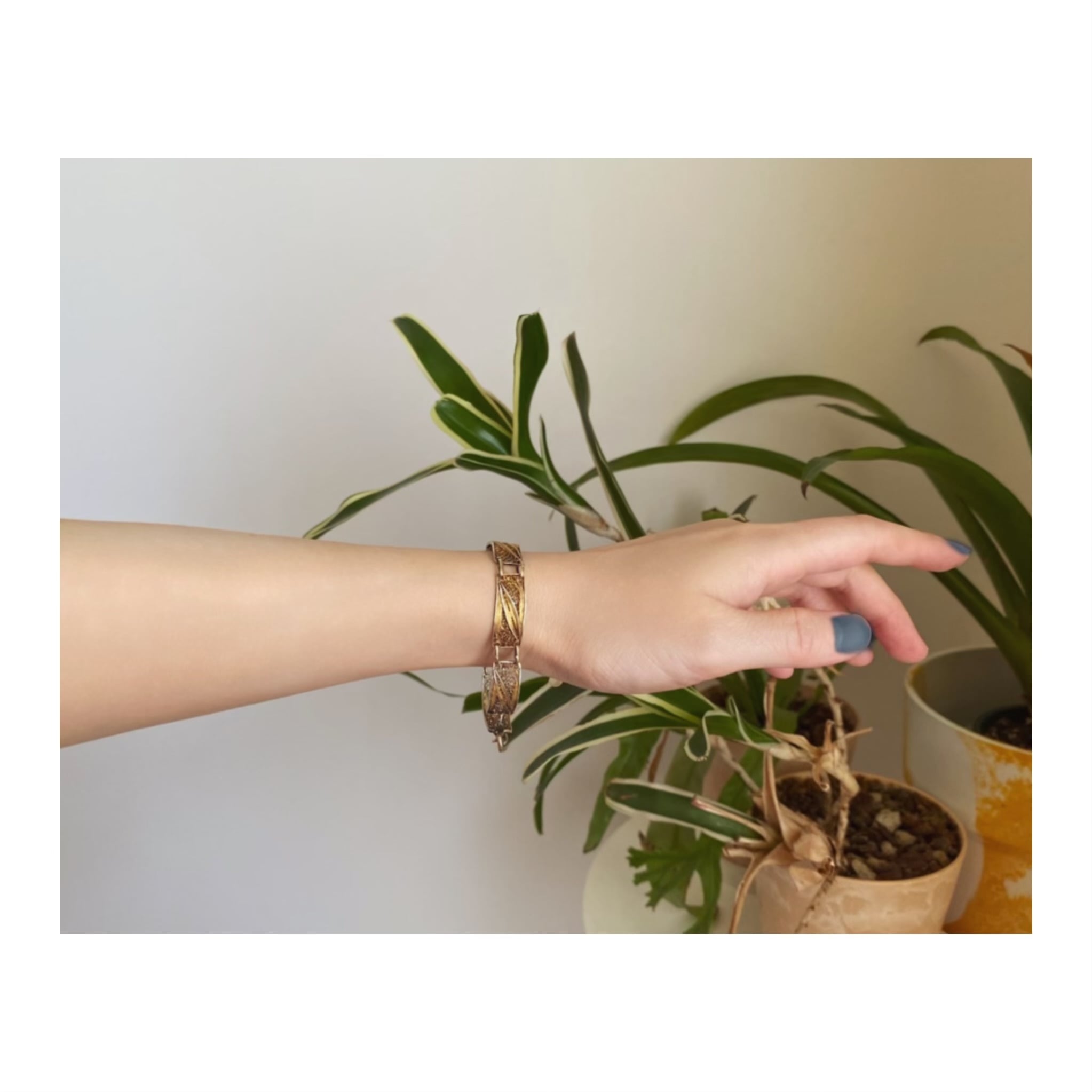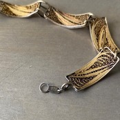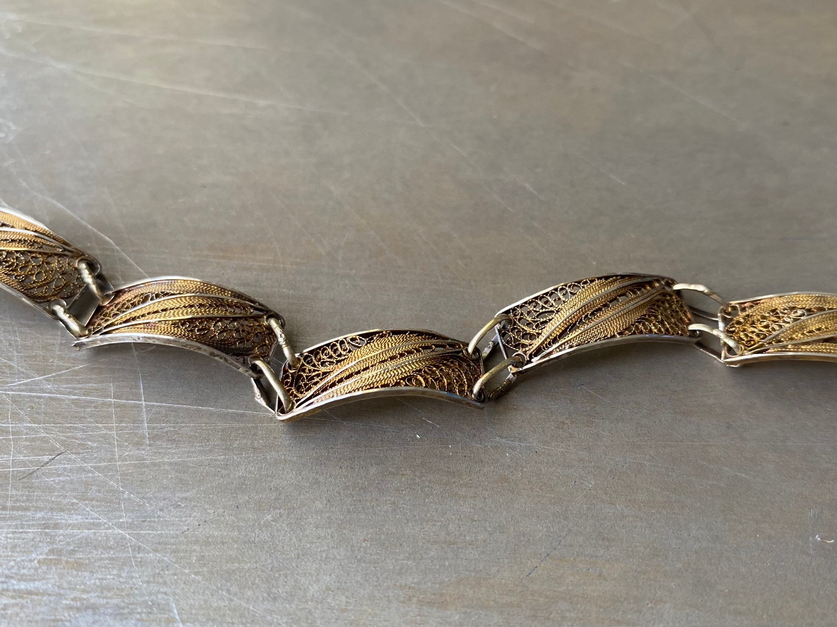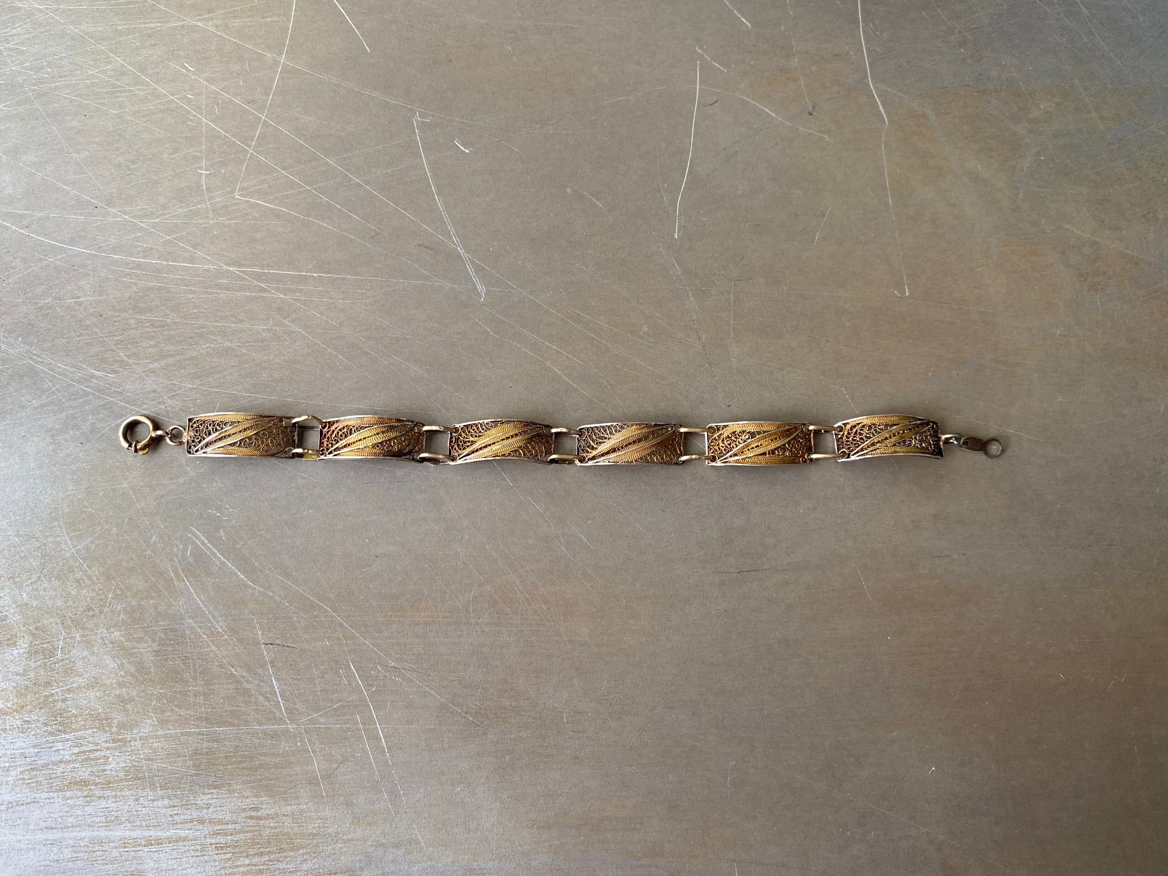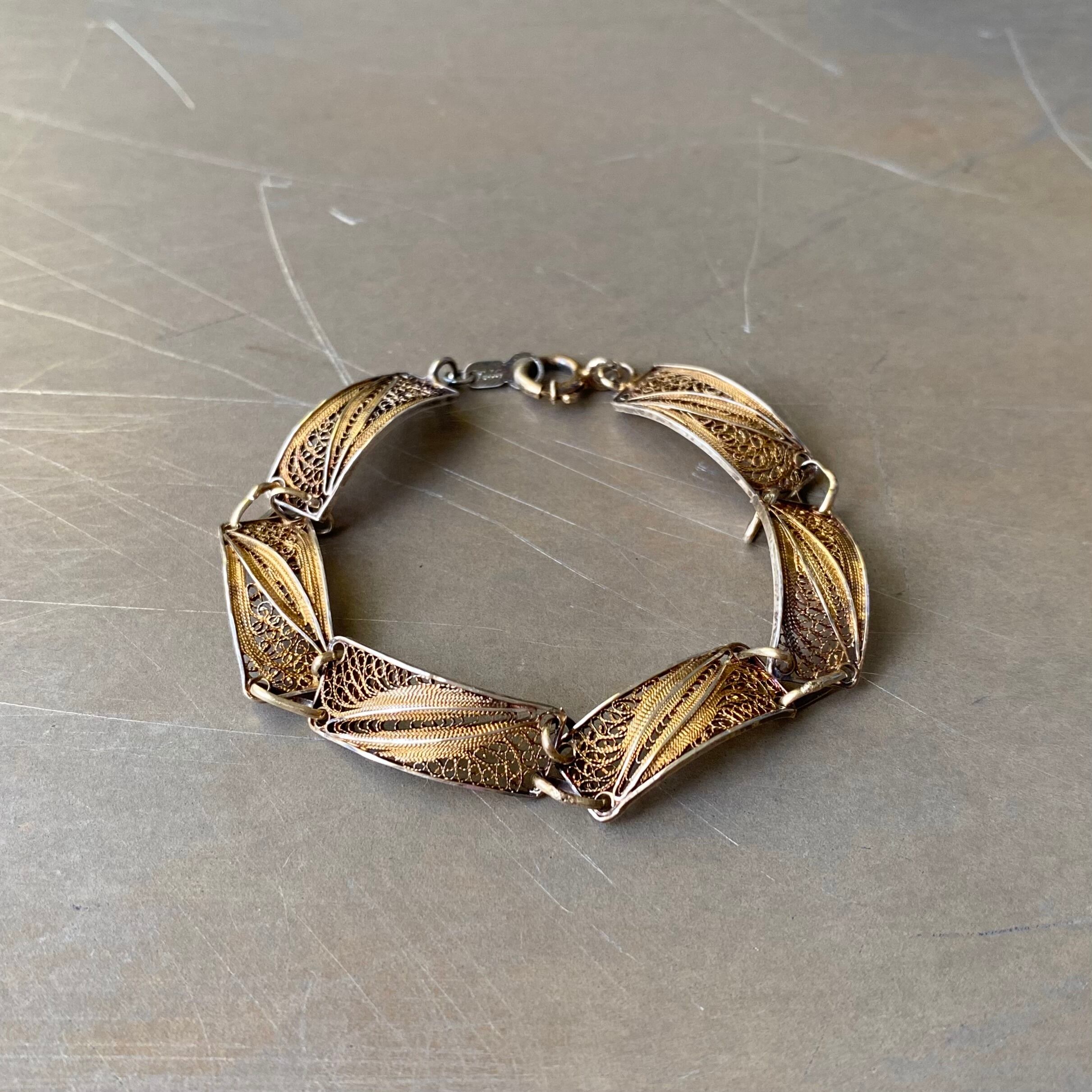 クラシカルな銀線細工のUSAヴィンテージブレスレット。「フィリグラーナ」技法による銀線で表現された繊細で軽やかな作りが魅力的です。古びた色合いもヴィンテージ感があり良い雰囲気。大人の古着スタイルにおすすめのアイテムです。