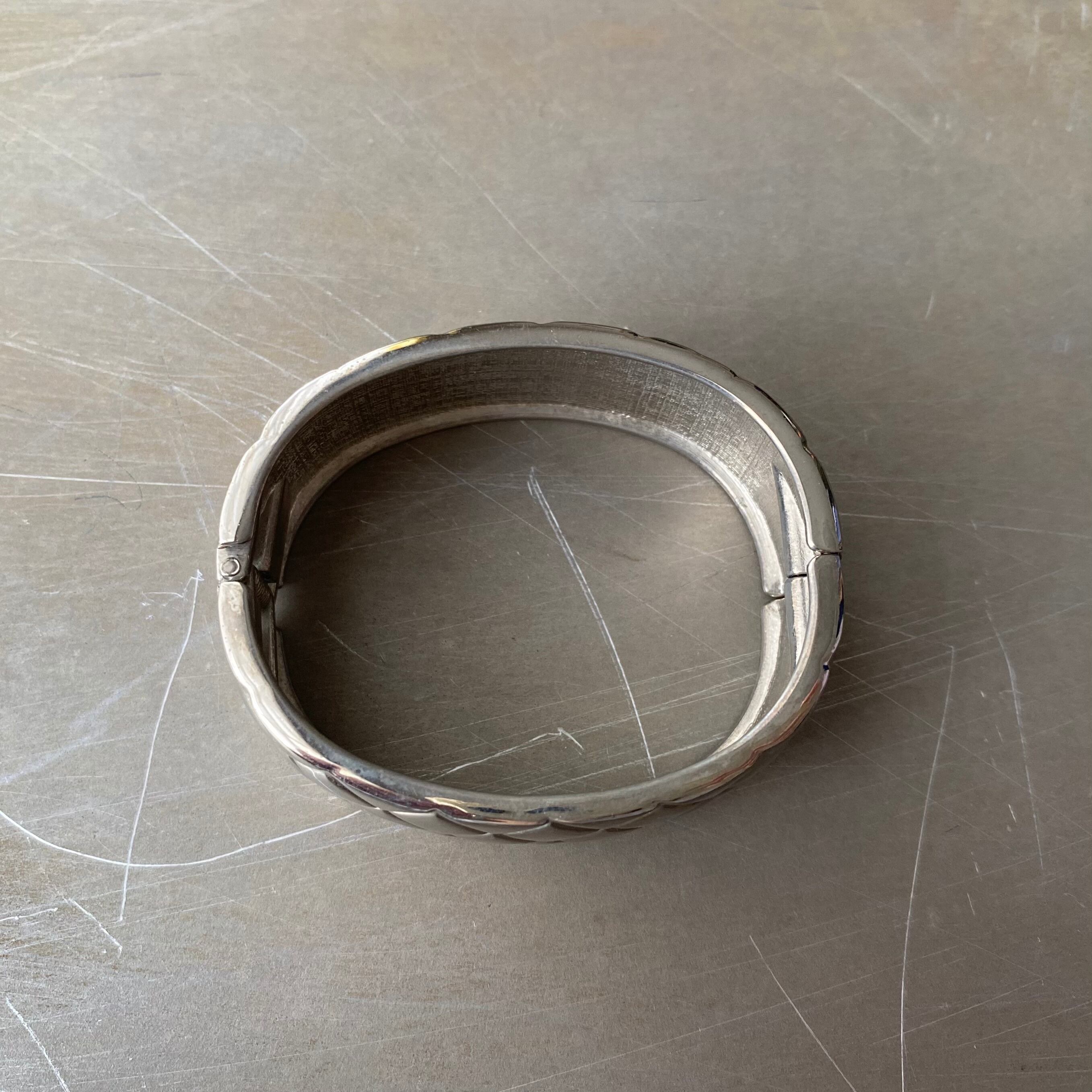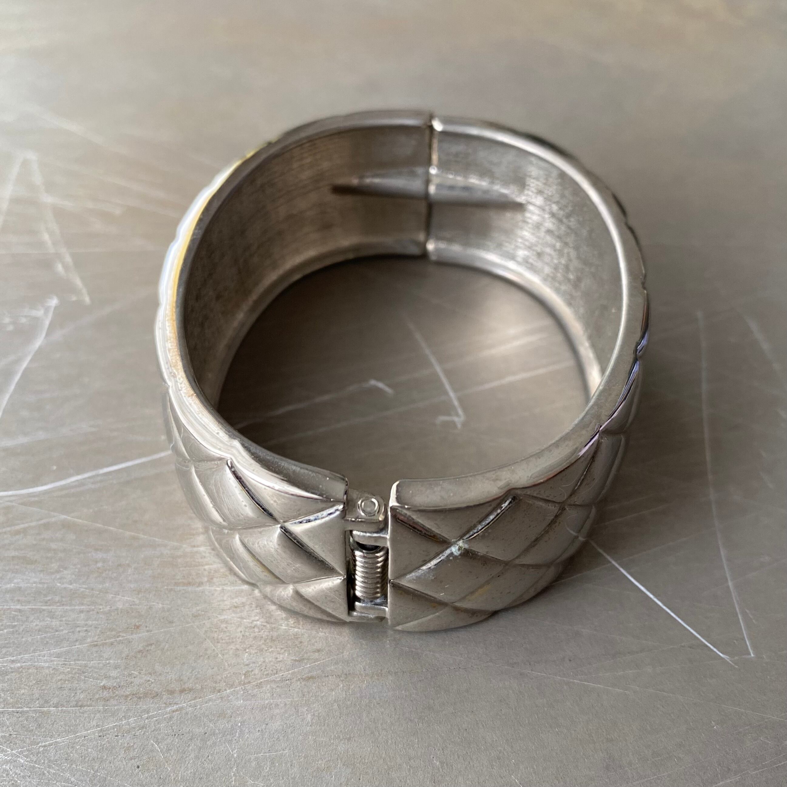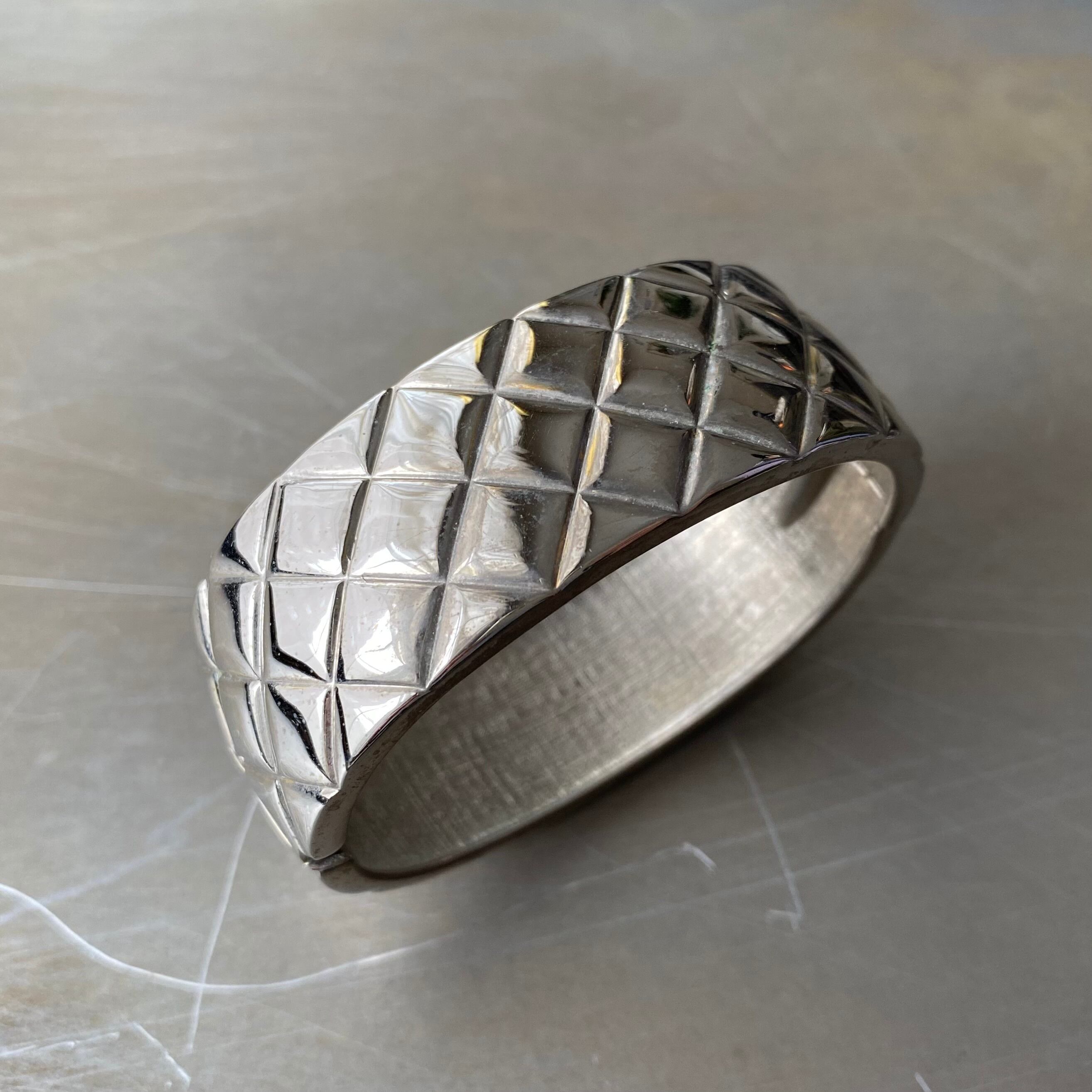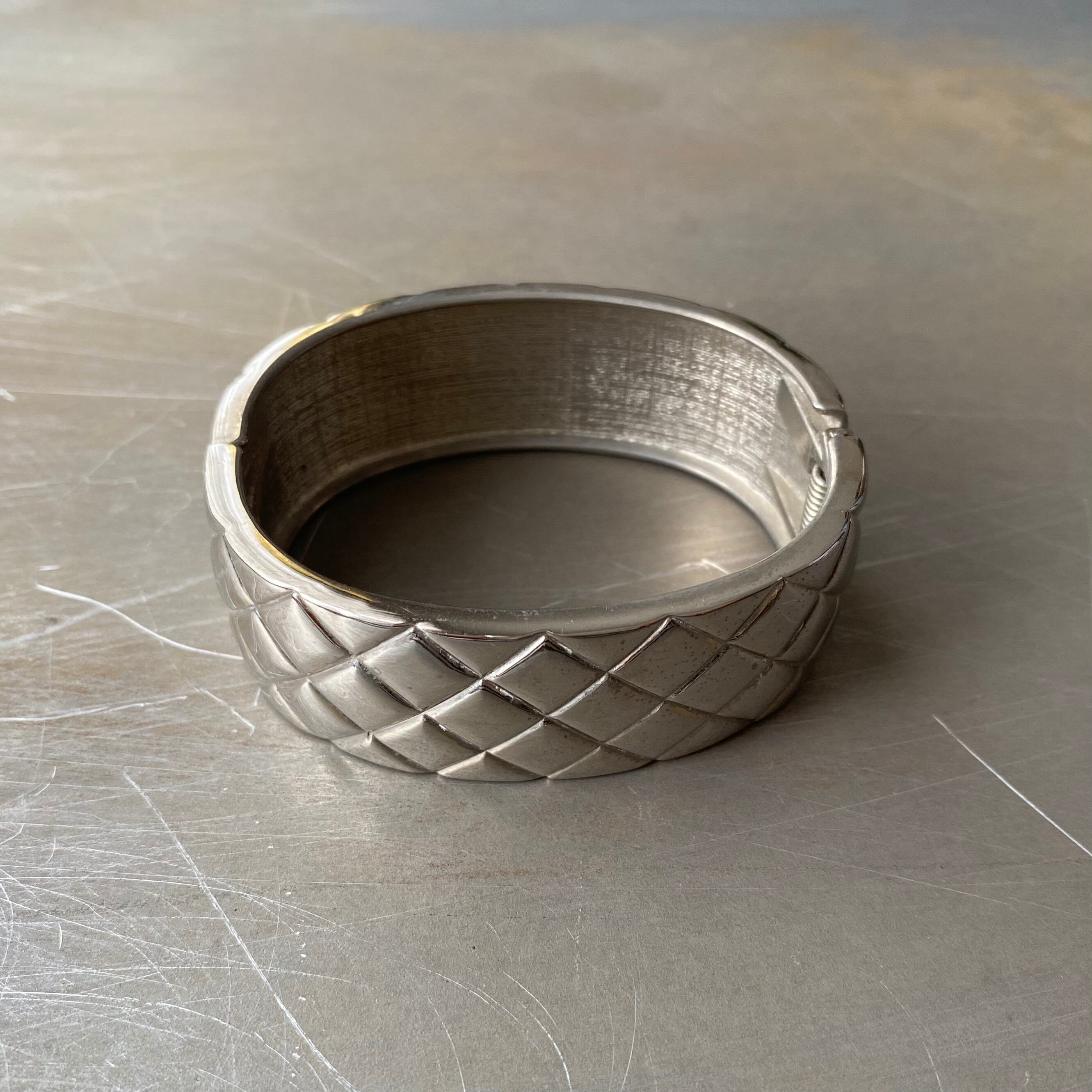 キルティング風のデザインがお洒落なUSAヴィンテージバングル。サイドがオープンする着脱のしやすい作りです。存在感のある幅広タイプでコーディネートのアクセントにおすすめです。