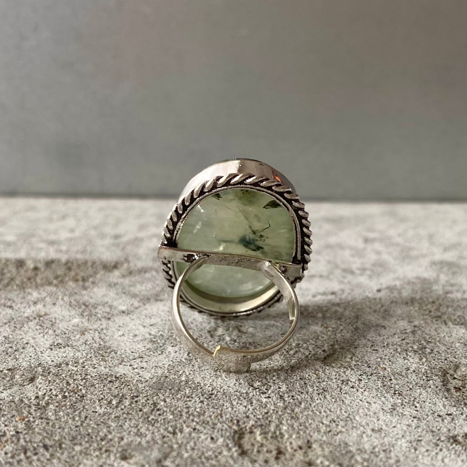 透明感のある柔らかなグリーンの色味が魅力的な天然石リング。「プレナイト」は「癒しの石」と言われ、ストレスをやわらげ心を穏やかにし、持ち主にとって不要なものを手放させるストーンと言い伝えられています。大ぶりで存在感がありコーディネートのアクセントにおすすめです。