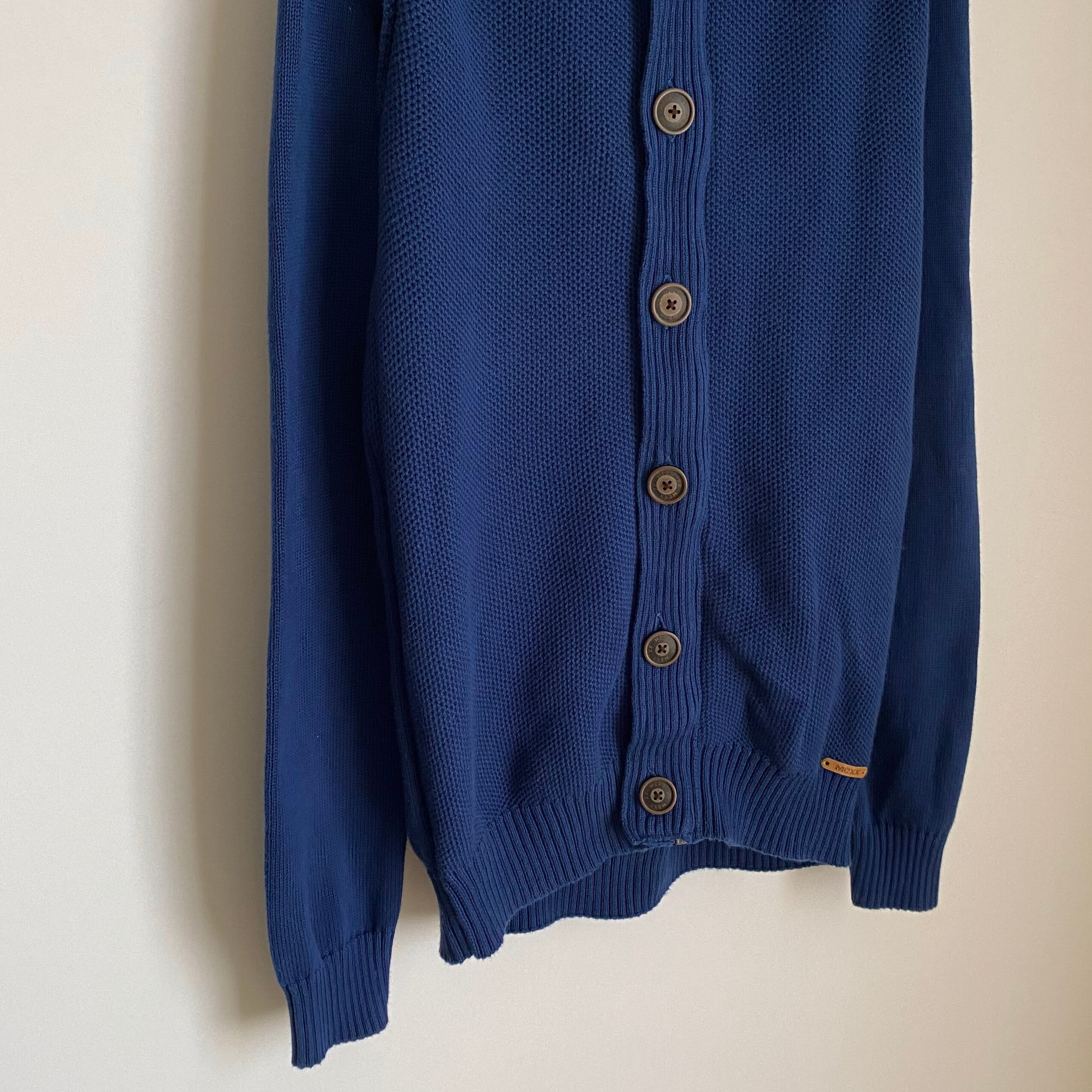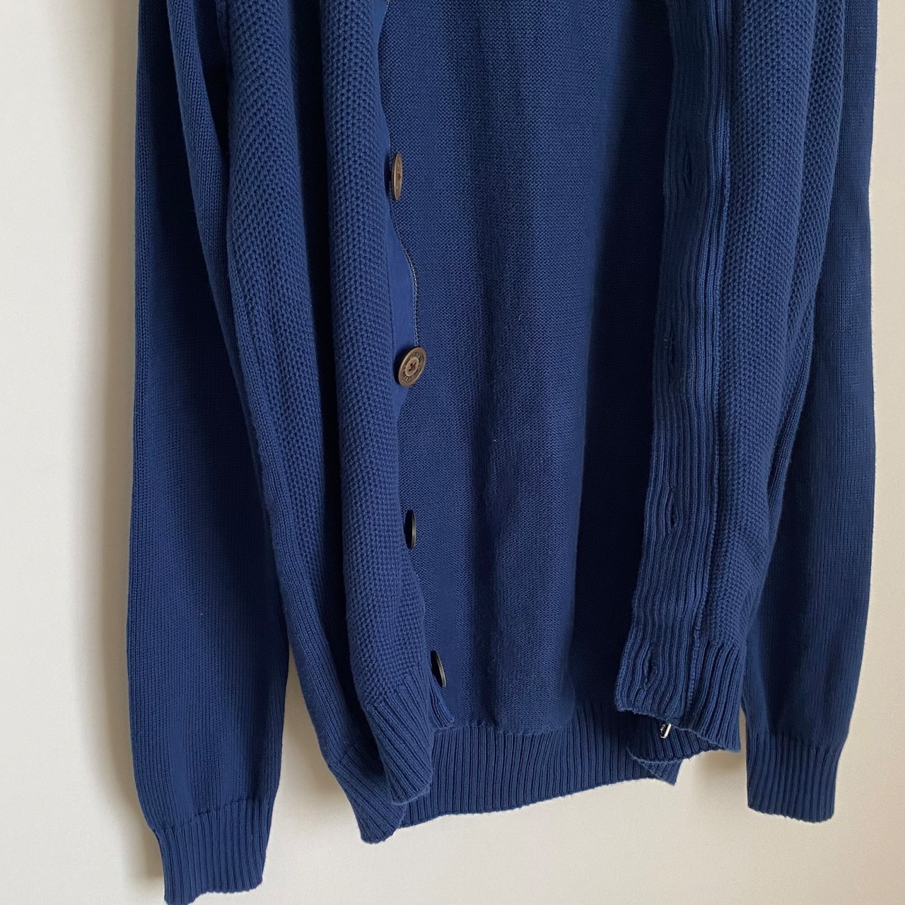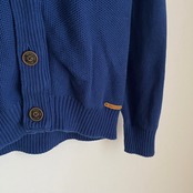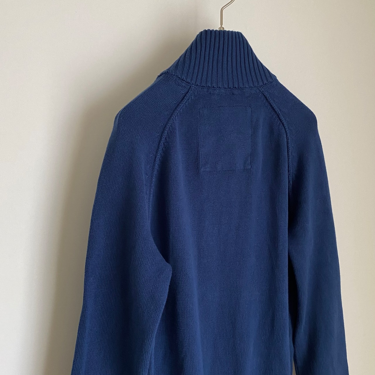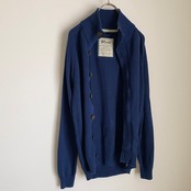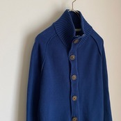 ダークブルーの色合いがお洒落なUSAヴィンテージ古着ニットカーディガン。ジップアップ仕様で大きめのボタンがポイント。暖かみのある綿100%のニット素材でほどよくゆとりのあるシルエットです。肌寒い日にアウター代わりに羽織っていただくのもオススメです。