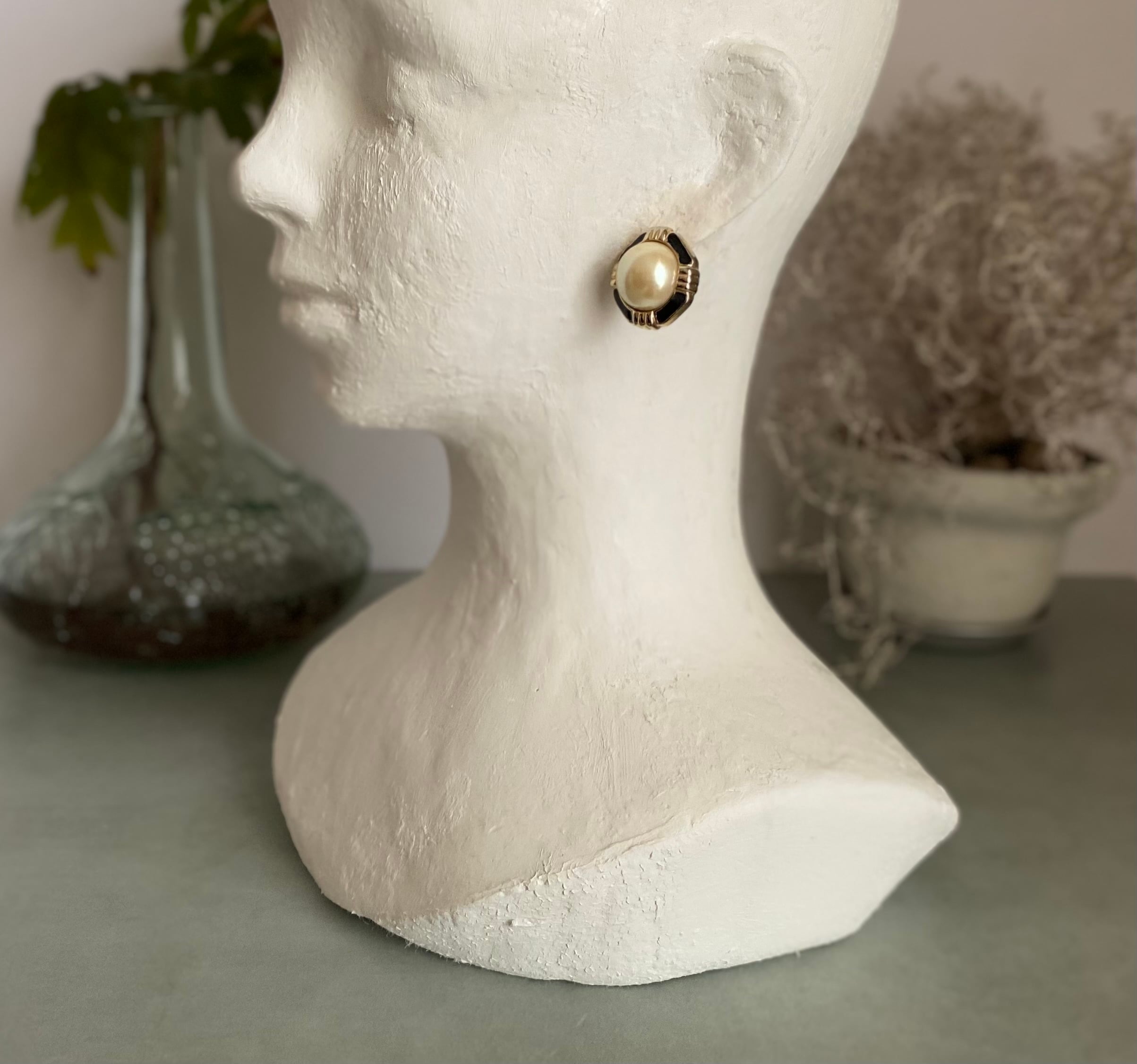 大きなパールと上品なエナメルが美しいUSAヴィンテージピアス。重厚感のあるしっかりとした作りでクラシカルな雰囲気。存在感がありレトロスタイルのワンポイントにおすすめです。