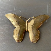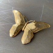 レトロ可愛い蝶々のUSAヴィンテージブローチ。大きな羽にはドット模様が浮かび上がる素敵なデザイン。古びたメタルの色合いもヴィンテージ感があり良い雰囲気。軽やかな作りでジャケットやストール等のアクセントにおすすめです。