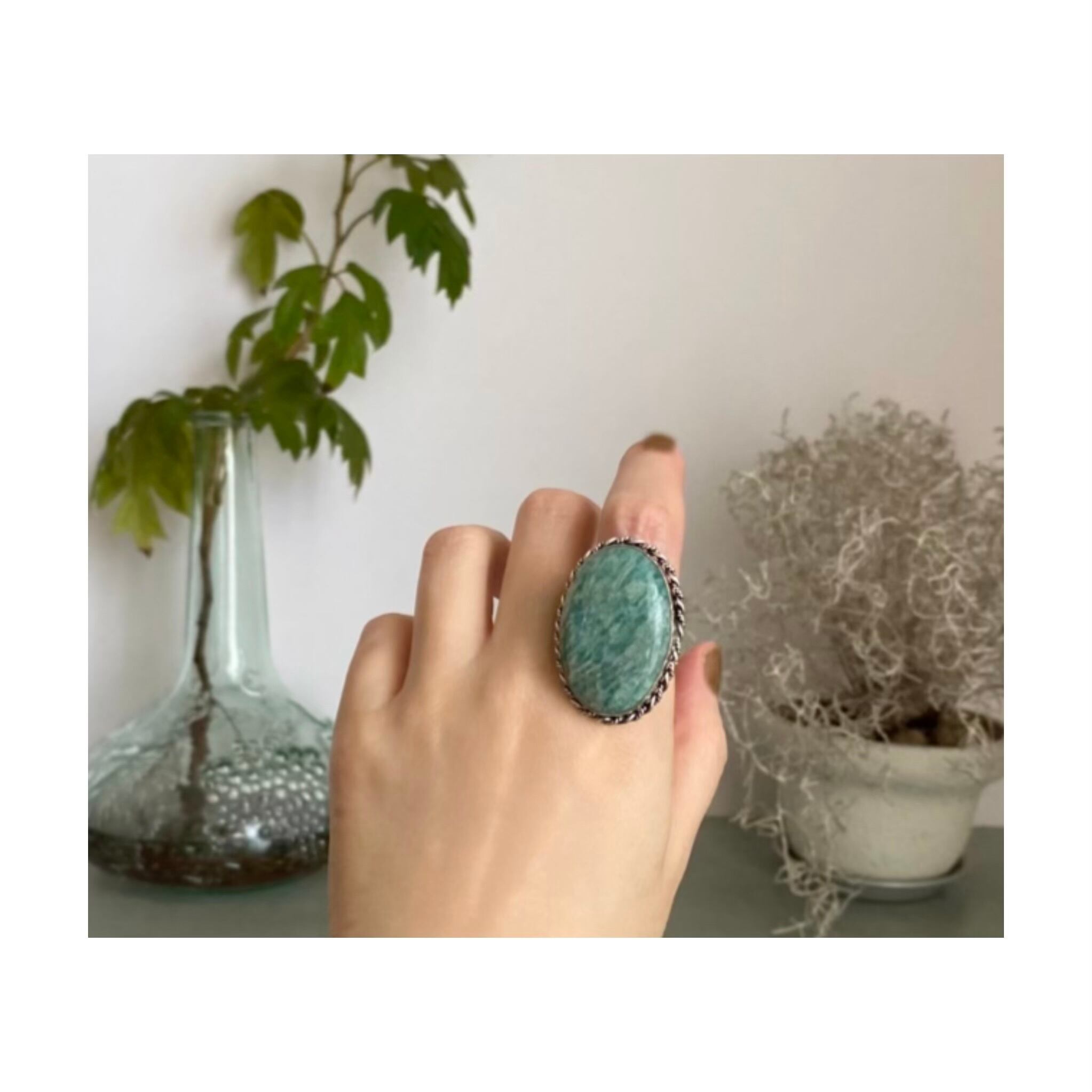 独特の模様と美しい色合いが魅力的な天然石リング。大きなストーンを引き立たせるクラシカルでシンプルな石座のデザインです。「アマゾナイト」は「希望の石」と言われ、持ち主の心と身体のバランスを整え、夢を叶える為のサポートをしてくれると言い伝えられています。大ぶりで存在感がありコーディネートを明るい雰囲気に。古着スタイルにもおすすめです。
