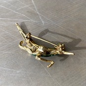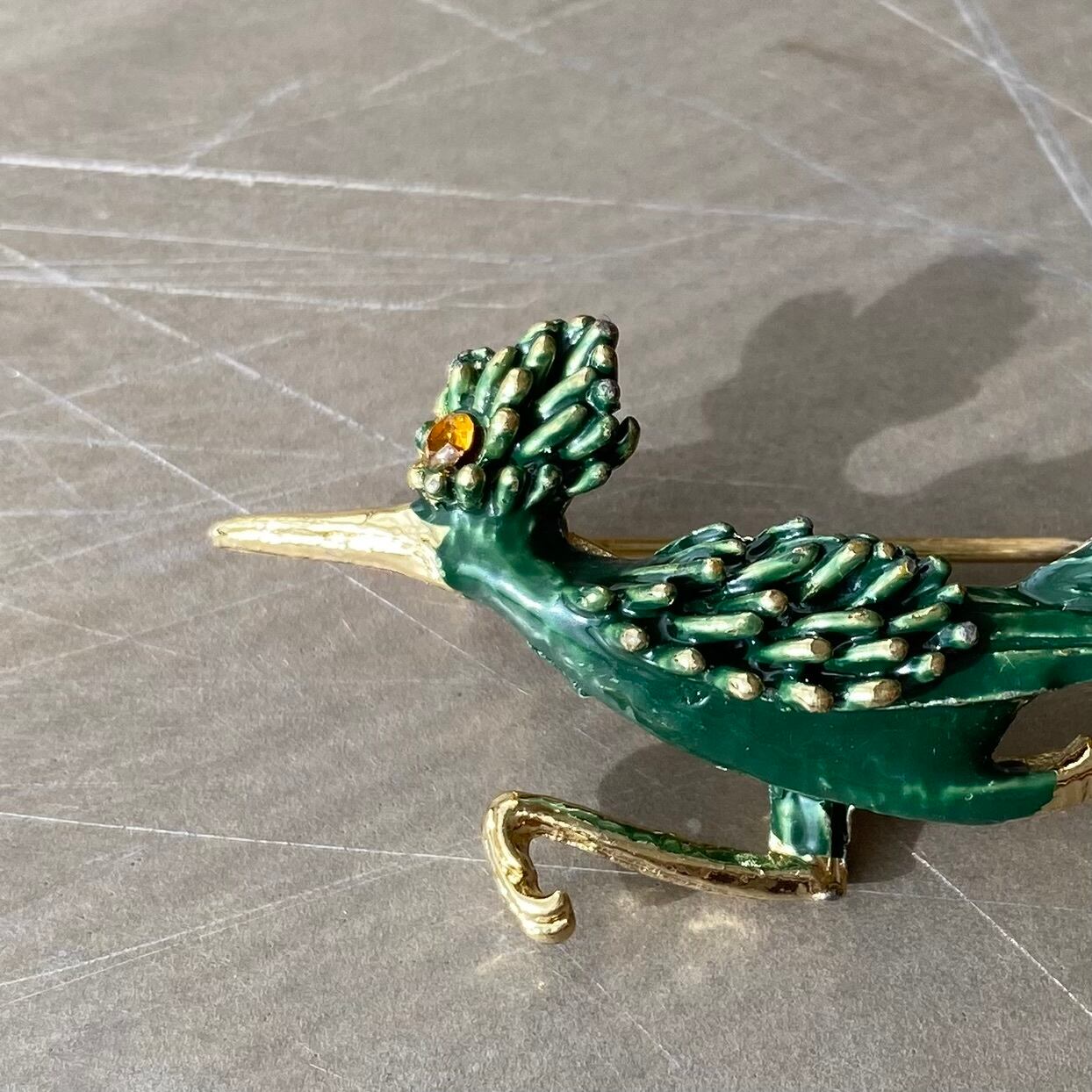 大地を駆け抜けるロードランナーバードのUSAヴィンテージブローチ。緑色のエナメルにオレンジ色の瞳がキラキラと輝きます。小ぶりで身につけやすいサイズ感です。
