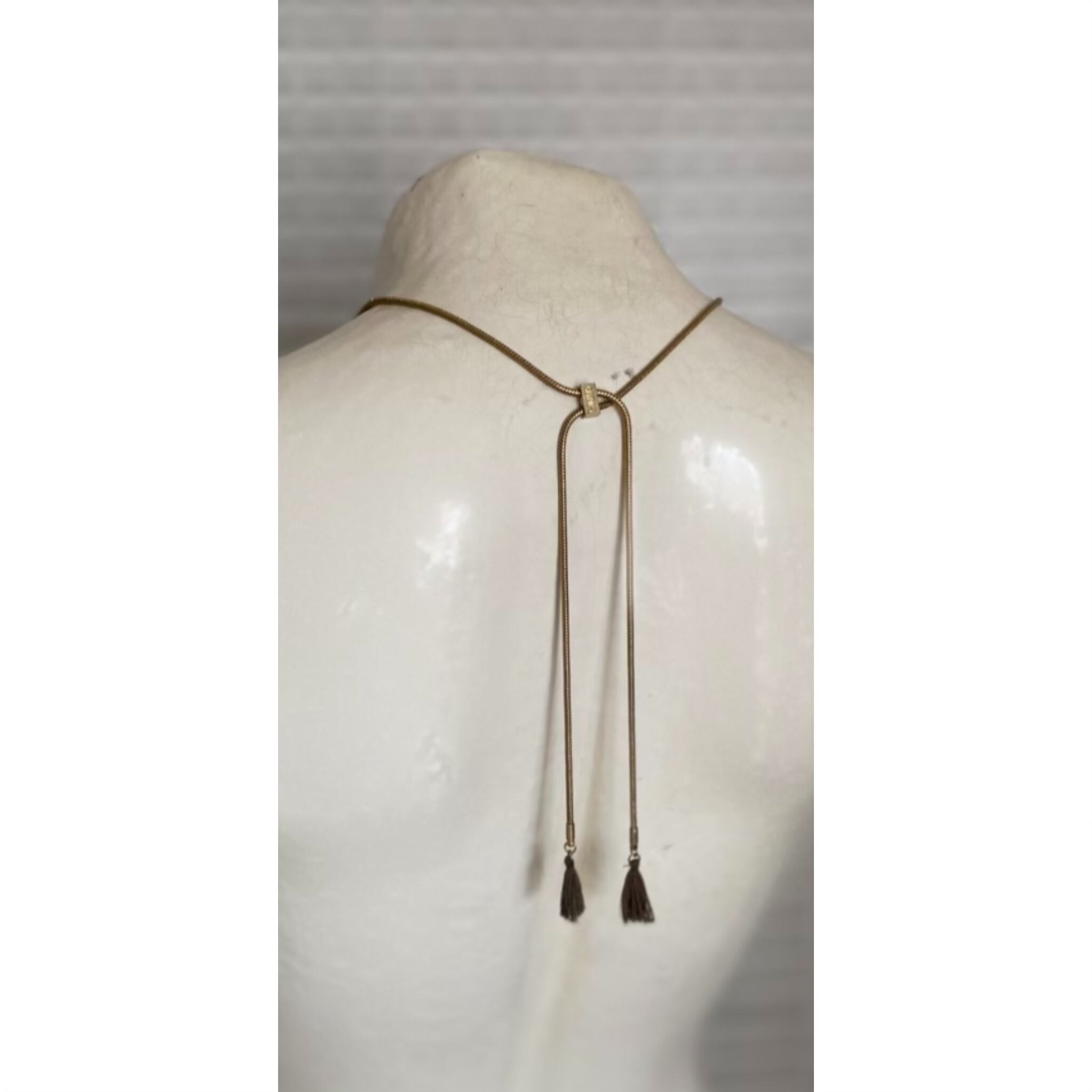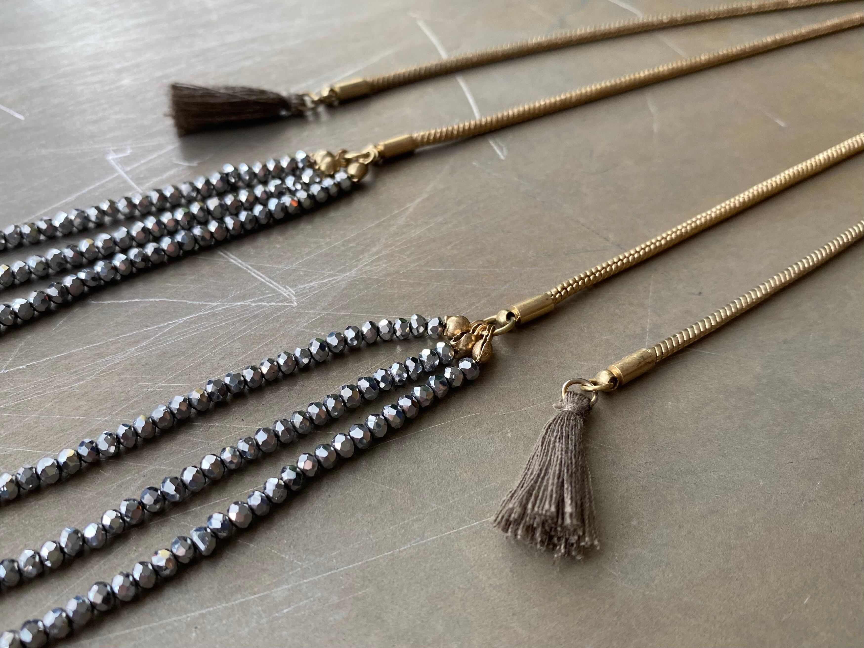 メタルビーズがキラキラと輝くスタイリッシュな雰囲気のUSAユーズドネックレス。チェーンを左右に引っ張るとお好きな長さに調整出来るアジャスタブルな作りです。チェーンの先端にはタッセルが揺らめきバックスタイルまでお洒落に演出してくれます。