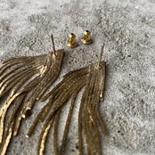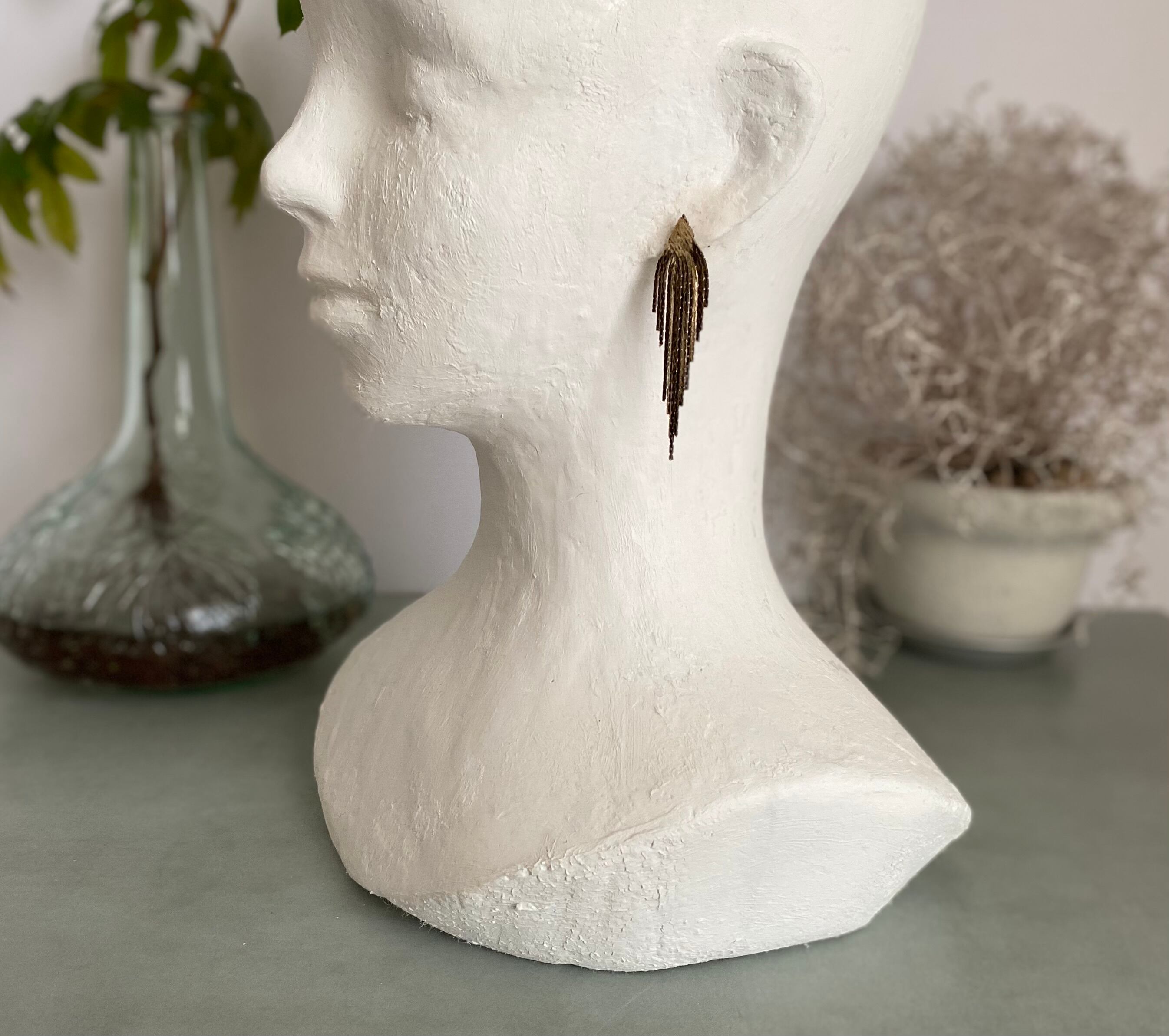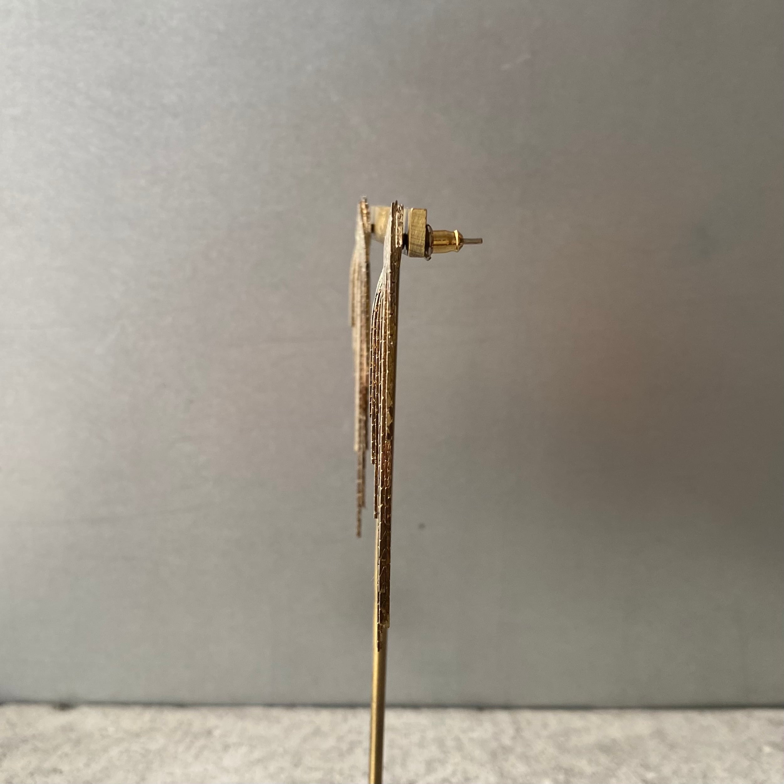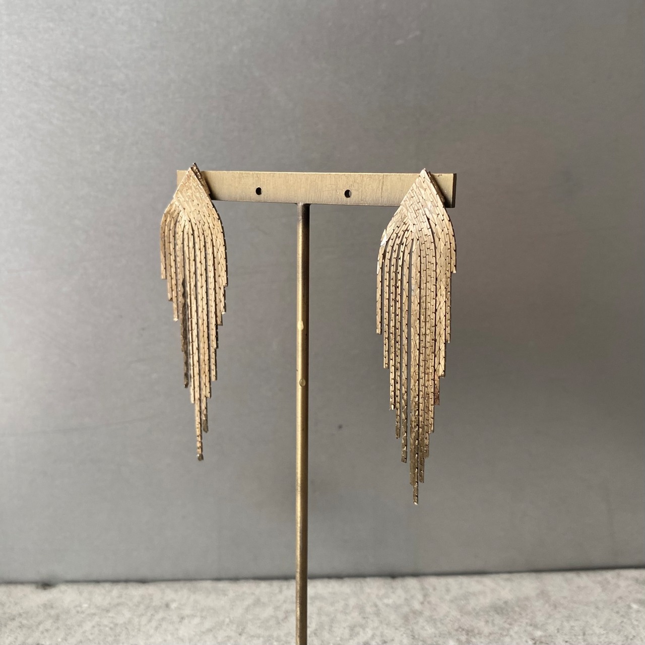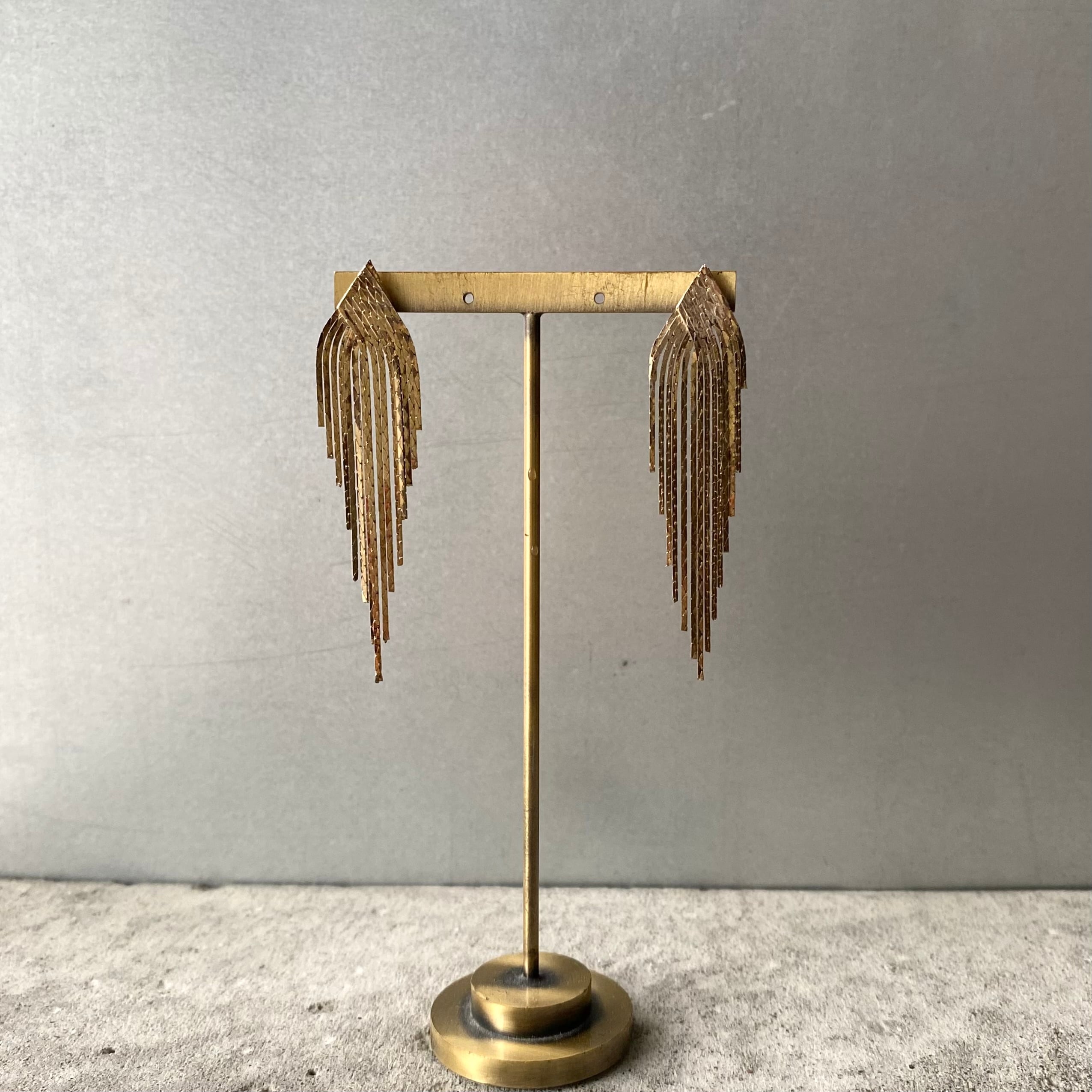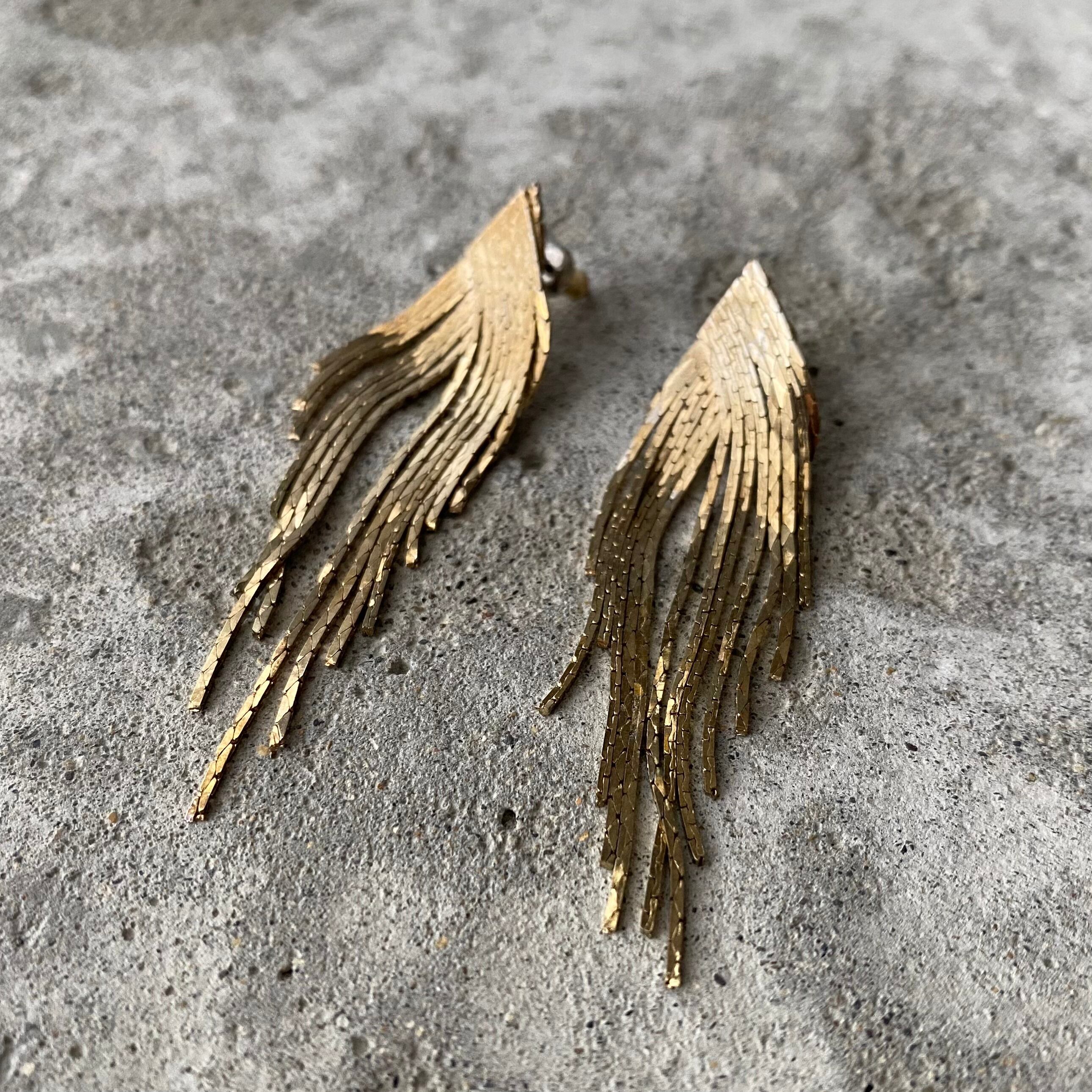チェーンで作られたフリンジが揺らめくスタイリッシュなデザインのUSAヴィンテージピアス。ゴールドとシルバーの間のような古びた色合いが魅力的。軽やかな着け心地でスタイリングにお洒落な雰囲気をプラスしてくれます。