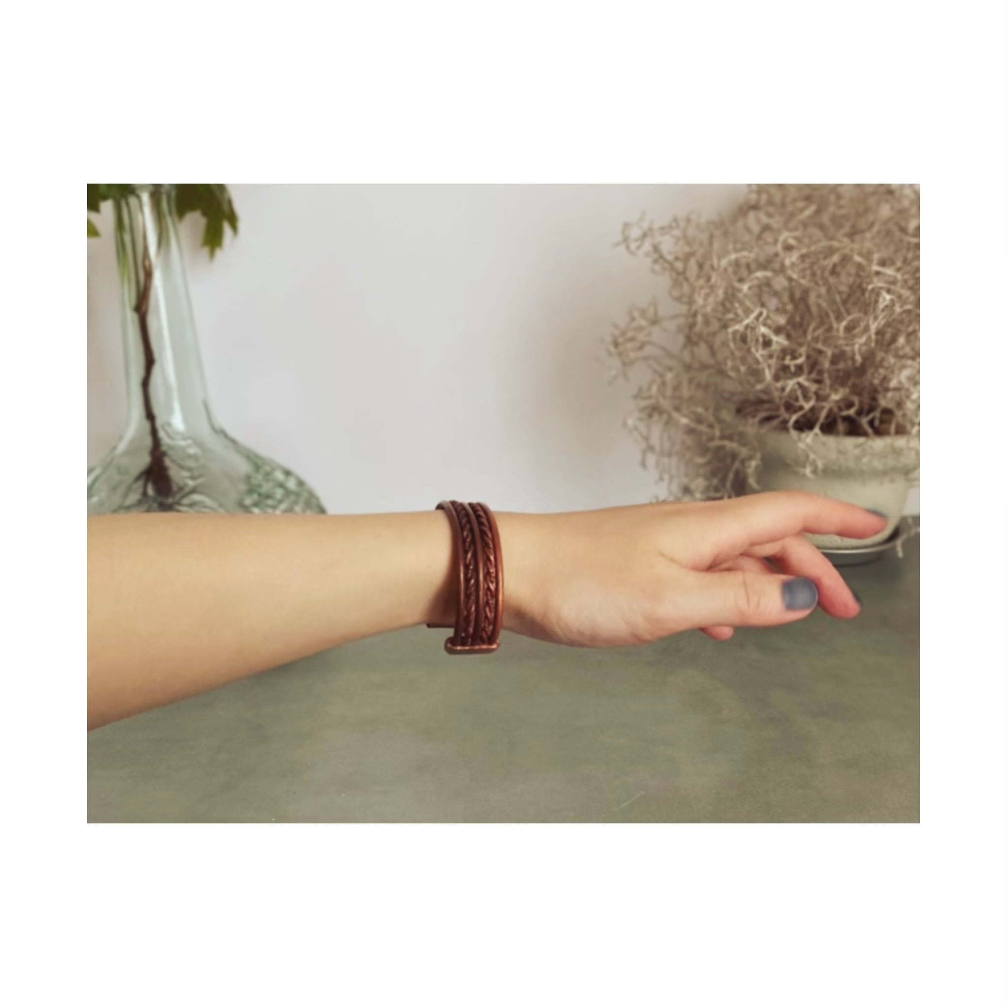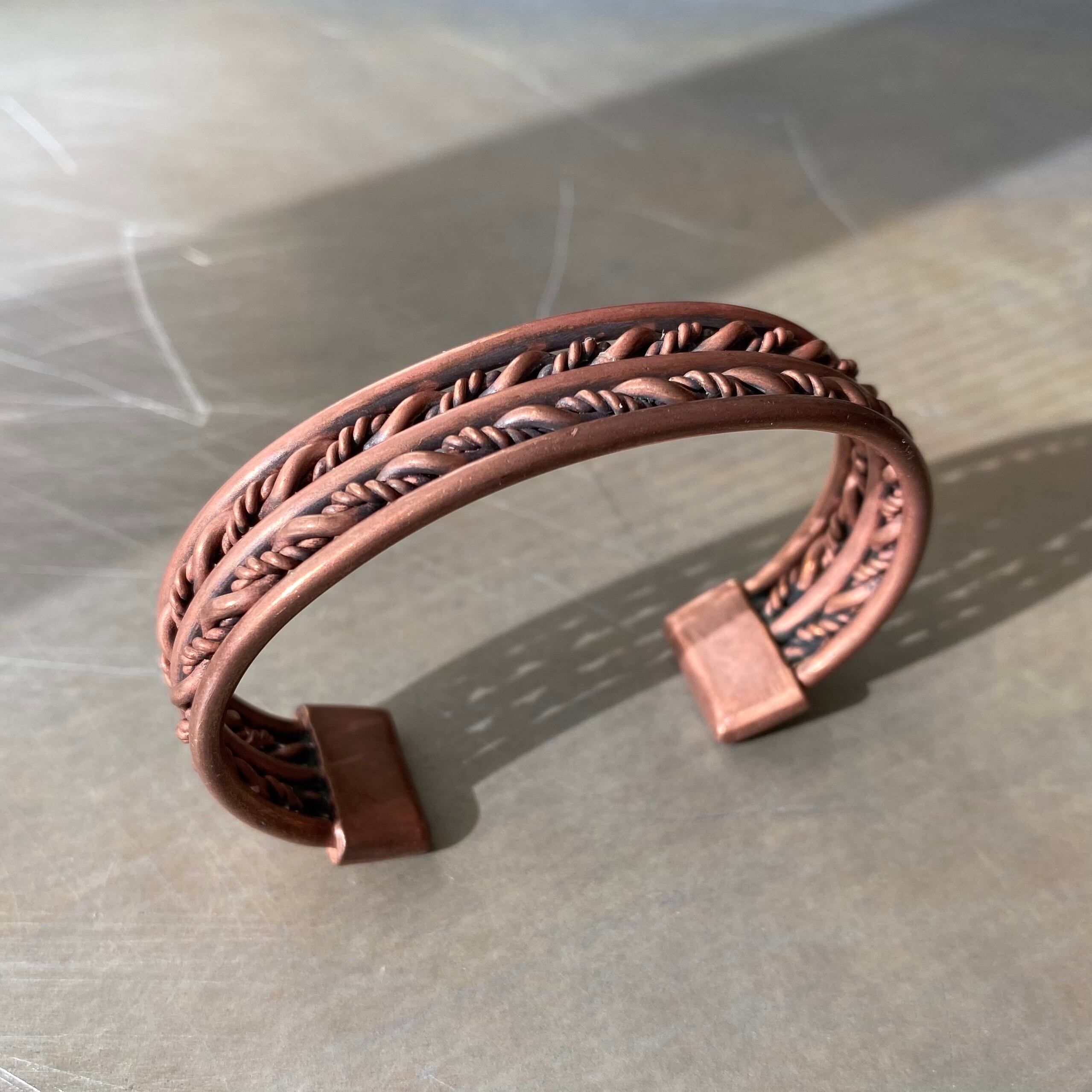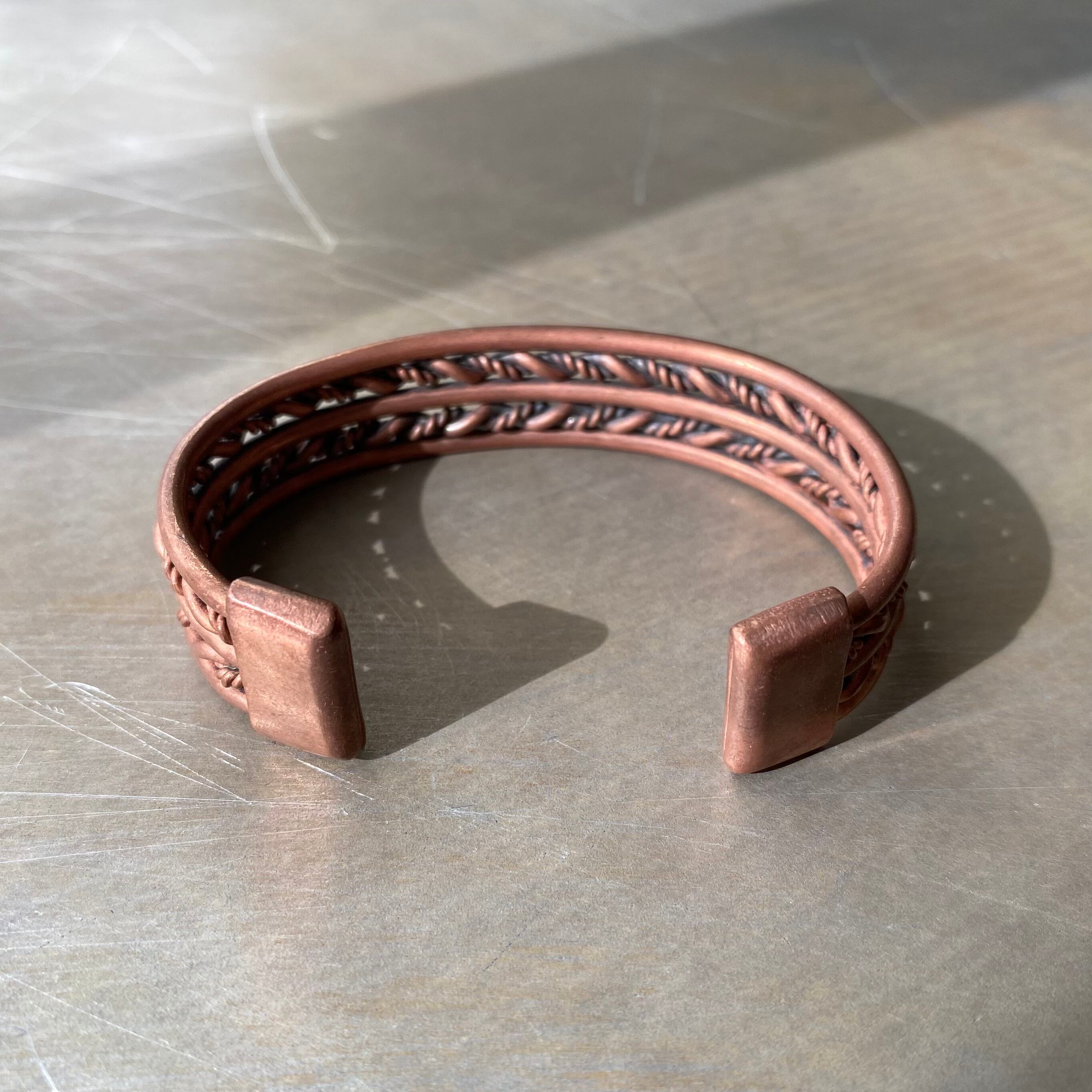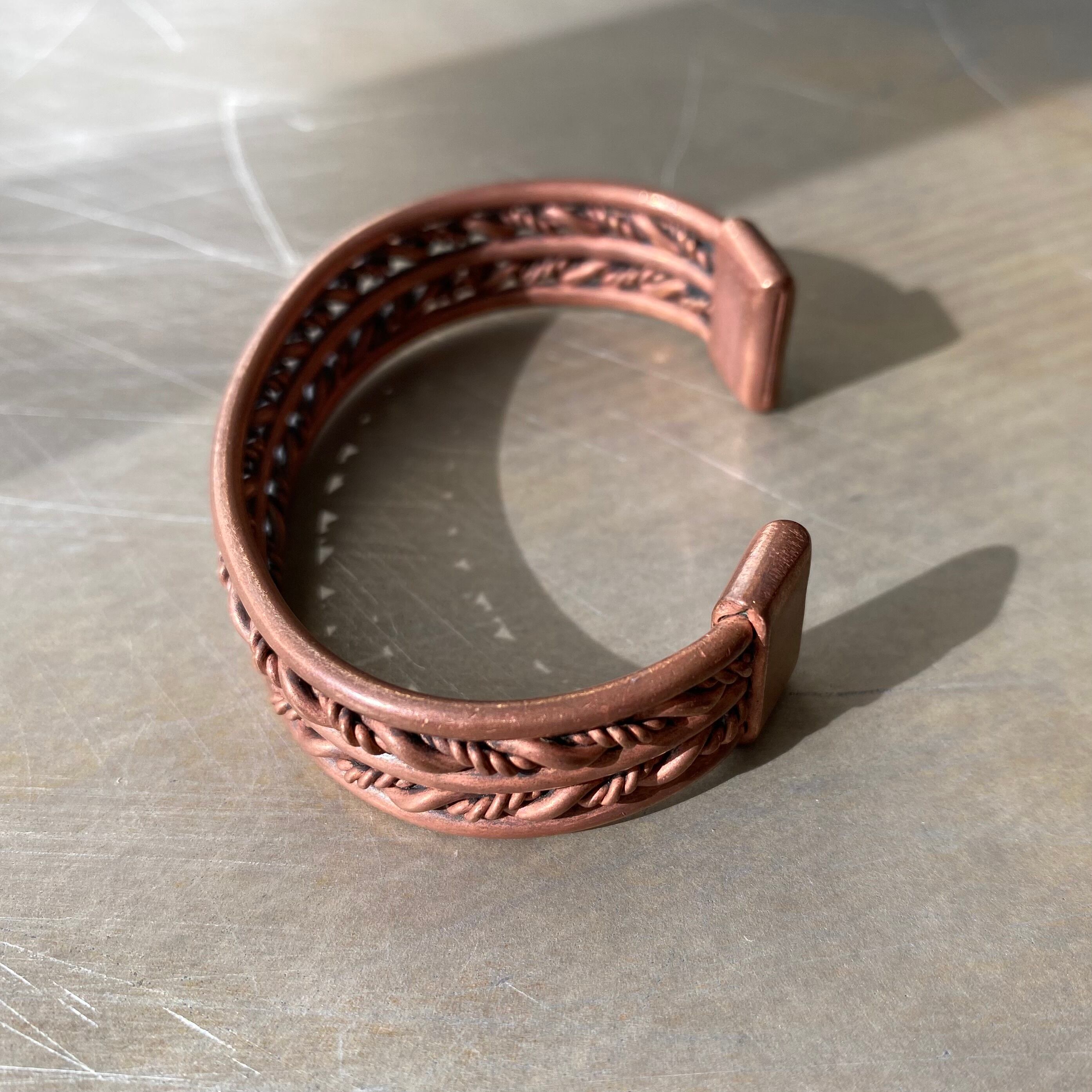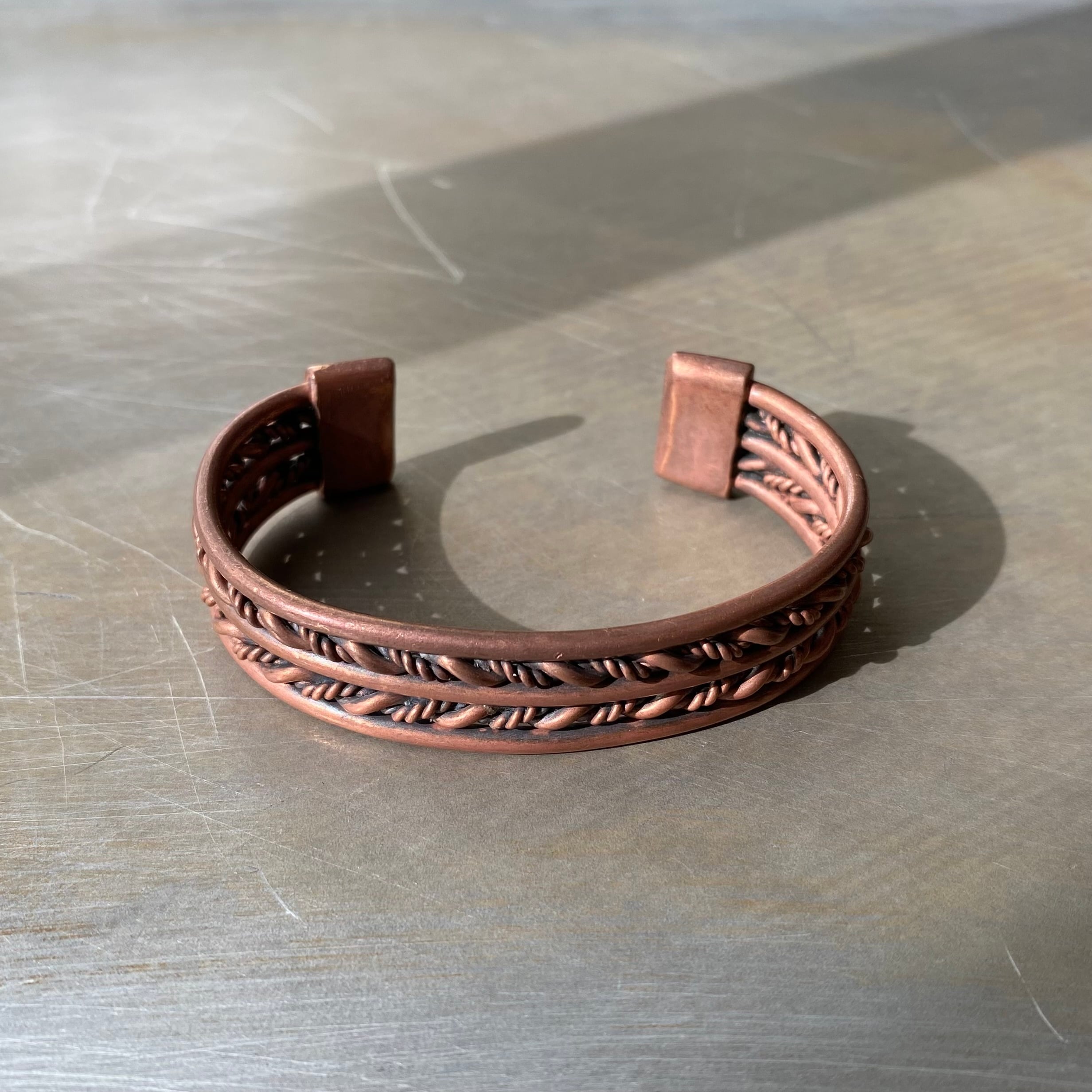 メタルワイヤーをツイストして作られたクラフト感のあるUSAヴィンテージバングル。重厚感のあるしっかりとした作りで古びた銅の色味もレトロな雰囲気。シンプルながら存在感があり古着など様々なスタイルに合わせていただけます。