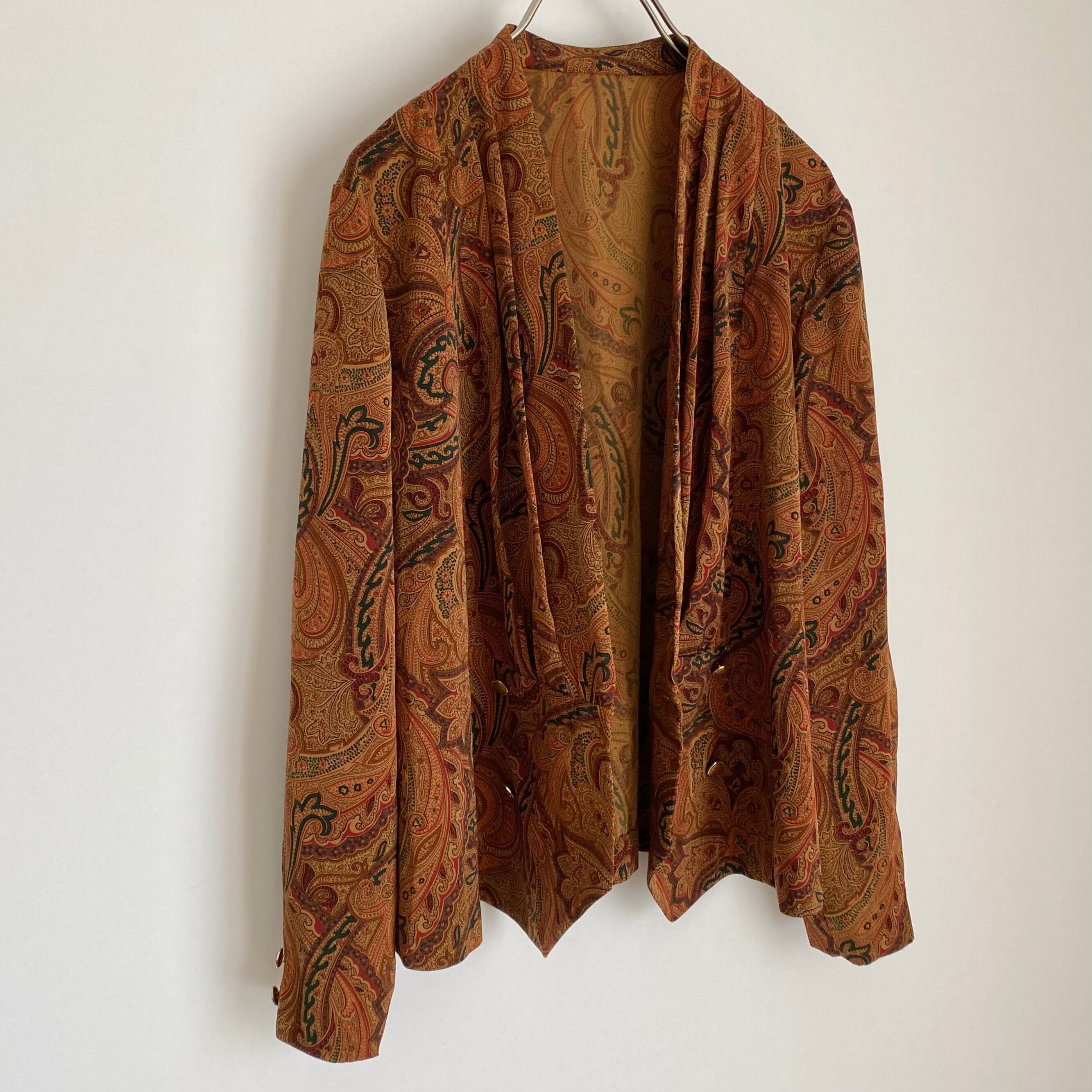 クラシカルなペイズリー柄のジャケット。スタイリングに取り入れやすい落ち着いた色合いが魅力的。ブラウスのような薄手の柔らかな生地感でほどよくゆとりのあるシルエットです。トップス兼アウターとしてお使いいただける着回しに便利な一着です。