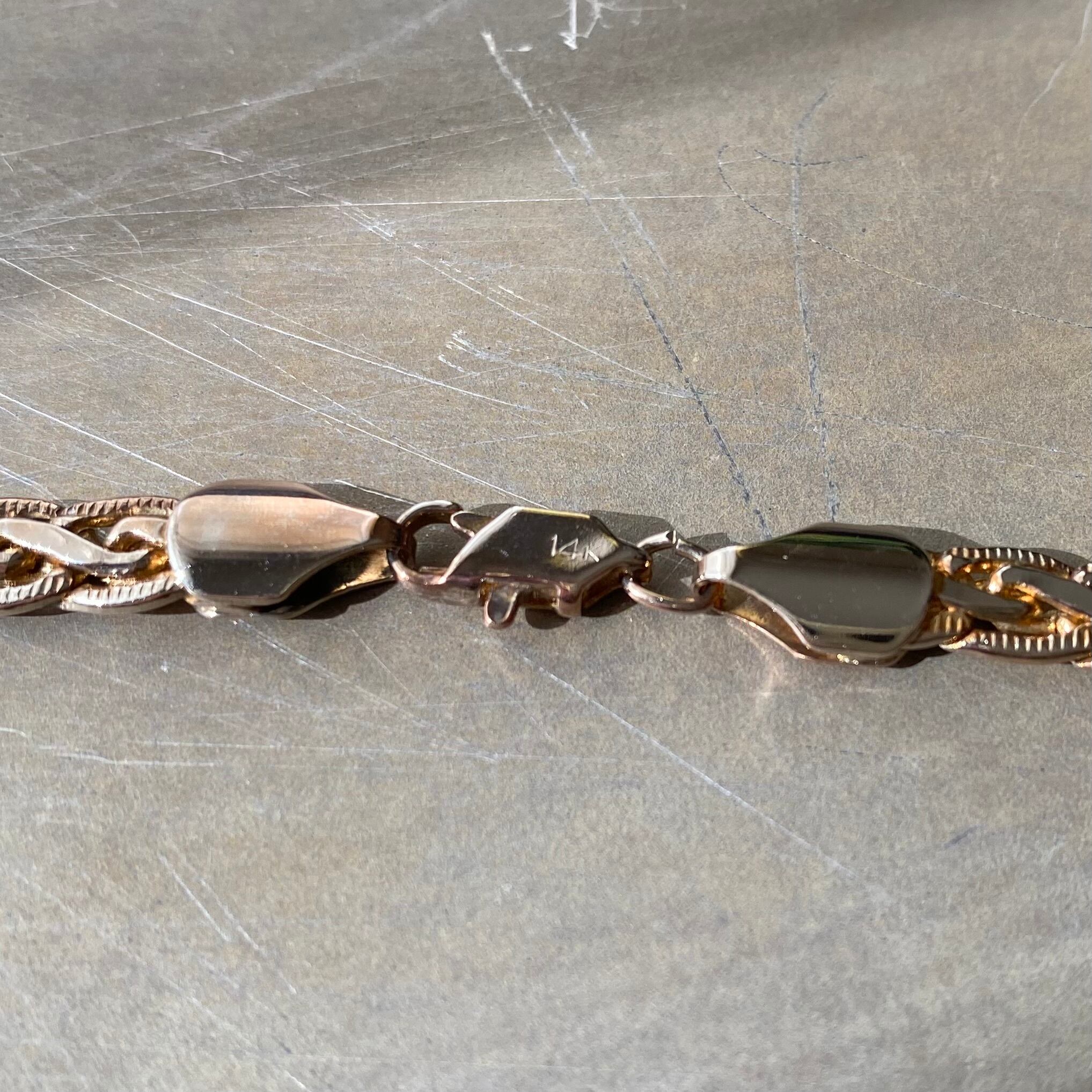 元々K14ホワイトゴールドメッキがかけられた製品ですが、メッキ剥がれにより所々元の地金の色(ブロンズ系の色)がみえています。画像をご確認ください。古びた雰囲気がお好きな方におすすめです。中古品であることをご理解のうえお買い求めください。ご購入前に必ずショッピングガイドのご確認をお願いいたします。