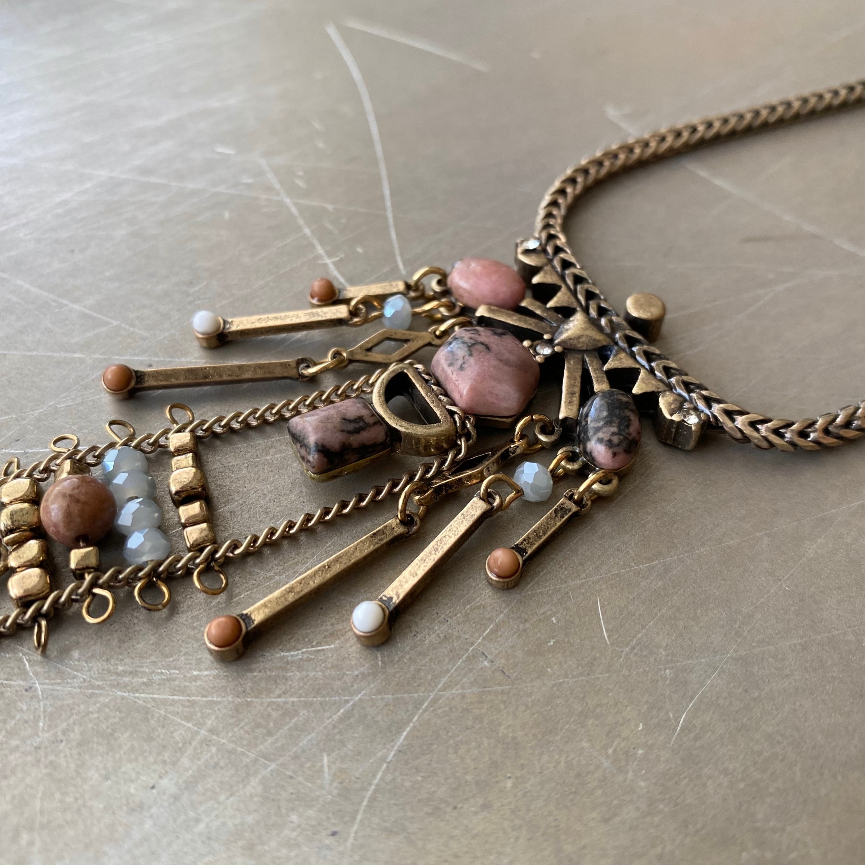 エスニックな雰囲気のUSAユーズドネックレス。ビーズやメタルパーツが複雑に組み上げられたユニークなデザイン。肌馴染みの良い落ち着いた色合いのビーズも魅力的。存在感がありスタイリングにお洒落な雰囲気をプラスしてくれます。