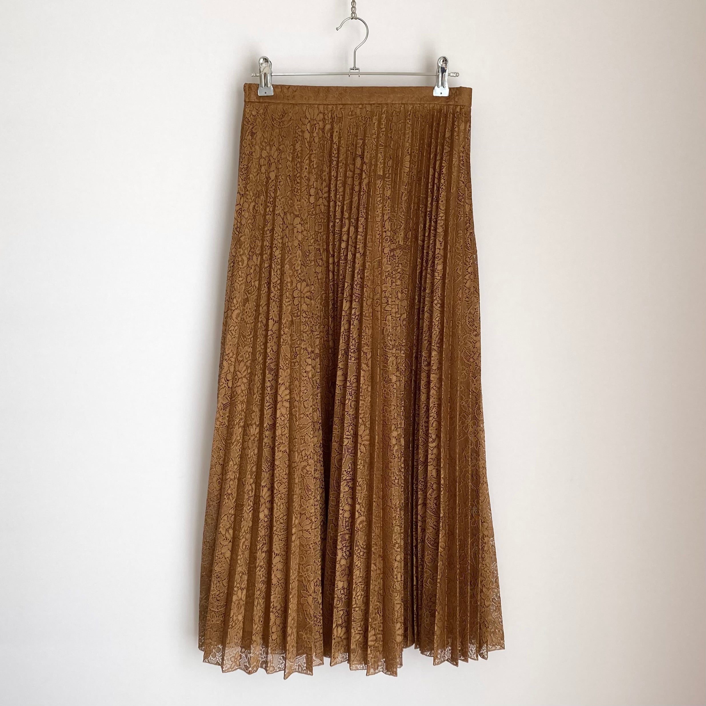 ボタニカルフラワー模様のレースが魅力的なヴィンテージ古着スカート。軽やかな生地感でふんわり広がるプリーツデザイン。落ち着いた色合いで、カジュアルからフェミニンなスタイルまで幅広いコーディネートに合わせていただけます。