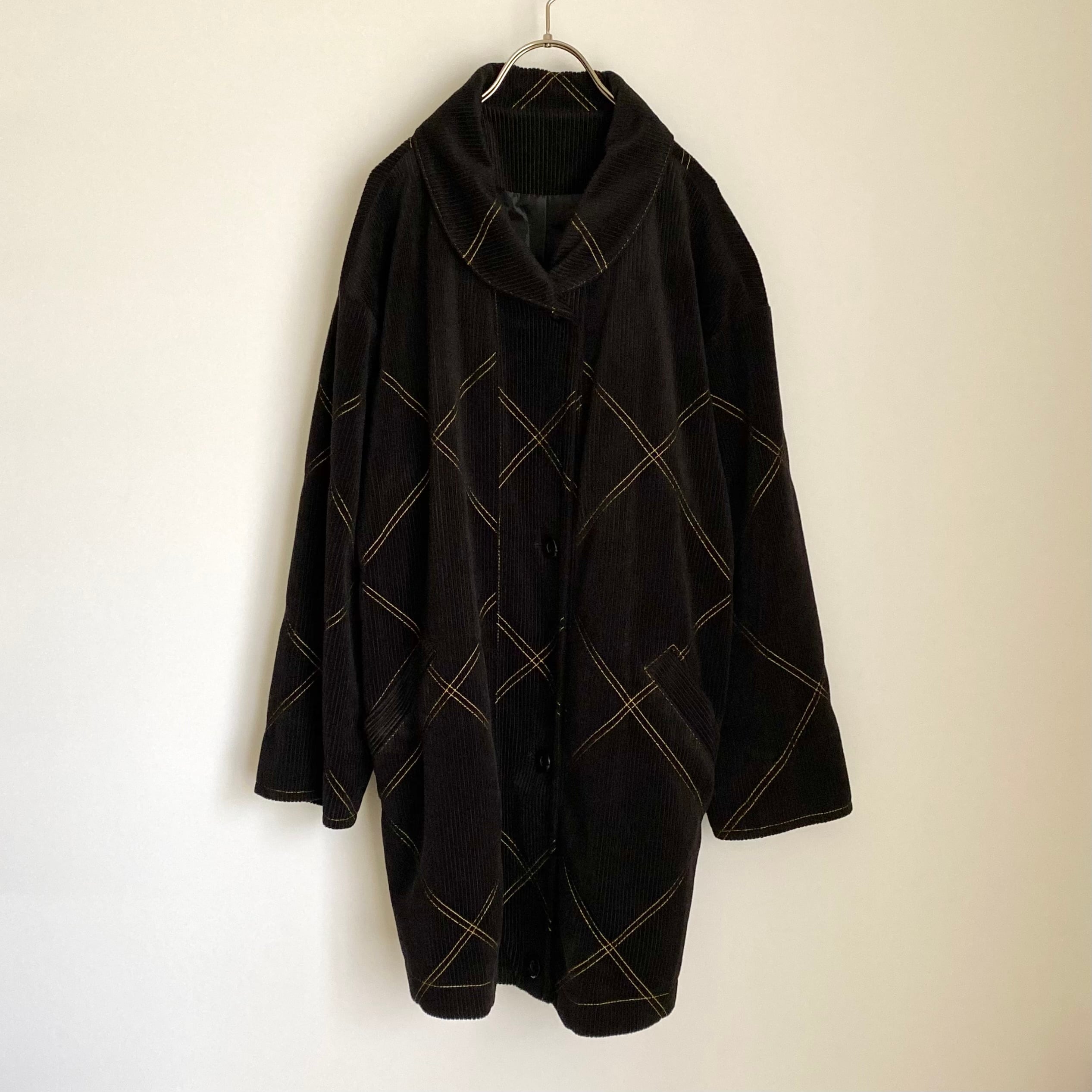 Vintage 80s-90s retro black corduroy yellow stitch design coat レトロ ヴィンテージ 古着 ブラック 黒 コーデュロイ イエロー 黄色 ステッチ デザイン ショールカラー コート