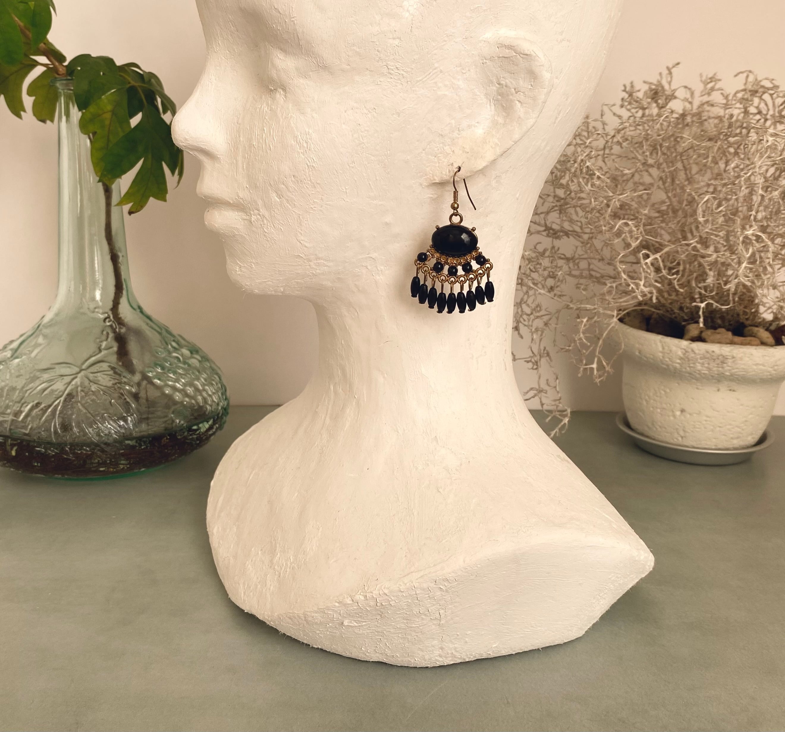 ブラックビーズのフリンジが揺らめくUSAヴィンテージピアス。軽やかな着け心地でスタイリングにお洒落な雰囲気をプラスしてくれます。