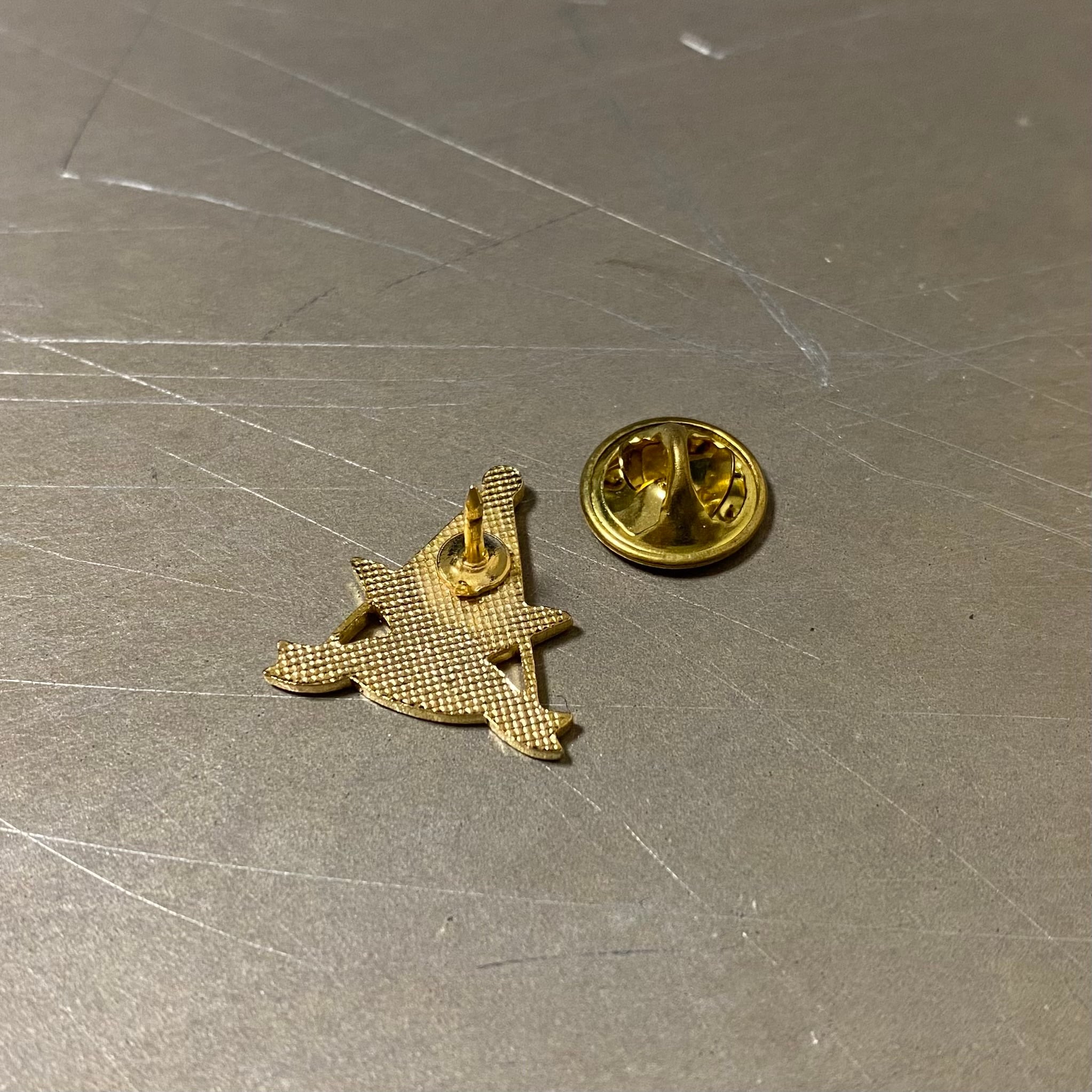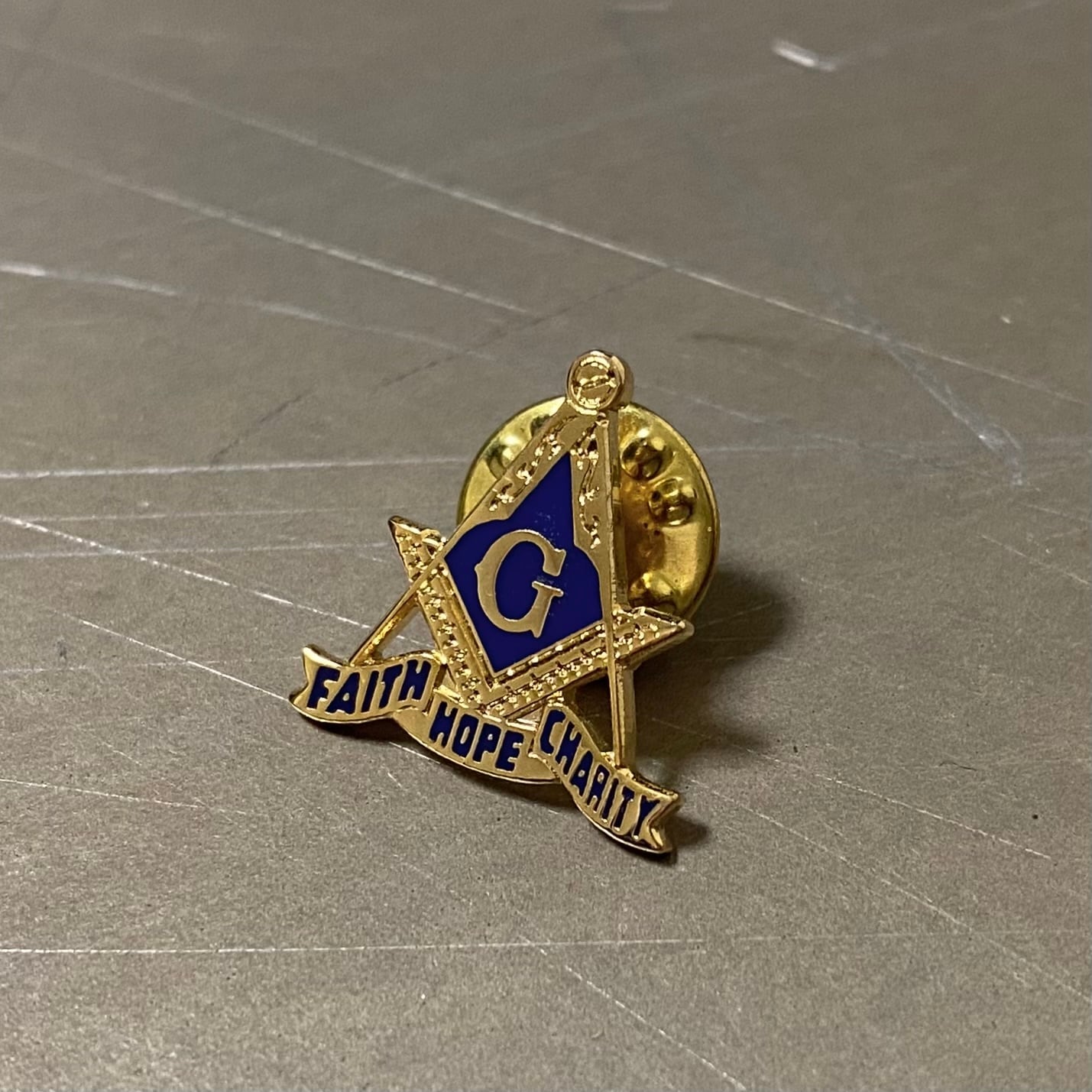 フリーメイソンのUSAヴィンテージピンブローチ。コンパスと定規のフリーメイソンのシンボルマークと「Faith hope charity」の文字がブルーのエナメルで彩られています。