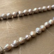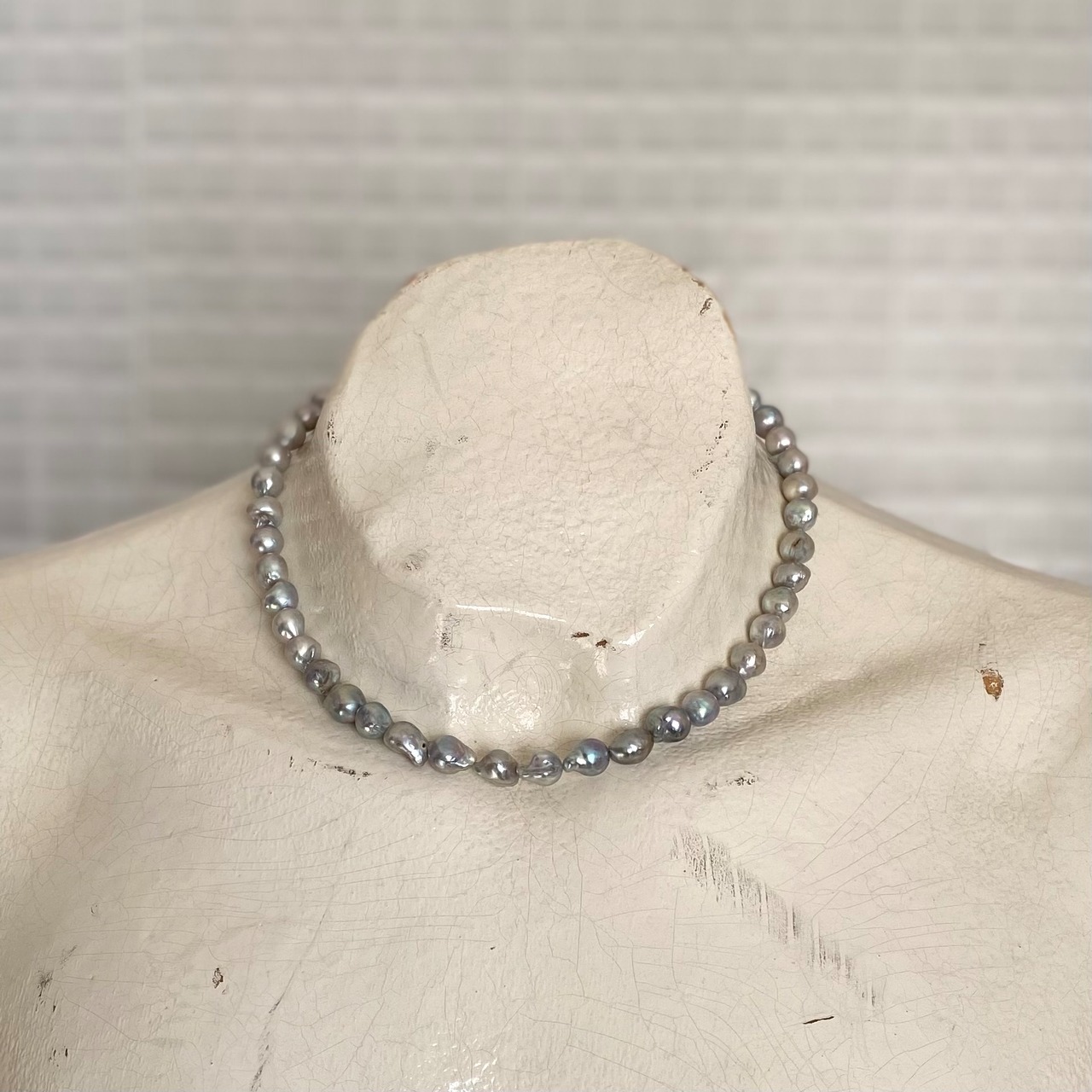 ほんのり玉虫色に輝く美しいパールが魅力的なUSAヴィンテージネックレス。ラフな形のバロックパールがカジュアルなスタイルにも合わせやすくお顔まわりを上品に彩ってくれます。