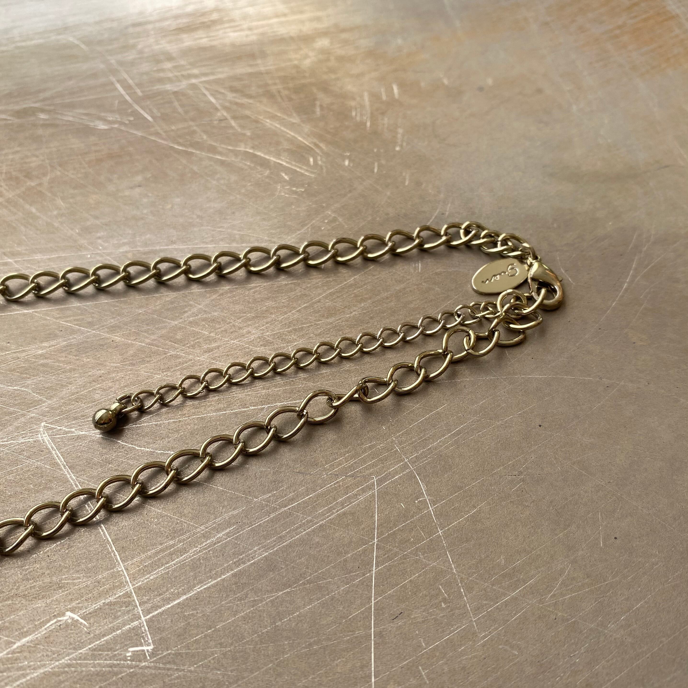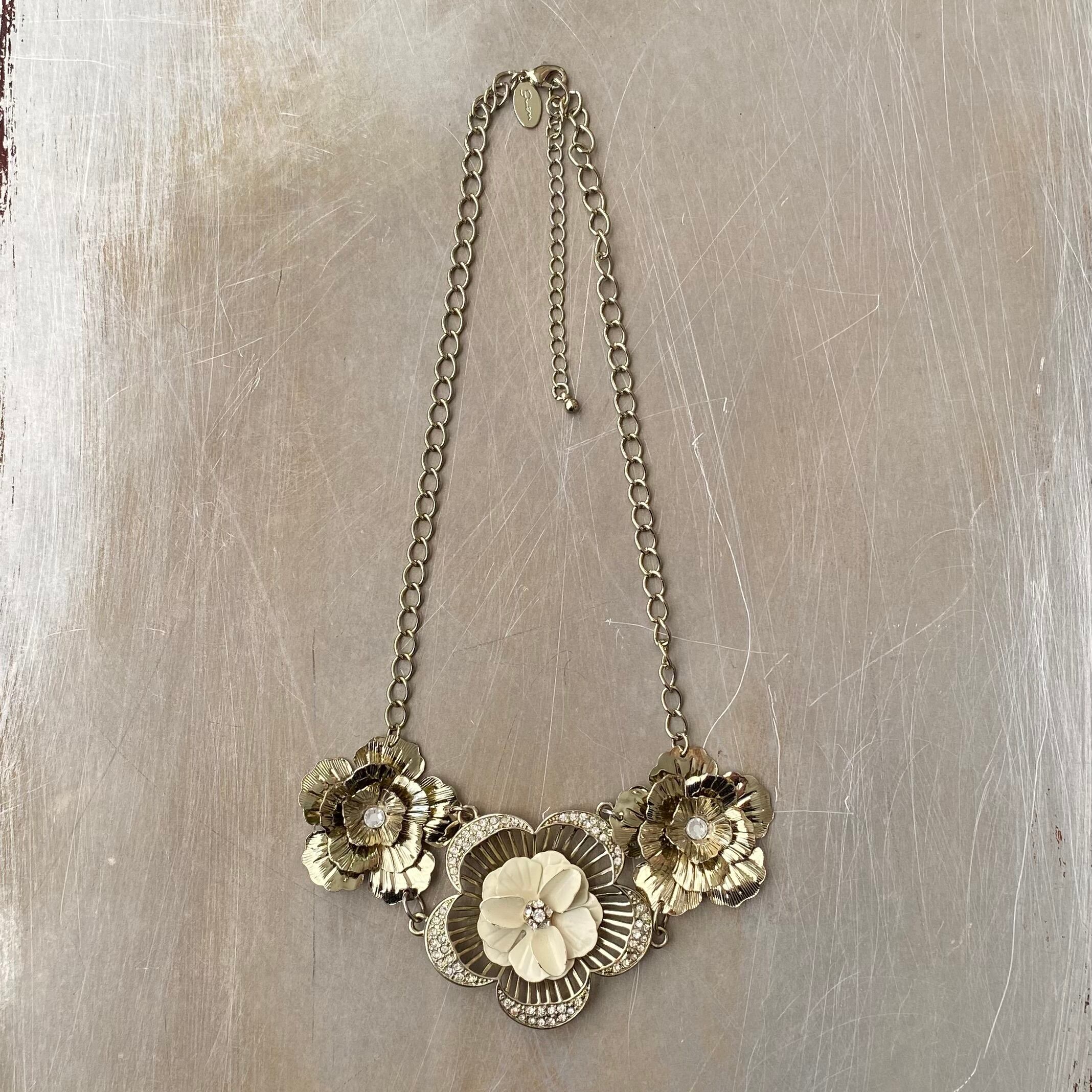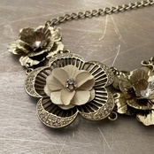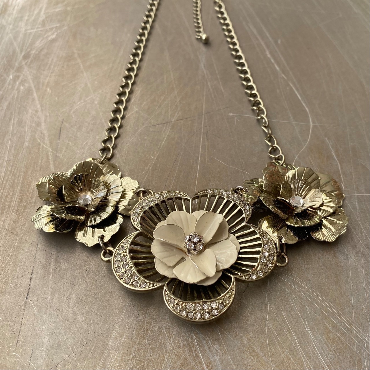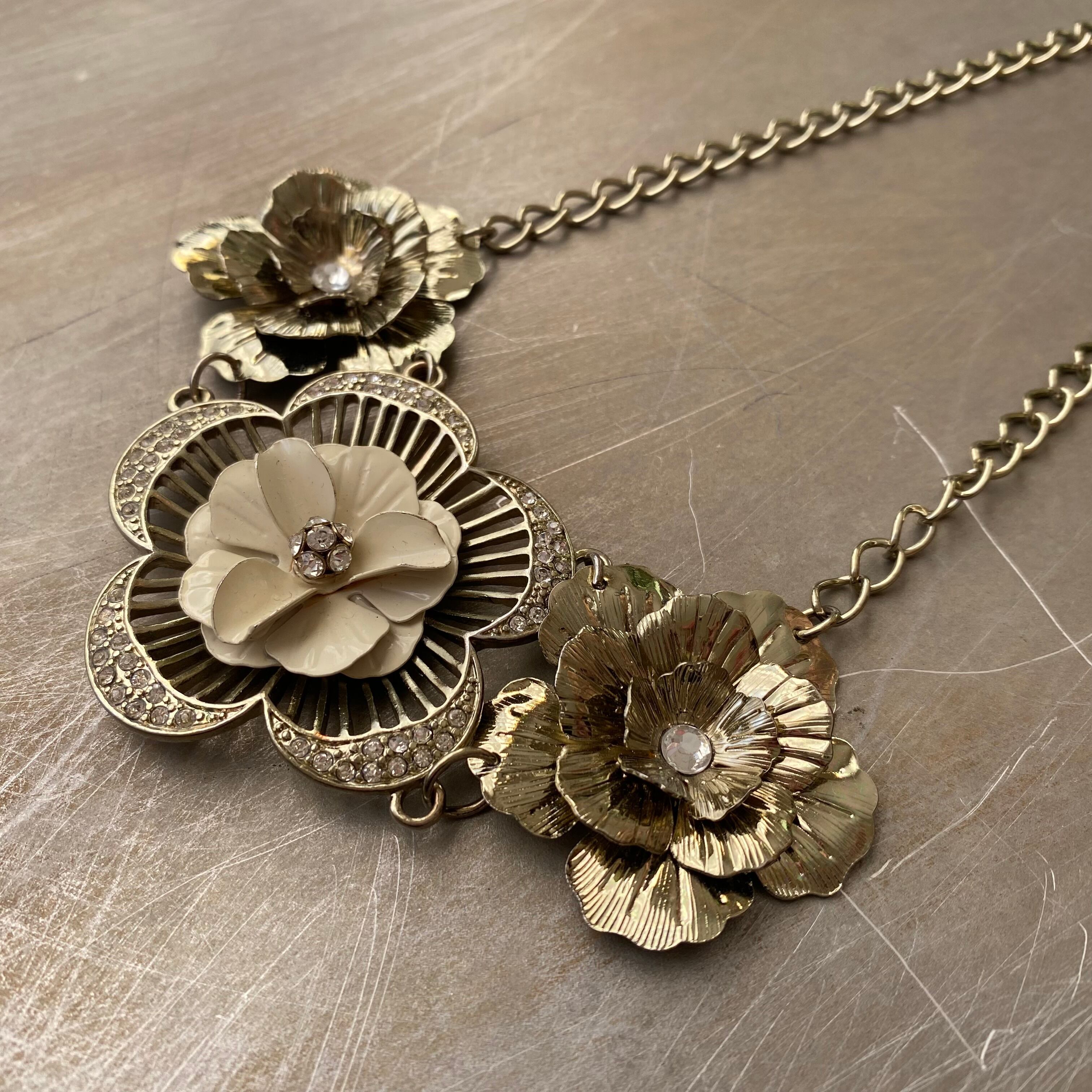 メタルのフラワーパーツにビジューがキラキラと輝くクラシカルな雰囲気のUSAヴィンテージネックレス。大ぶりで存在感がありスタイリングの主役におすすめです。