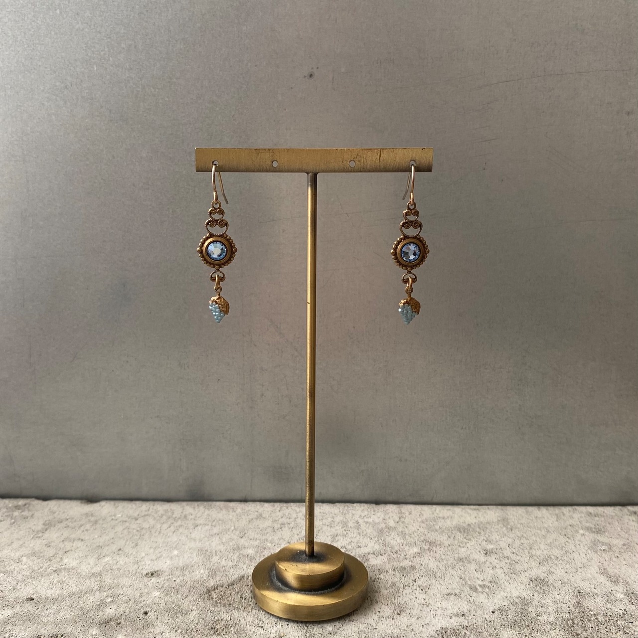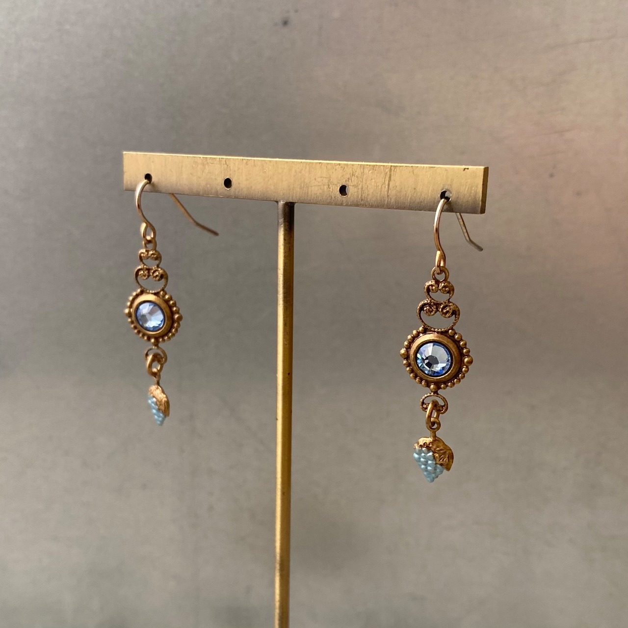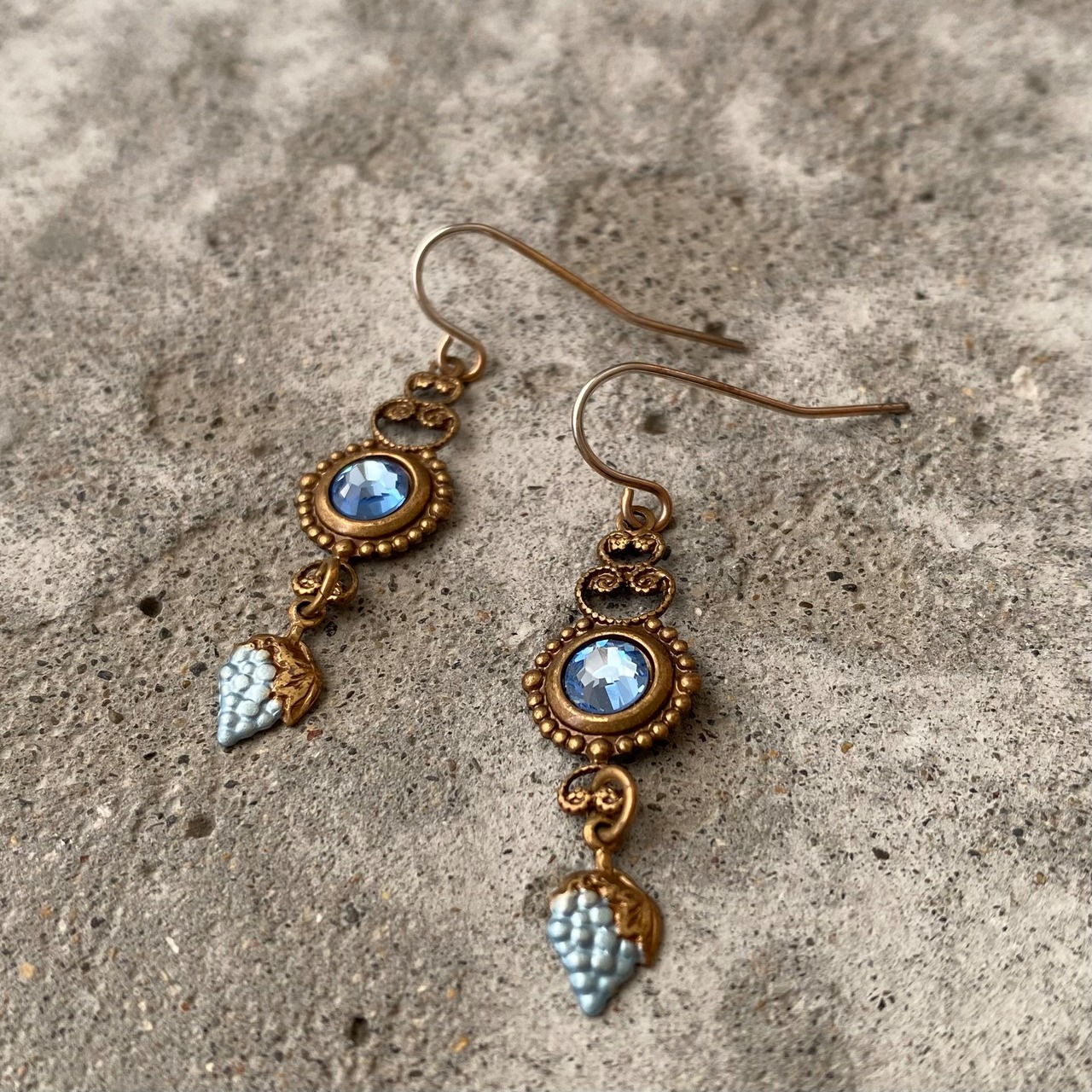 美しいブルーのビジューが輝くUSAユーズドピアス。小さなぶどうが揺れる可愛らしいデザイン。身につけやすいサイズ感でとても軽やかな着け心地です。