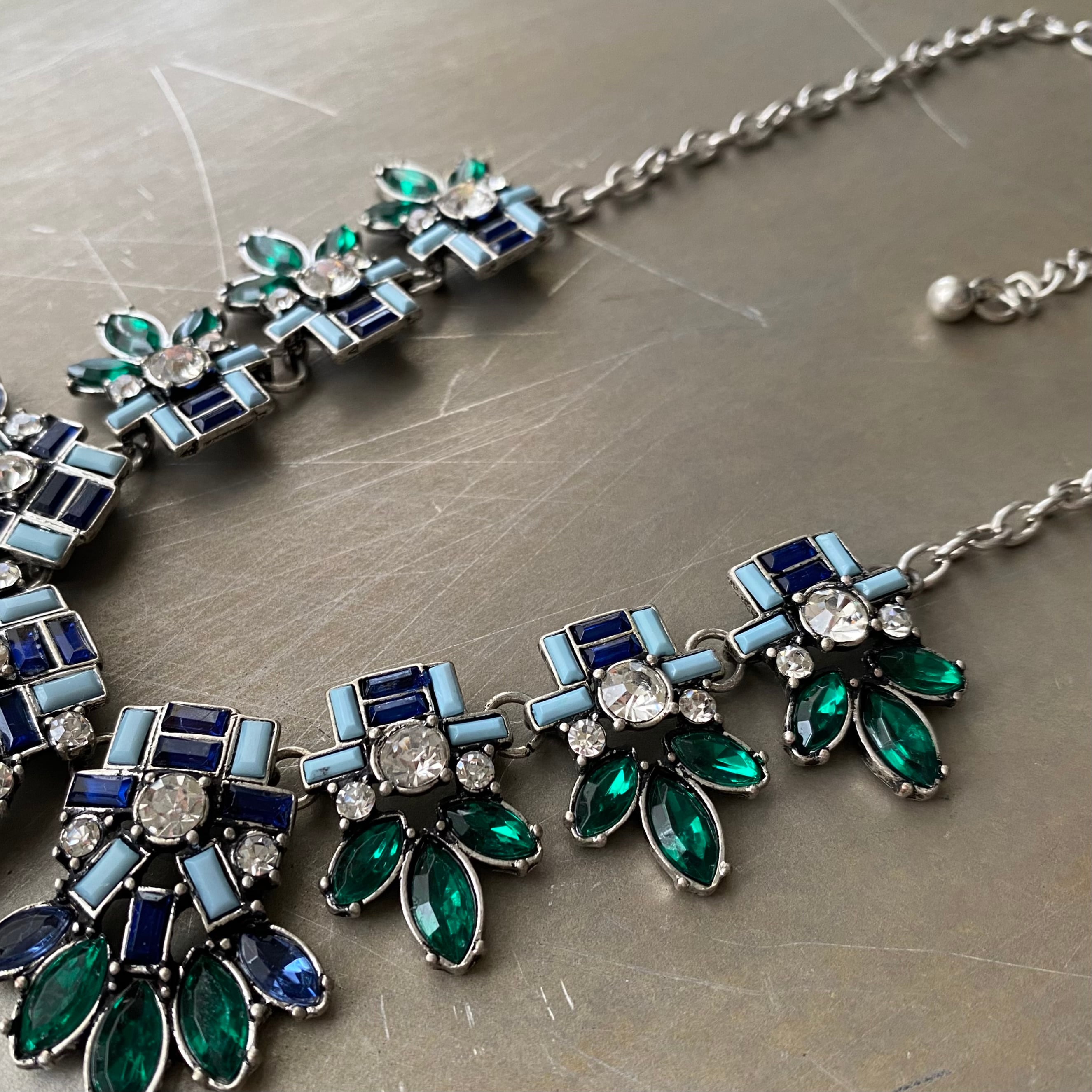 クラシカルな雰囲気のUSAユーズドネックレス。ブルー×グリーンのビジューが贅沢に留められたお洒落なデザイン。大ぶりで存在感がありスタイリングのアクセントにおすすめです。