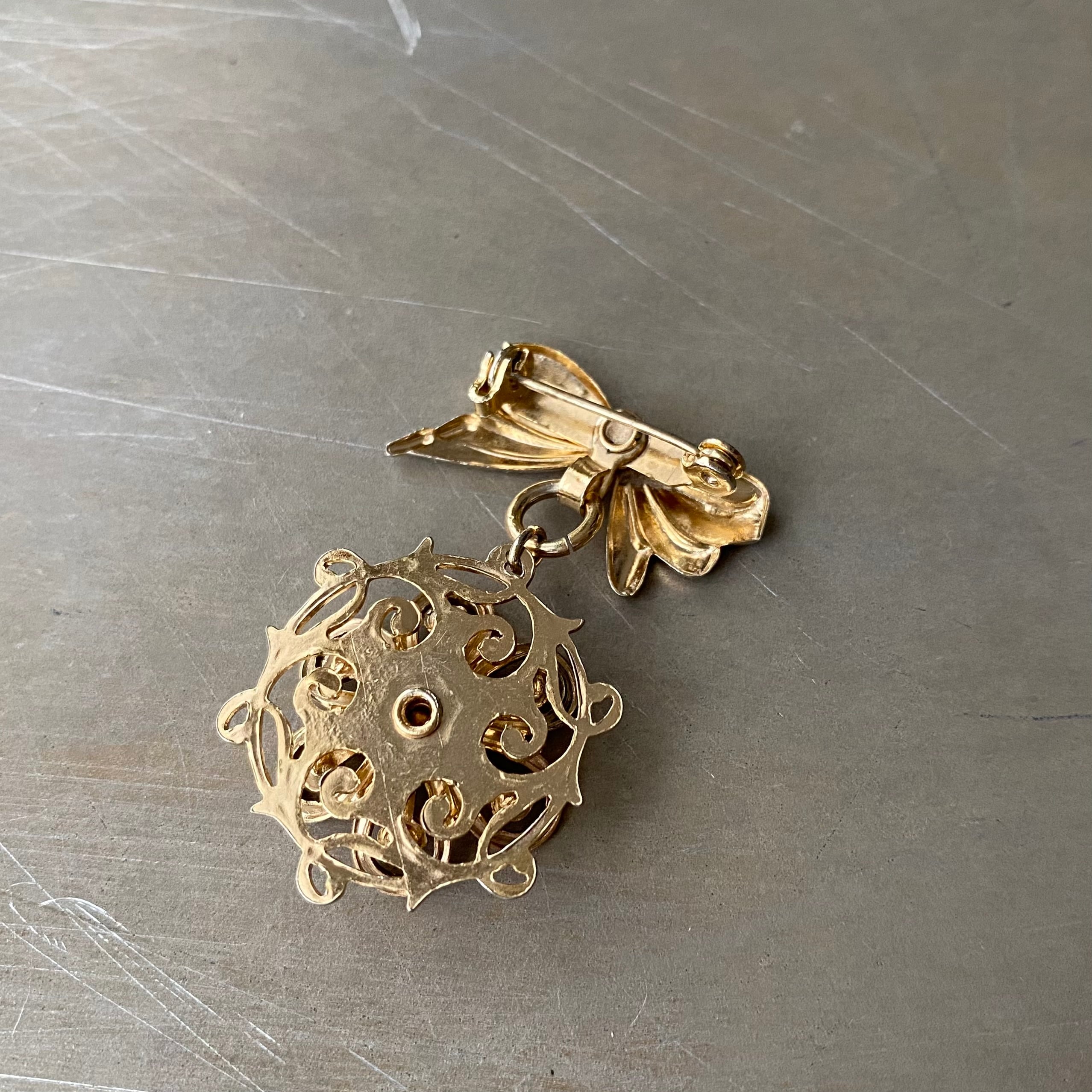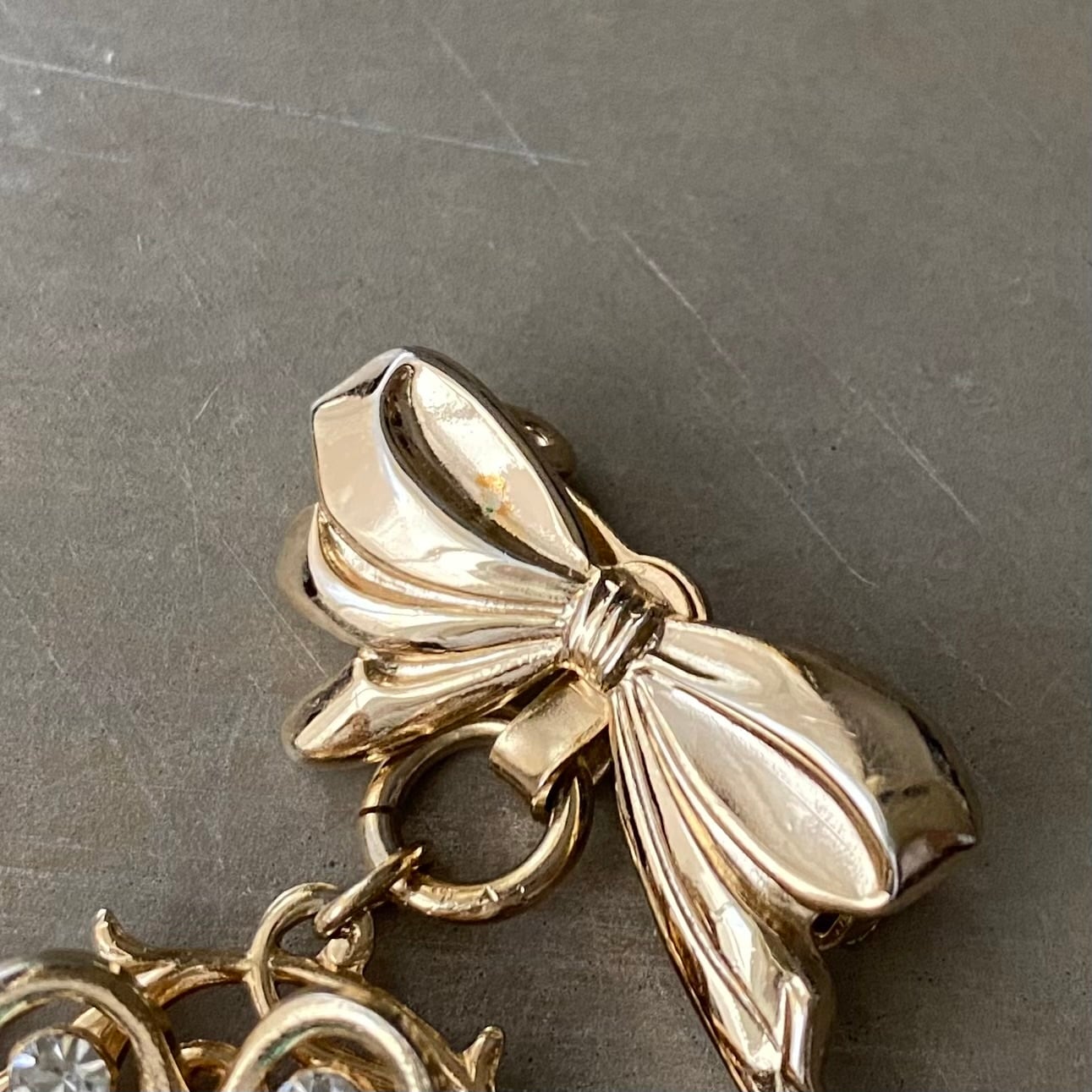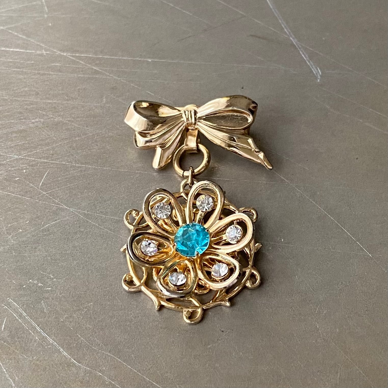リボンとフラワーモチーフのレトロ可愛いUSAヴィンテージブローチ。揺れるたびにビジューがキラキラと輝き華やかな雰囲気。ジャケットやストール等のアクセントにおすすめです。