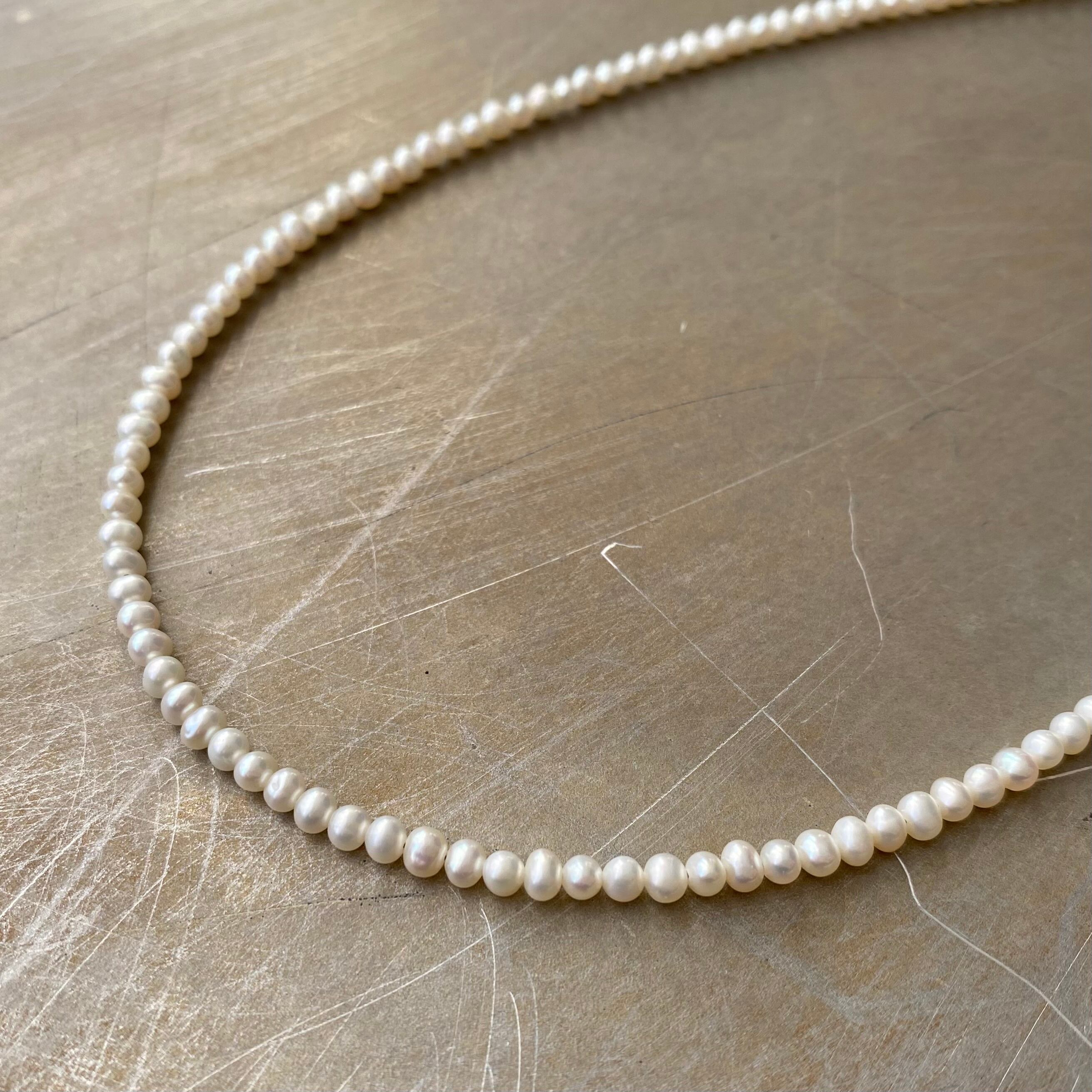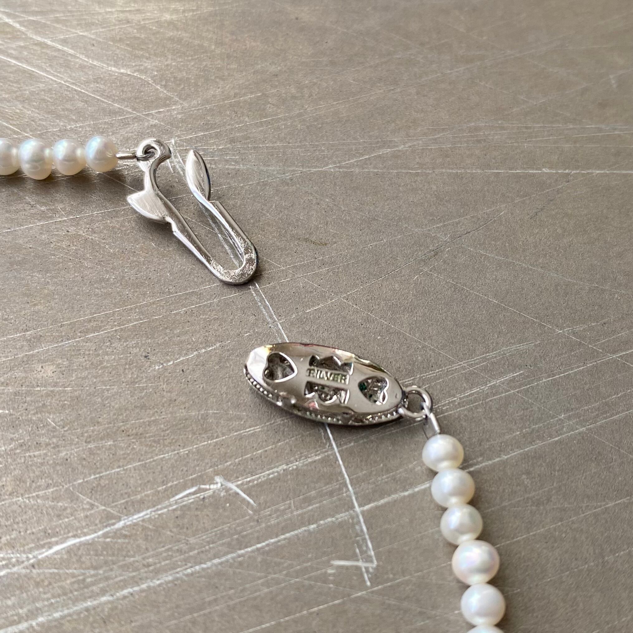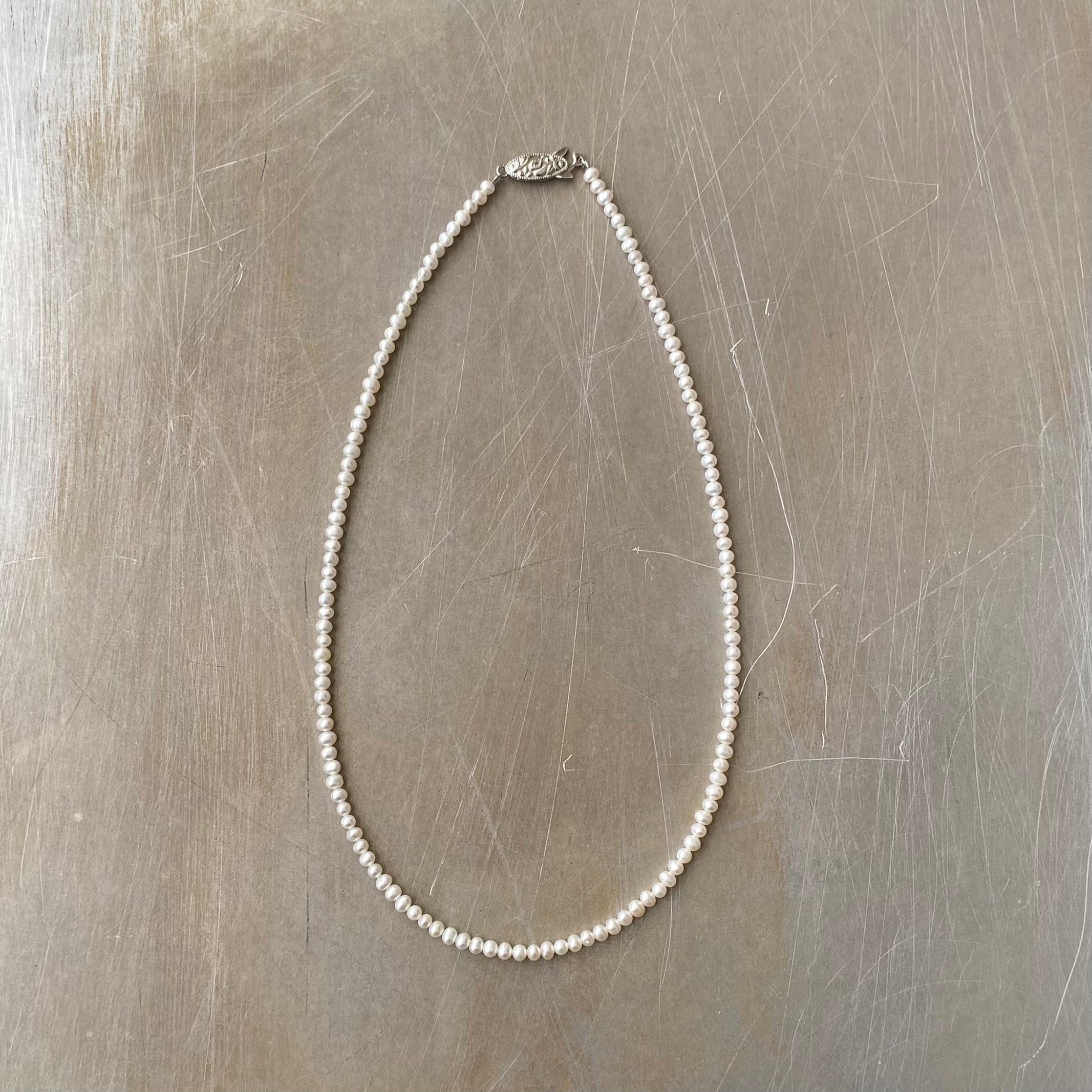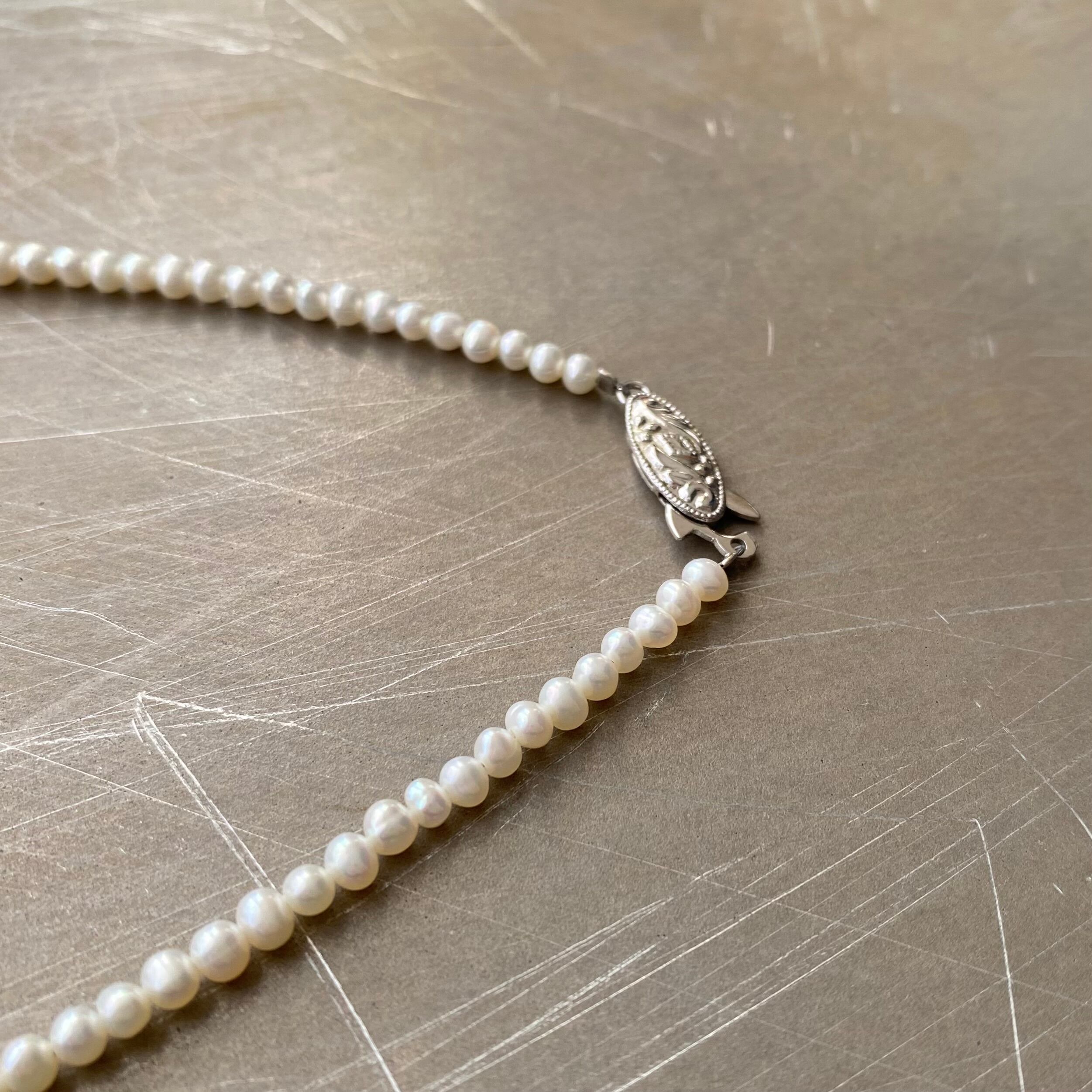 繊細な淡水パールが魅力的なUSAヴィンテージネックレス。レトロな金具も素敵なポイント。身につけやすいサイズ感でお顔まわりに上品な雰囲気をプラスしてくれます。