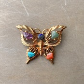 カラフルな天然石が留められたレトロ可愛い蝶々モチーフのUSAヴィンテージブローチ。ヴィンテージらしい繊細な透かしが特徴的な軽やかなデザイン。ジャケットやストール等のワンポイントにおすすめです。