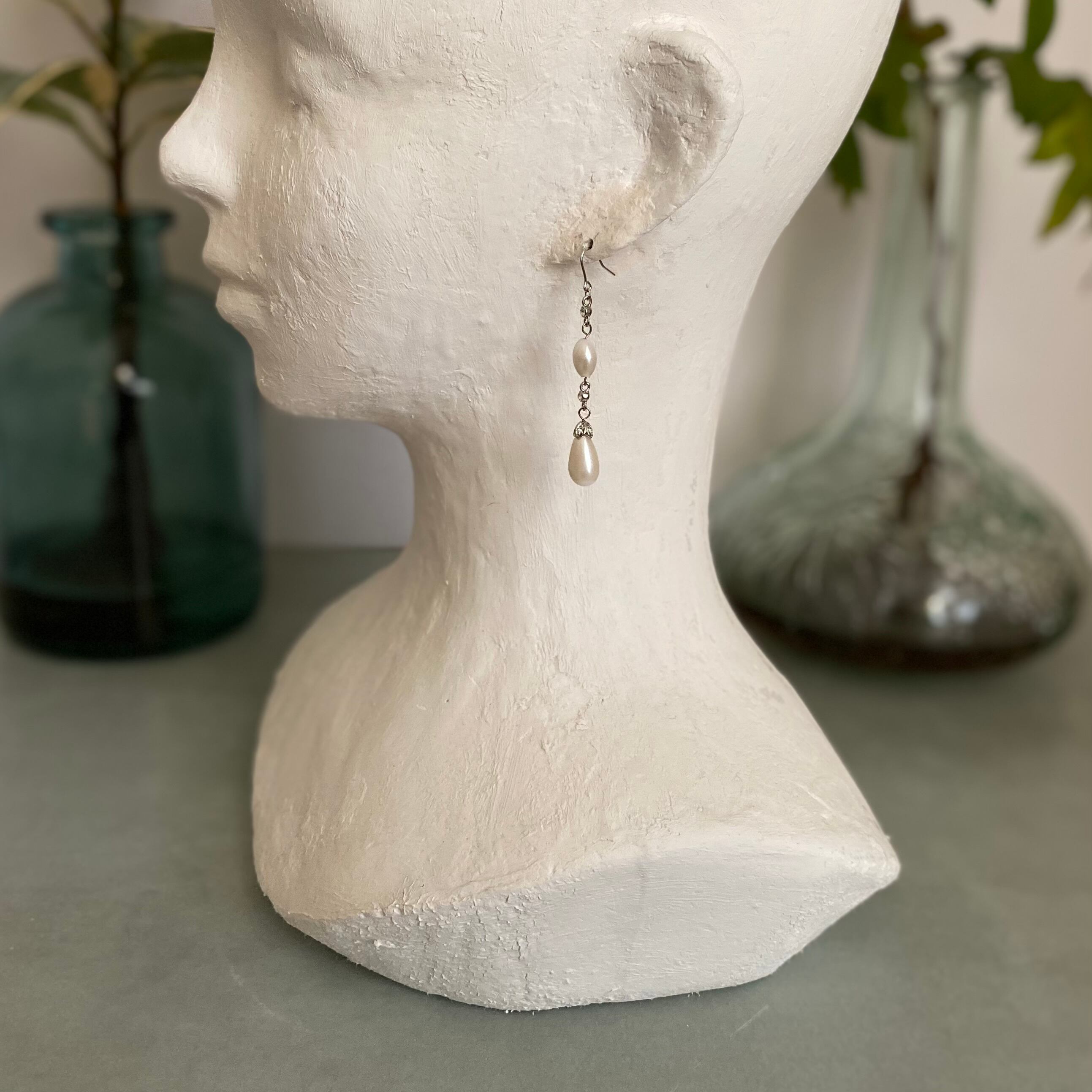 クラシカルなドロップパールのUSAユーズドピアス。繊細なビジューが揺れるたびにキラキラと輝く上品なデザインです。