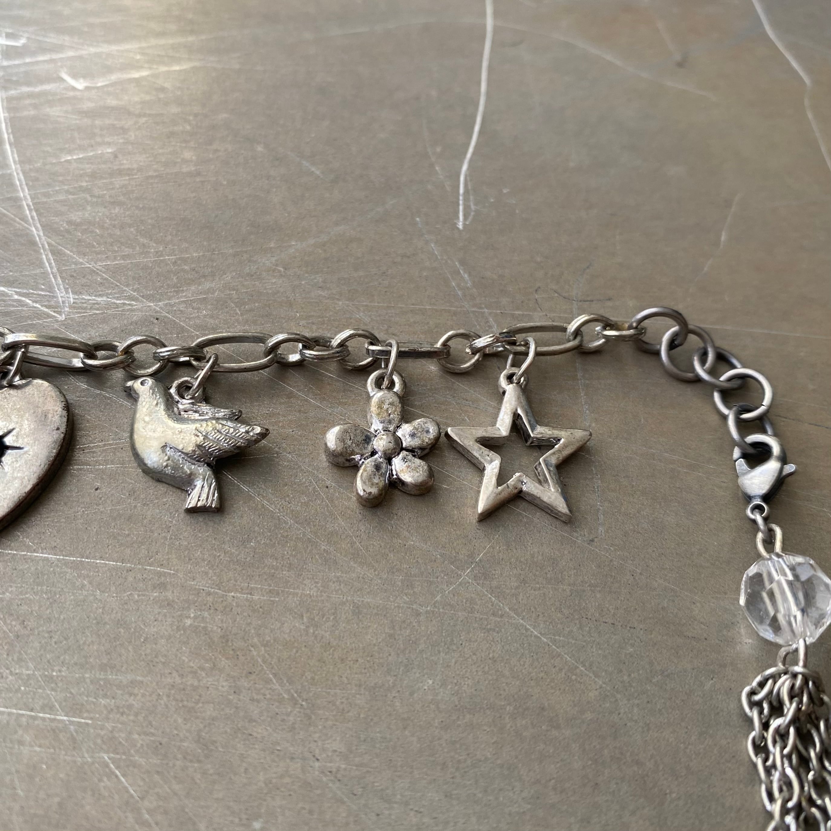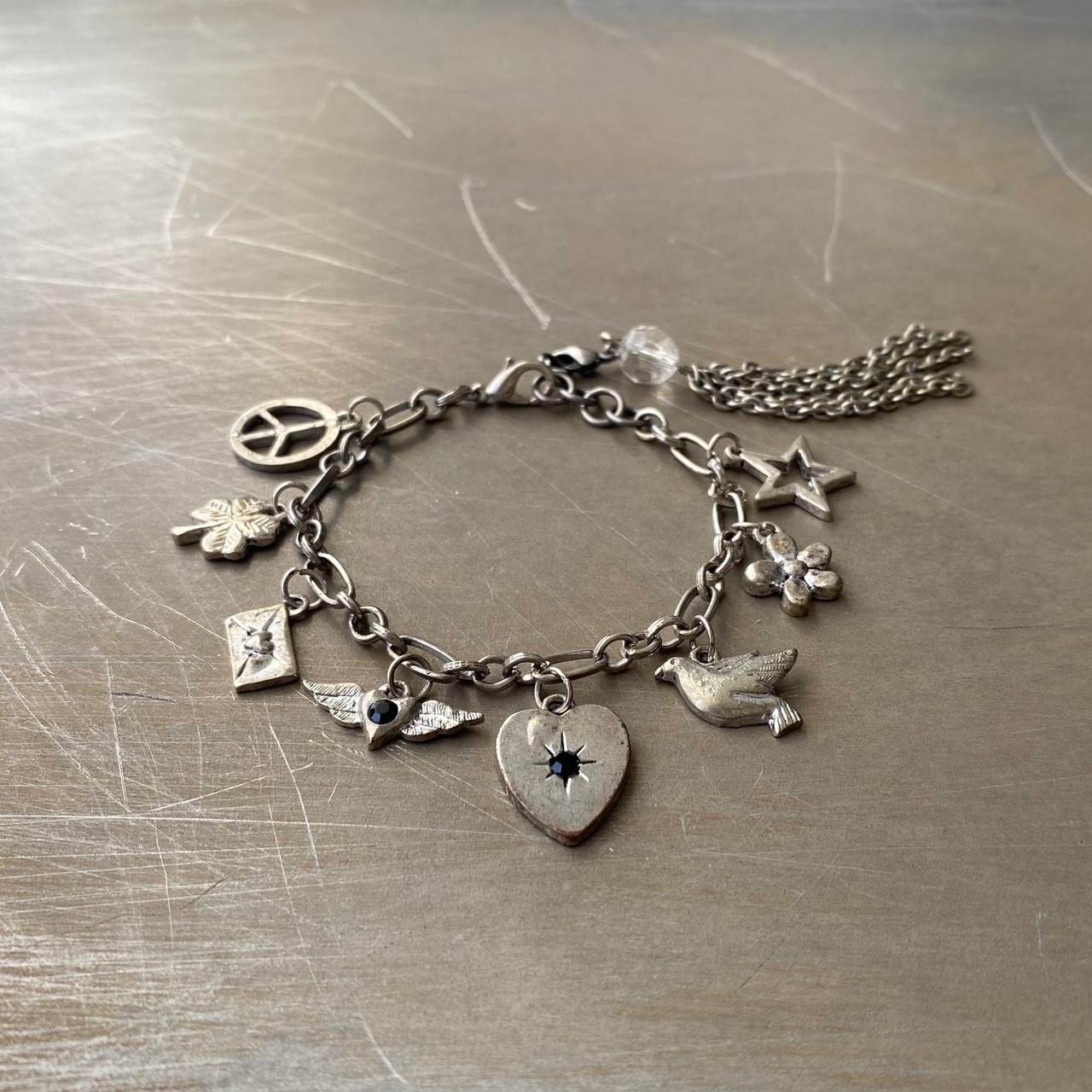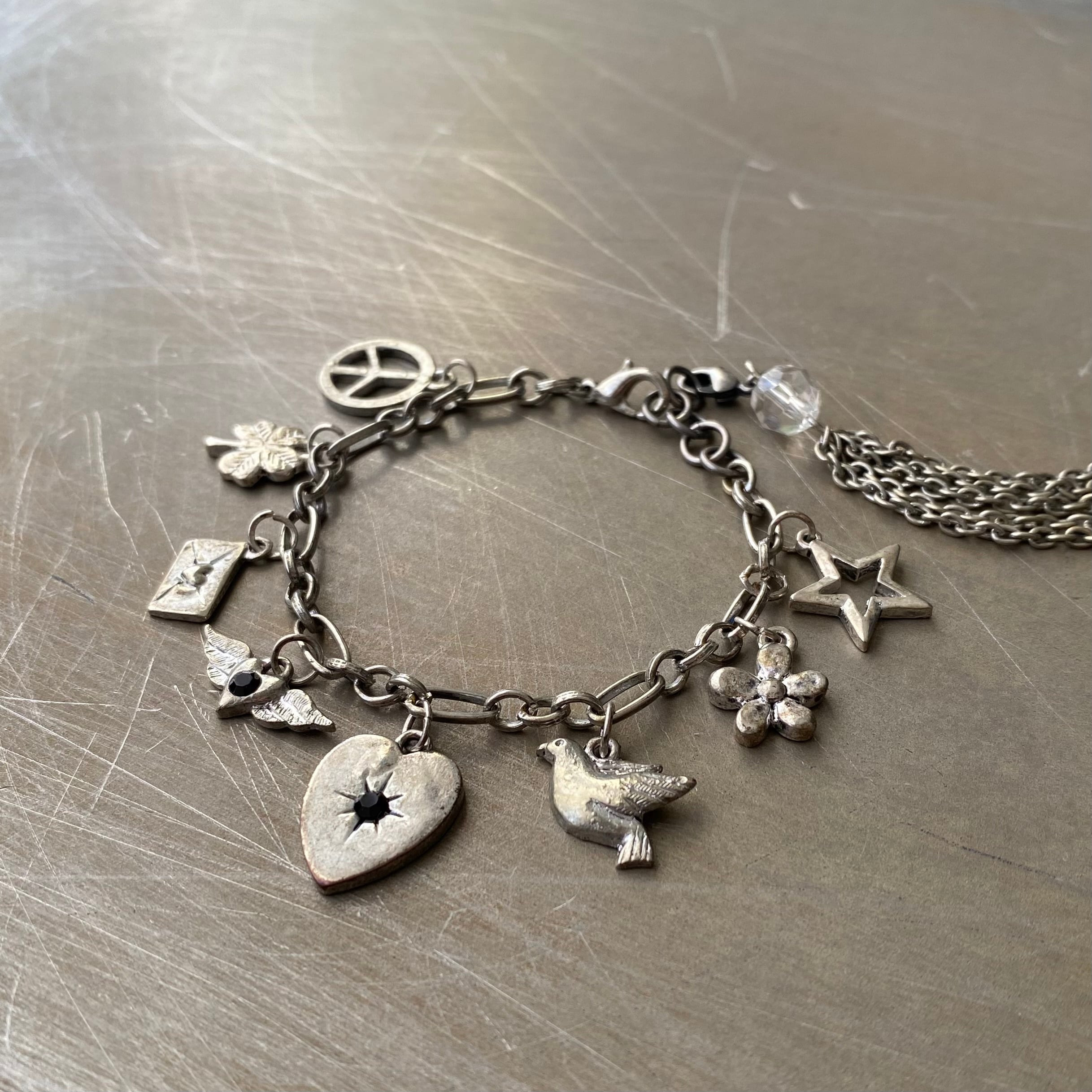 レトロ可愛いUSAヴィンテージブレスレット。ハートや鳥、お花、ラブレターなど沢山のラッキーチャームが揺らめく、ヴィンテージならではの魅力溢れるデザイン。エンドのタッセルチャームは取り外し可能になっています。
