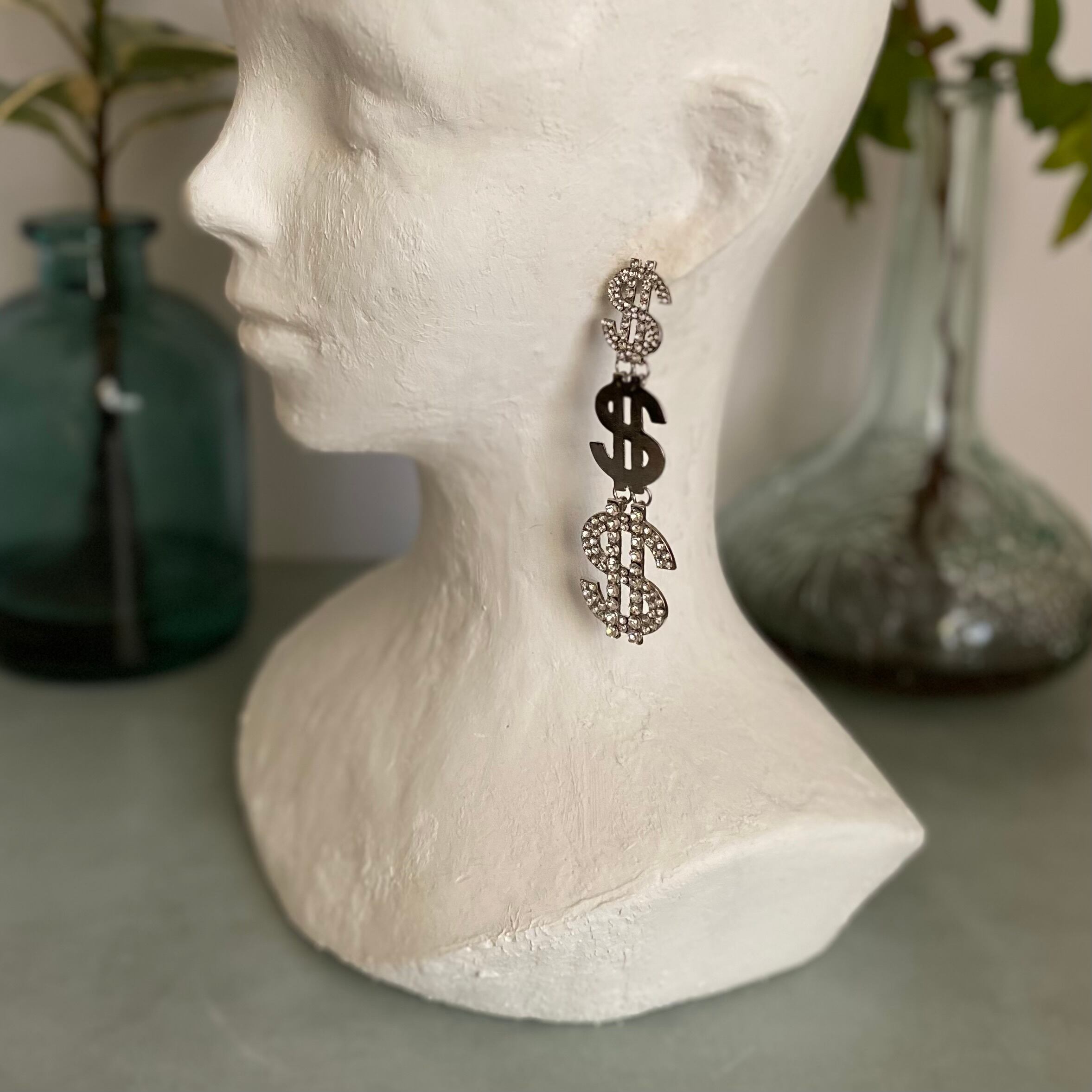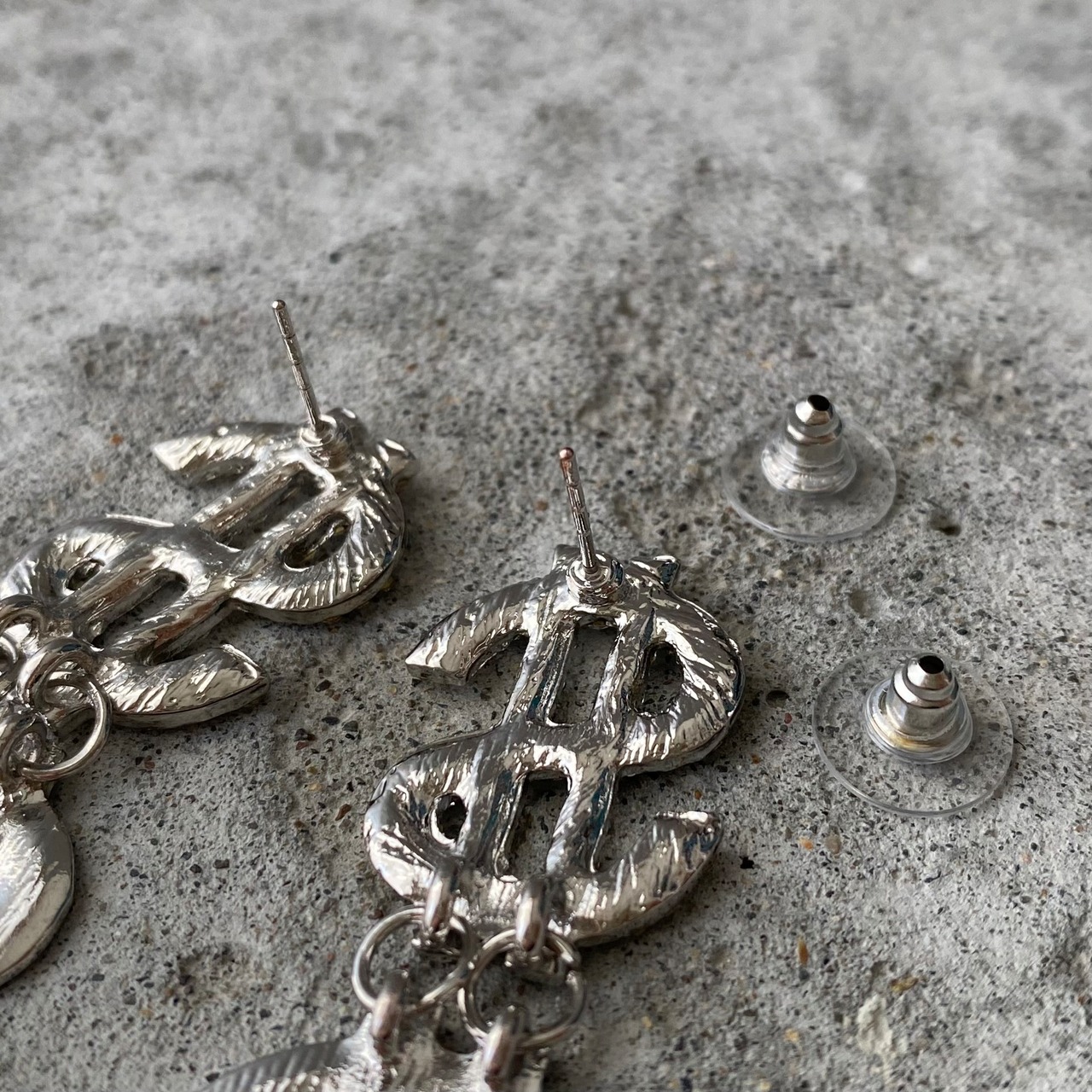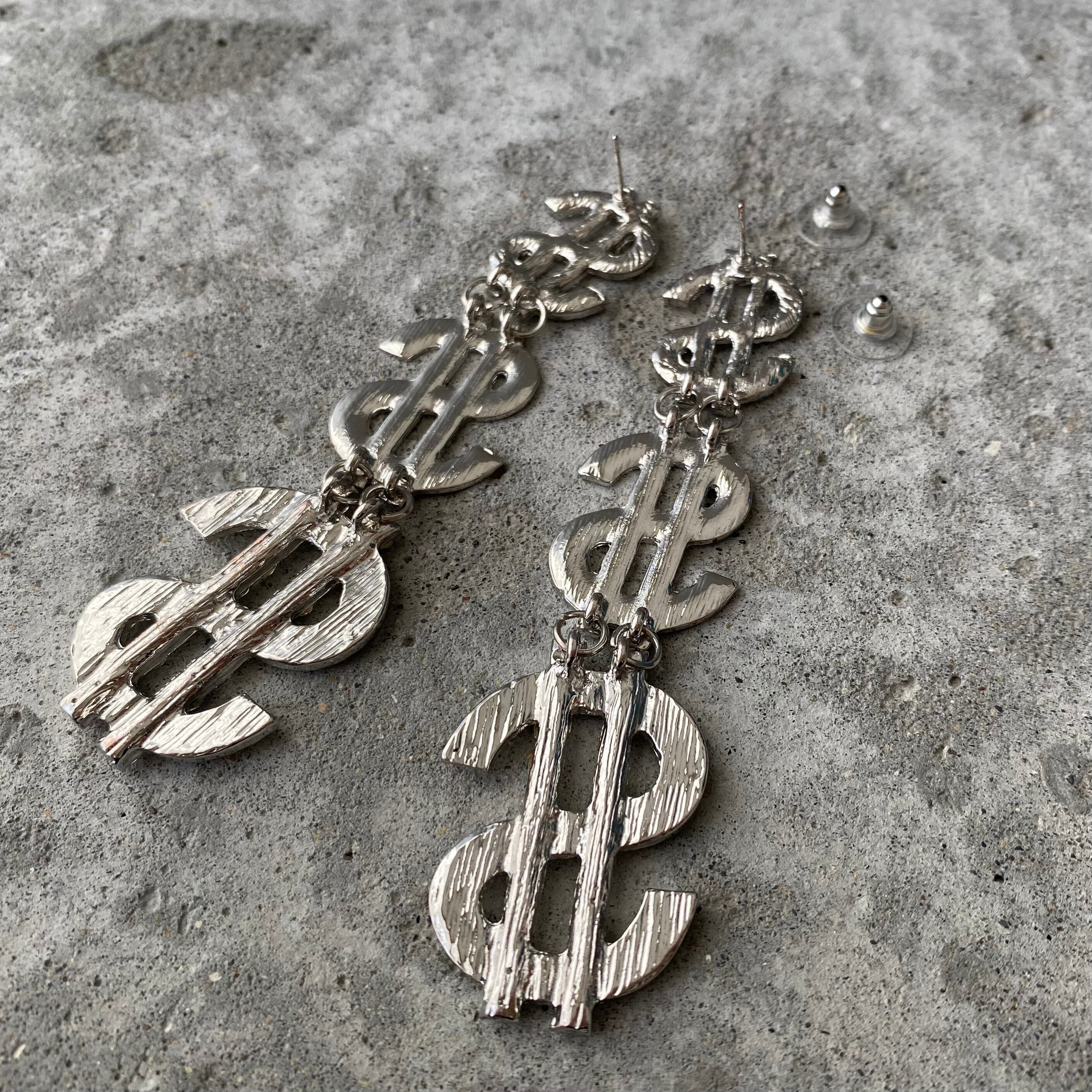 ドルマークが連なる個性的なデザインのUSAヴィンテージピアス。揺れるたびにビジューがキラキラと輝く、大ぶりで存在感たっぷりのピアスです。