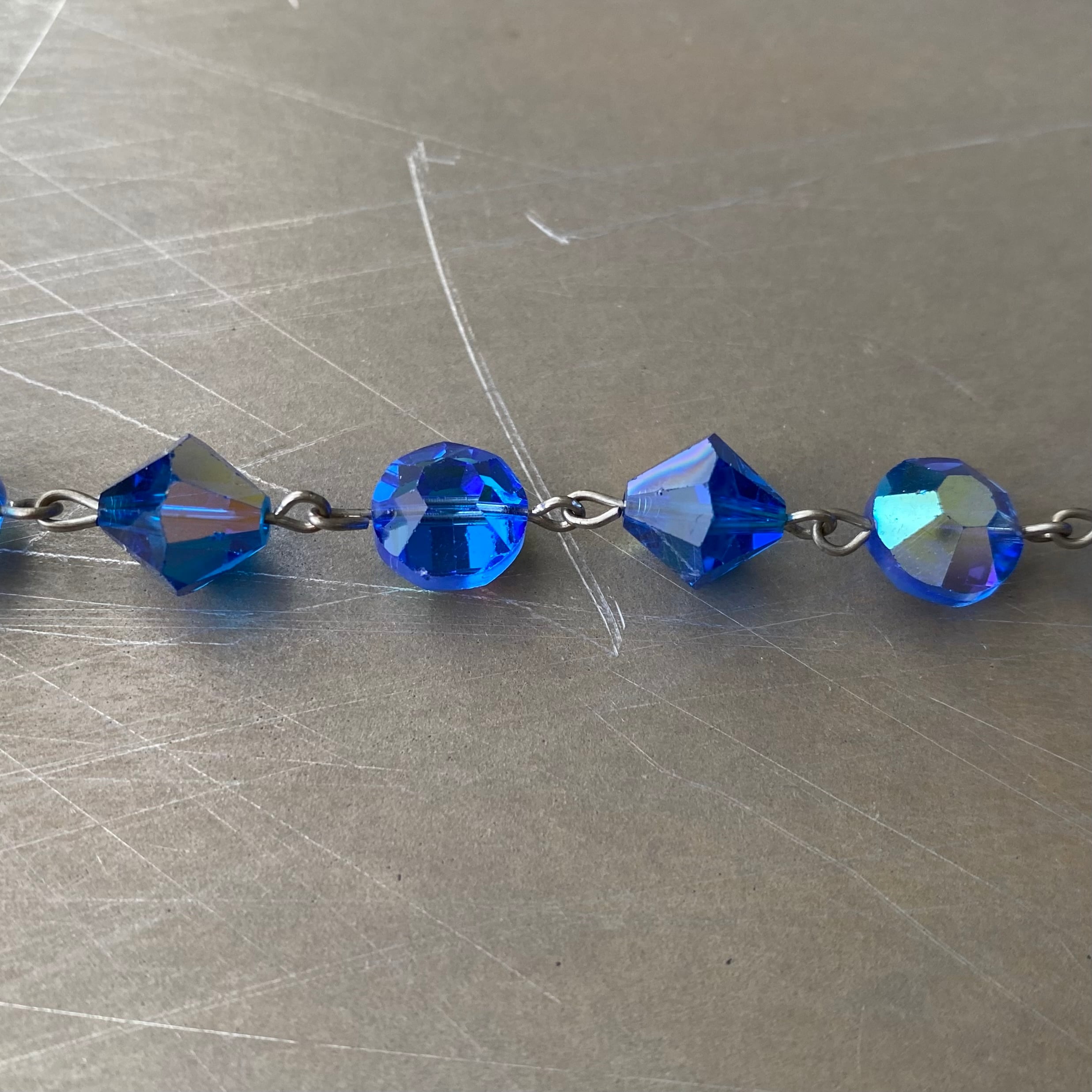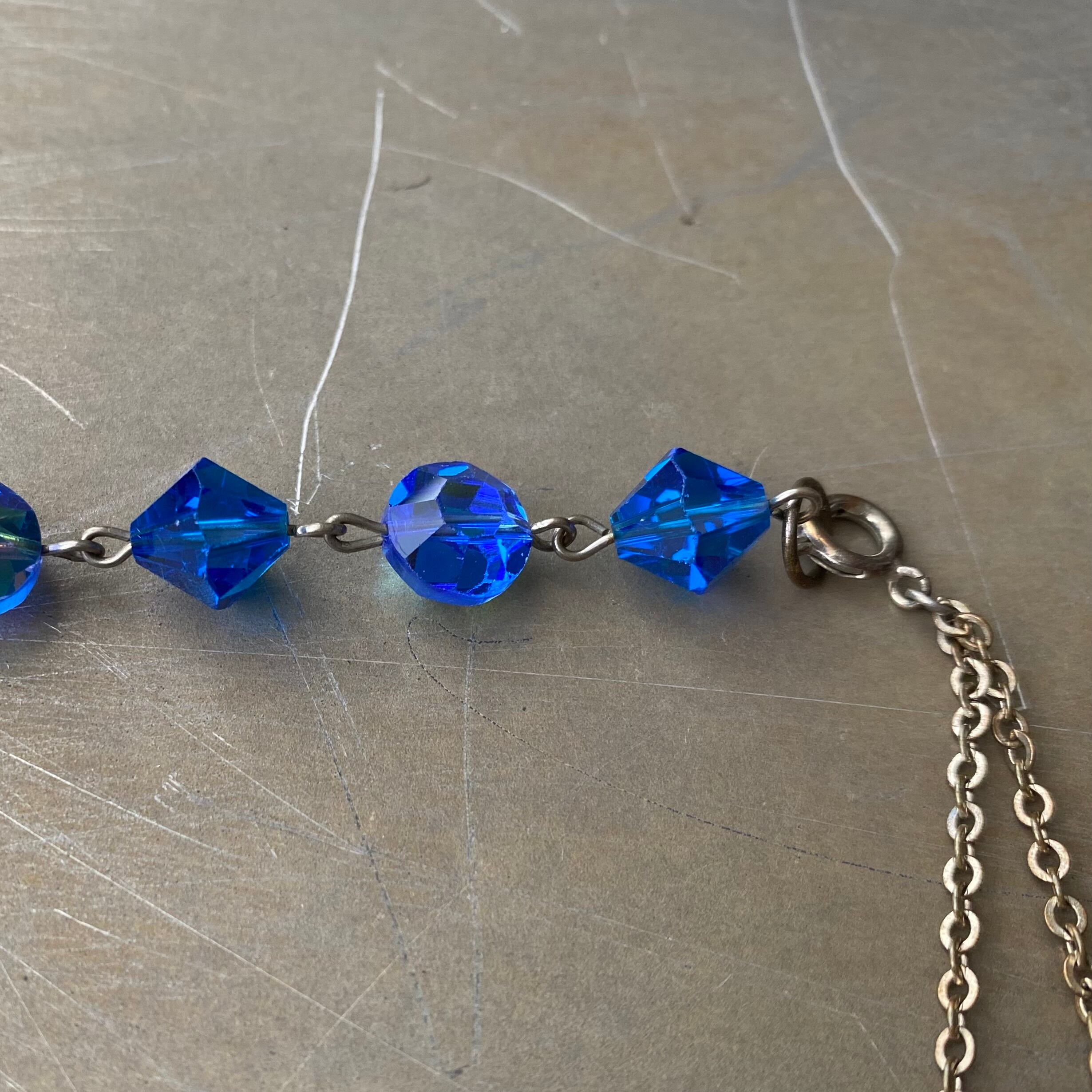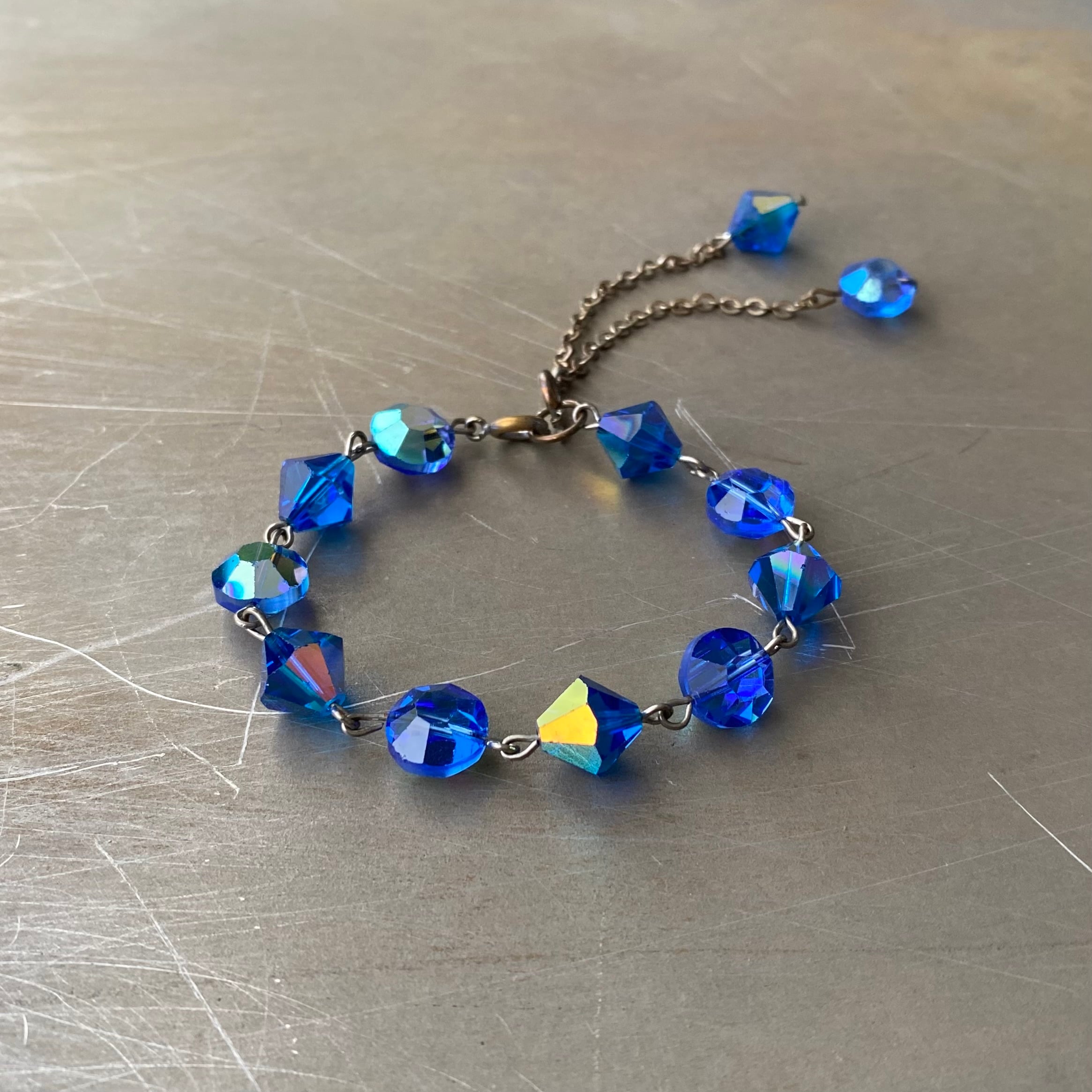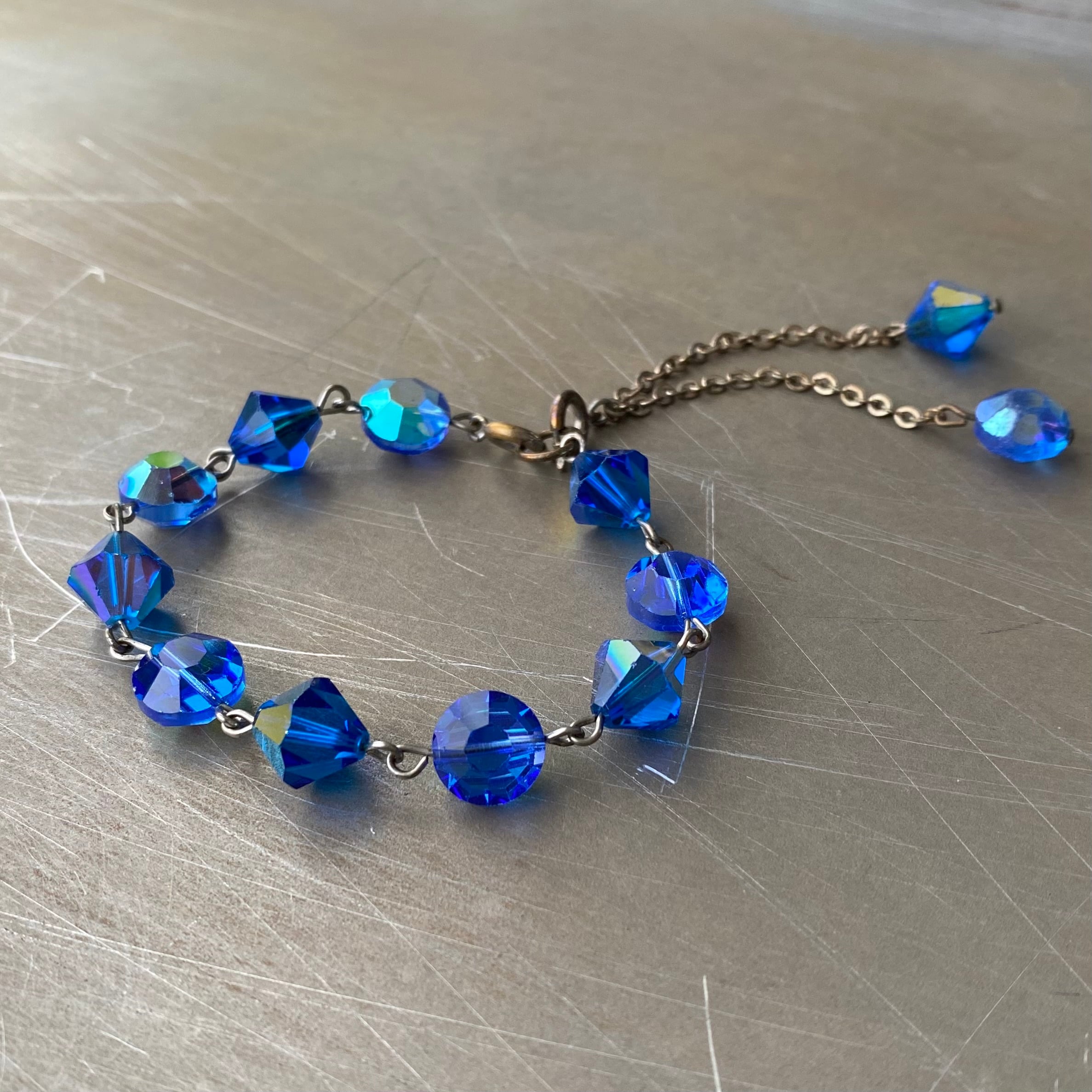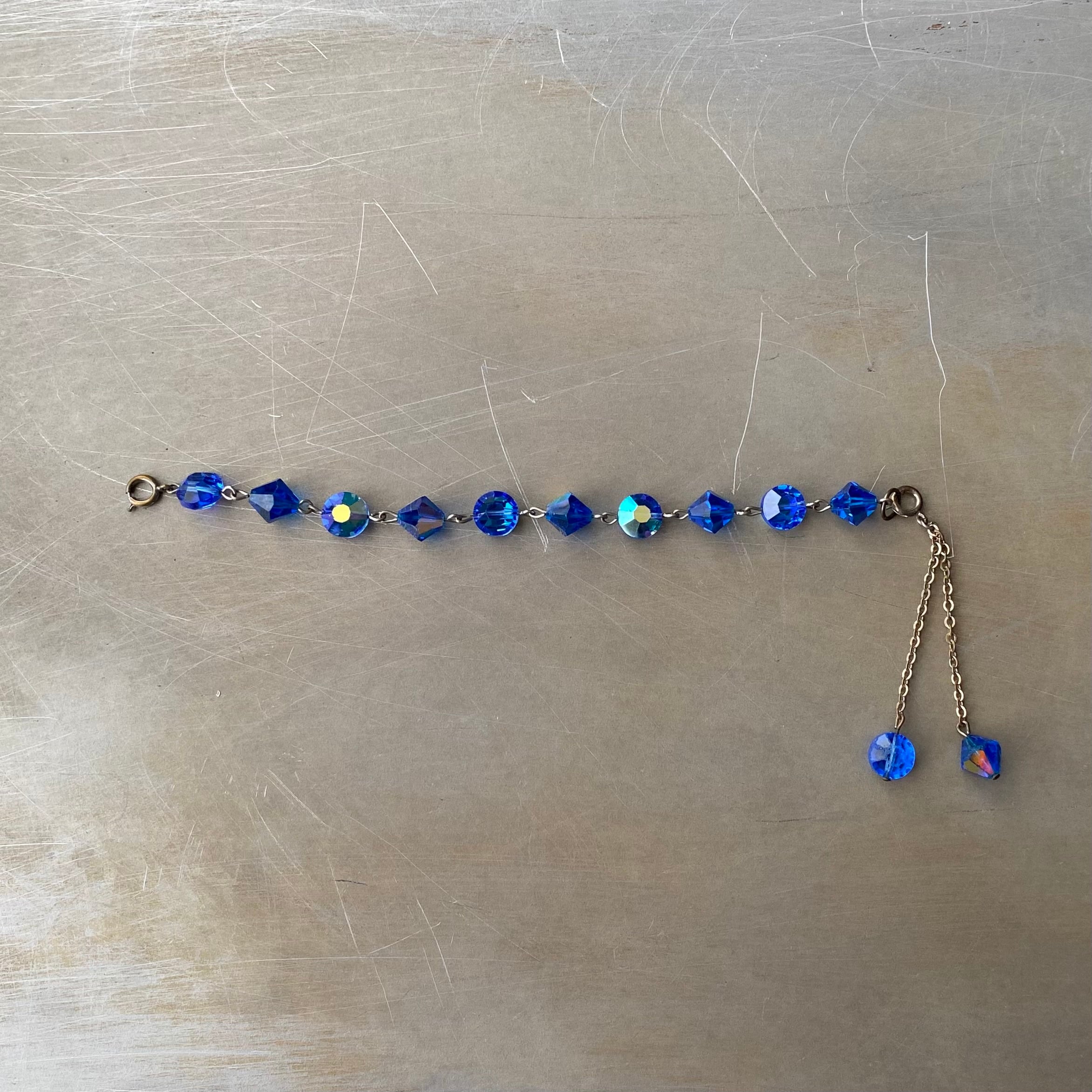 ブルーのガラスビーズがキラキラと輝くクラシカルな雰囲気のUSAヴィンテージブレスレット。エンドにはチェーンパーツが揺らめく個性的なデザインです。