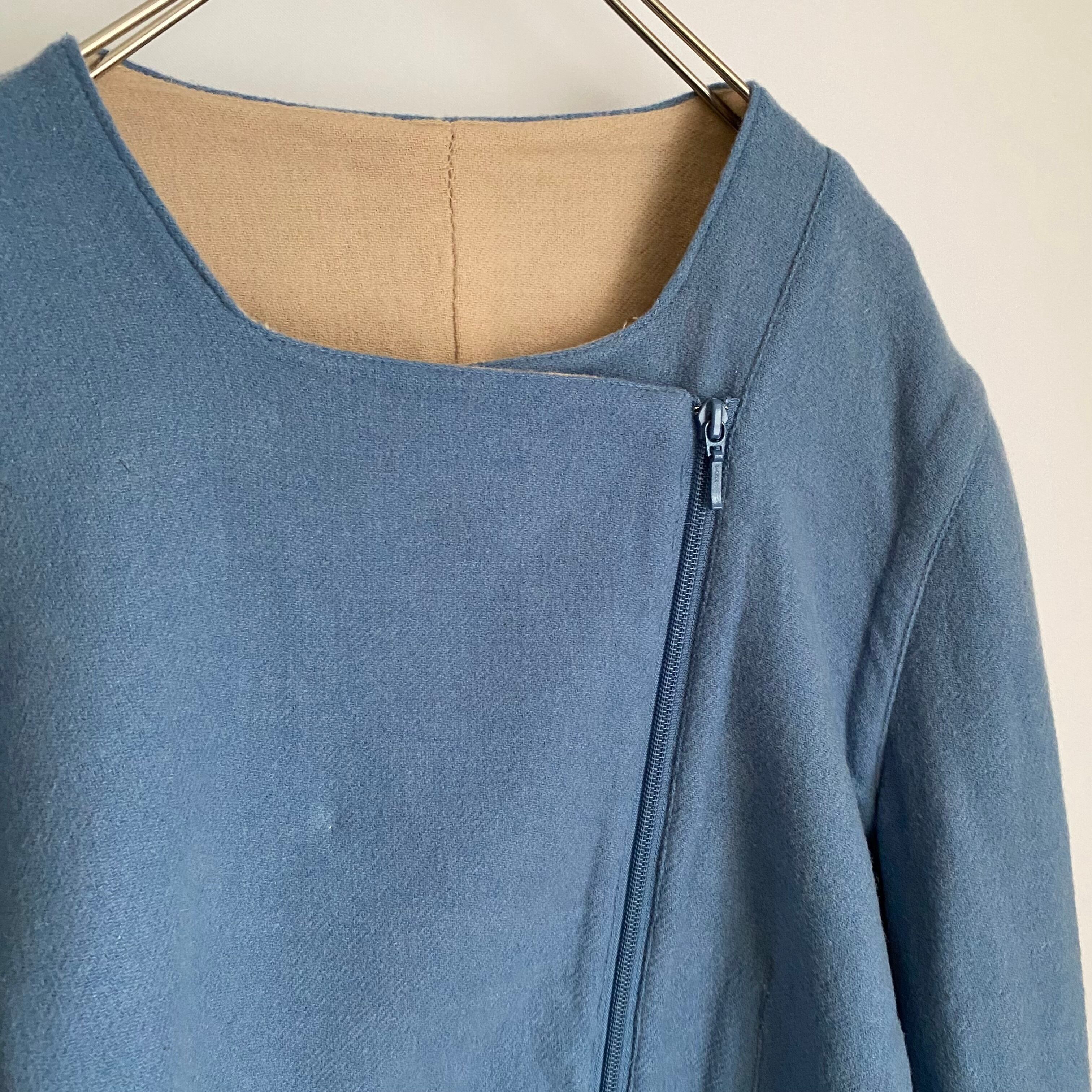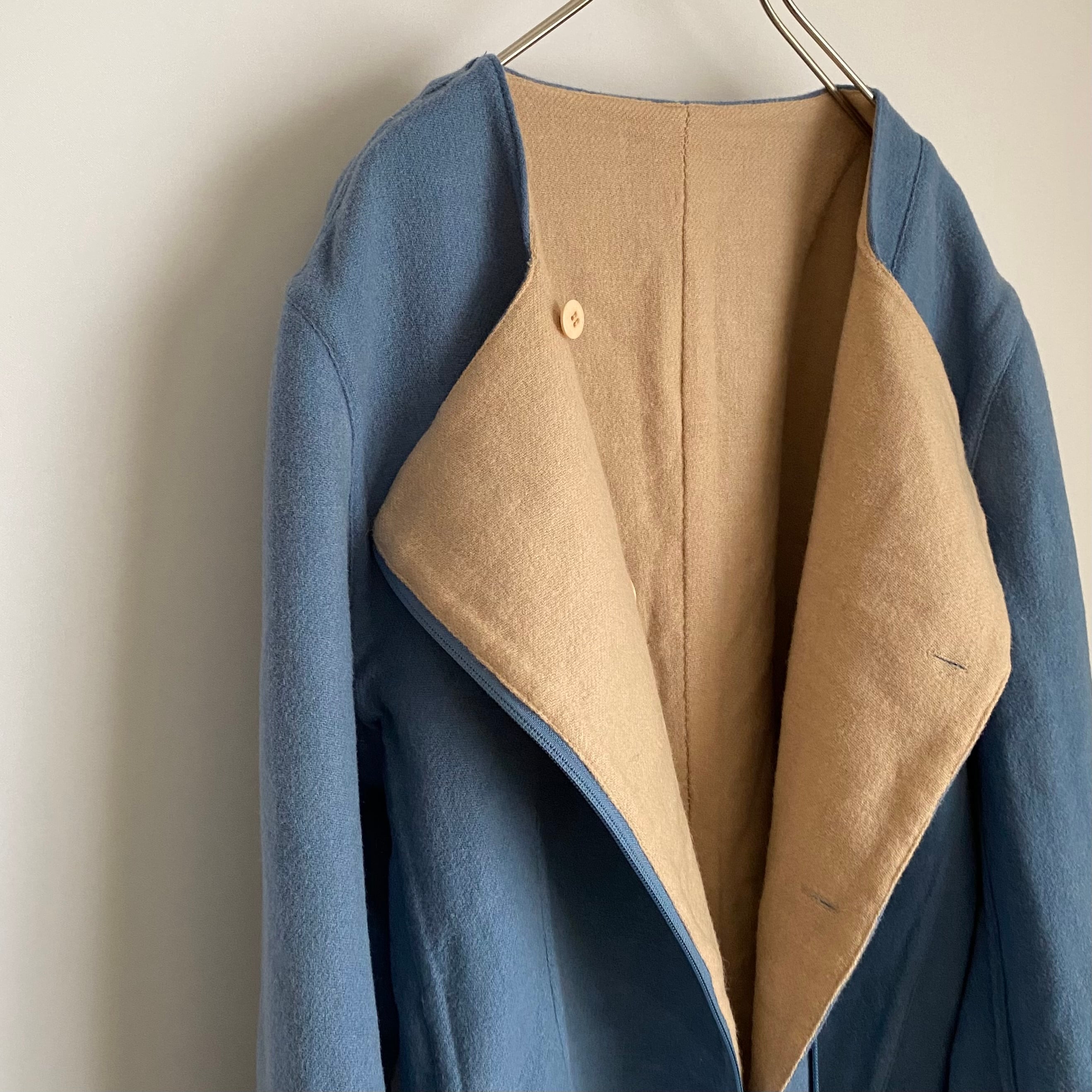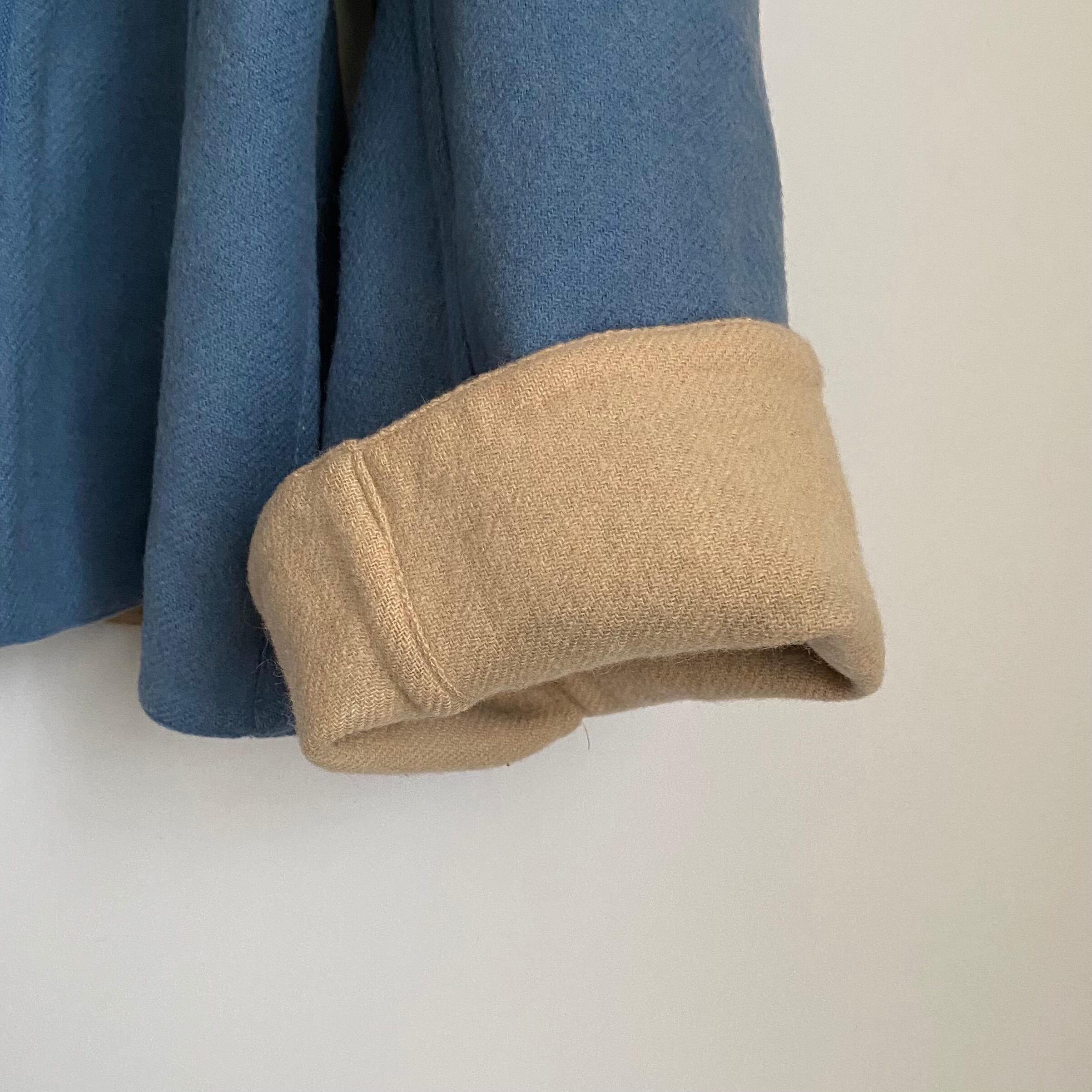 レトロな雰囲気が魅力的なUSAヴィンテージ古着コート。ブルー×ベージュのお洒落な色合いで暖かみのある生地感です。首まわりがスッキリとみえるデザインで、全体的に程よくゆとりのあるキレイなシルエット。カジュアルからキレイめなスタイルまで幅広くコーディネートしていただけます。