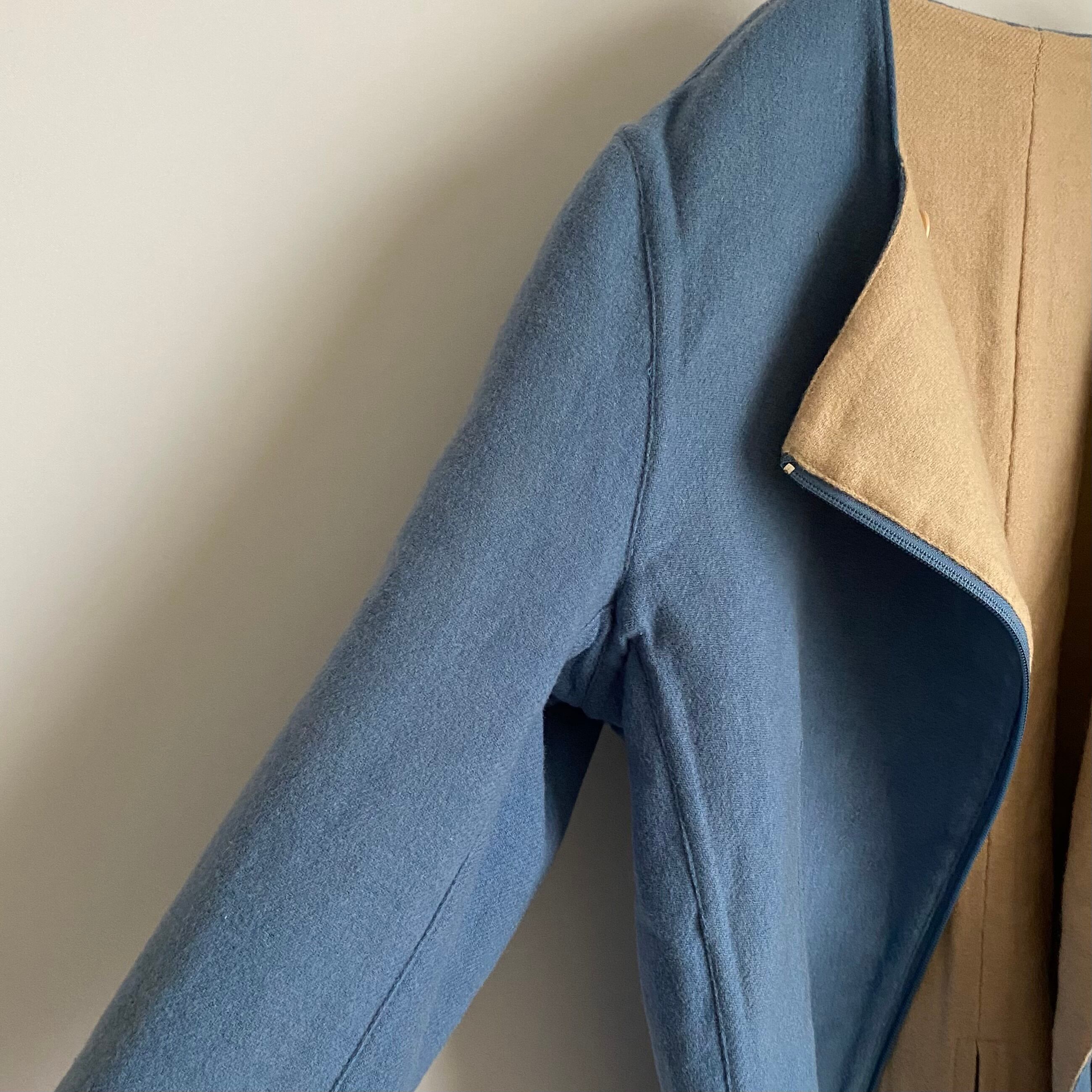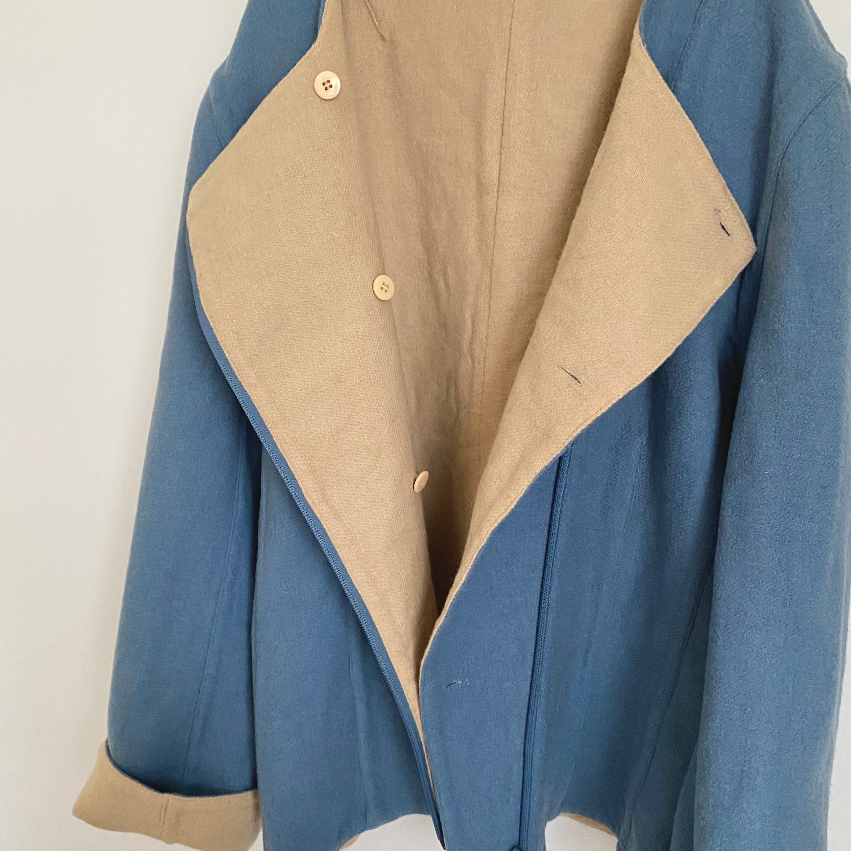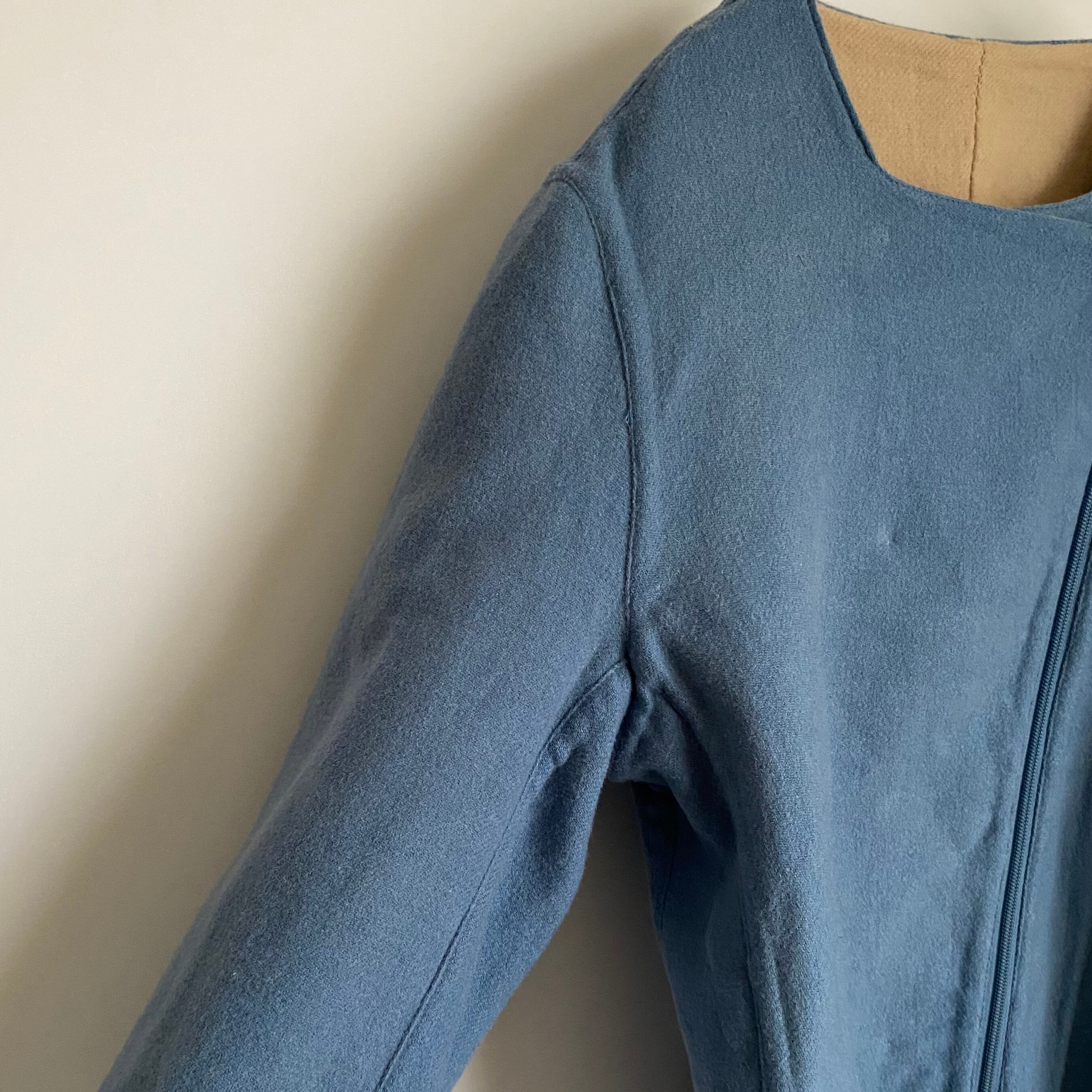 レトロな雰囲気が魅力的なUSAヴィンテージ古着コート。ブルー×ベージュのお洒落な色合いで暖かみのある生地感です。首まわりがスッキリとみえるデザインで、全体的に程よくゆとりのあるキレイなシルエット。カジュアルからキレイめなスタイルまで幅広くコーディネートしていただけます。