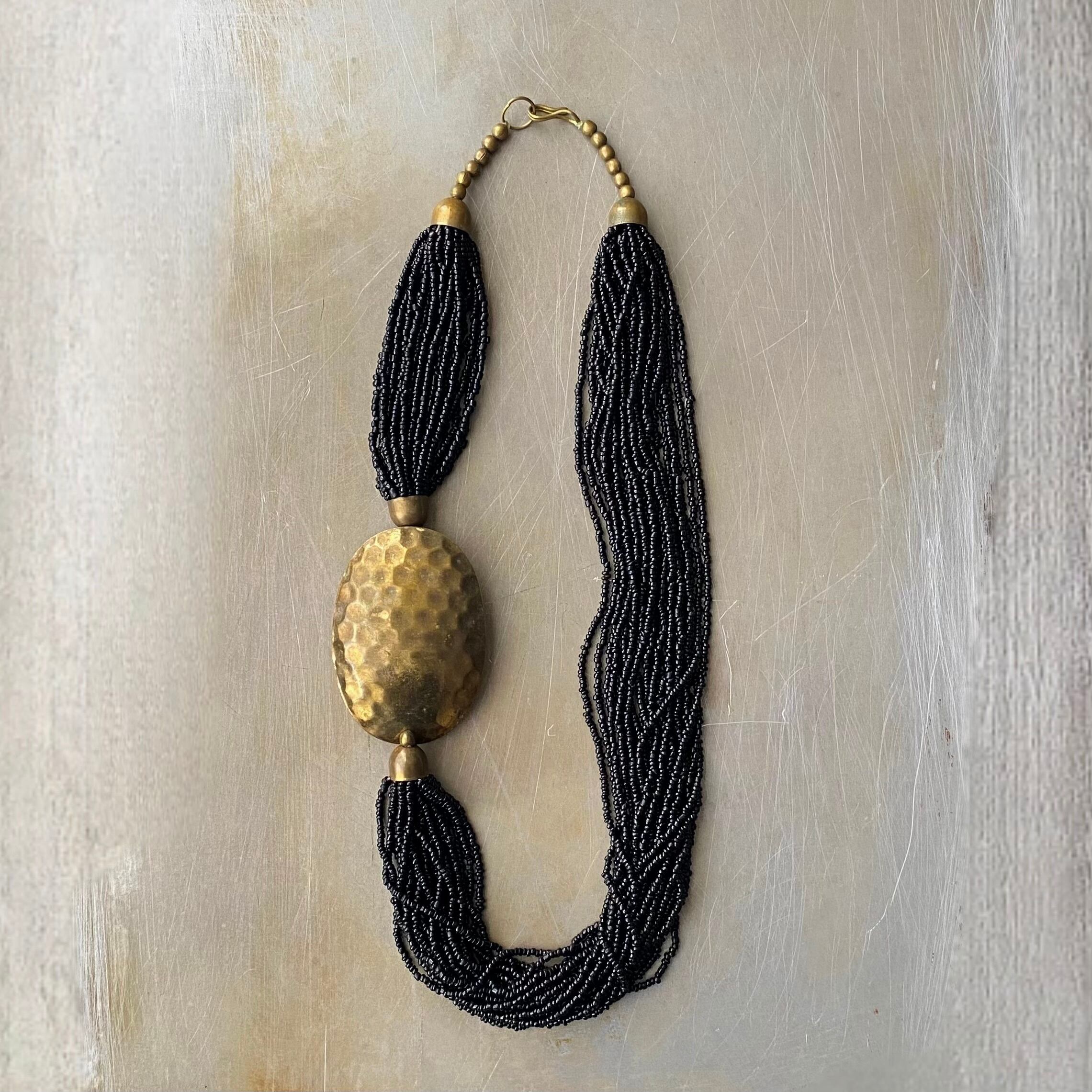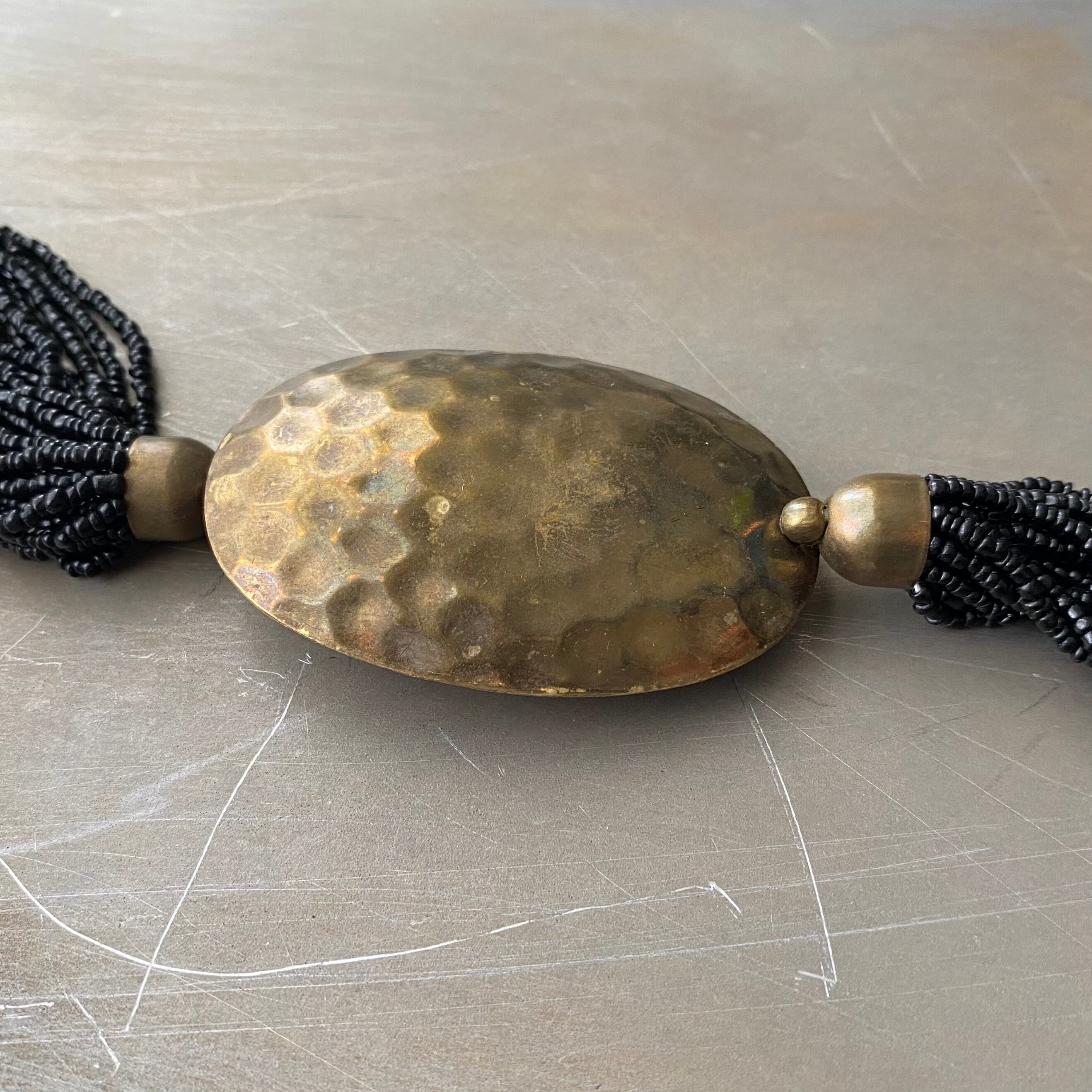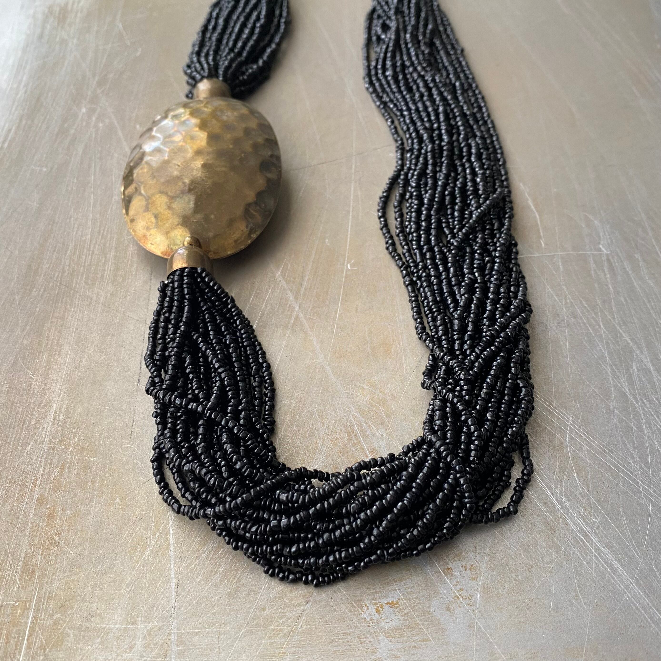幾重にも重なるシードビーズとクラフト感のあるメタルパーツがマッチしたユニークなデザインのUSAヴィンテージネックレス。大ぶりで存在感がありコーディネートのアクセントにおすすめです。
