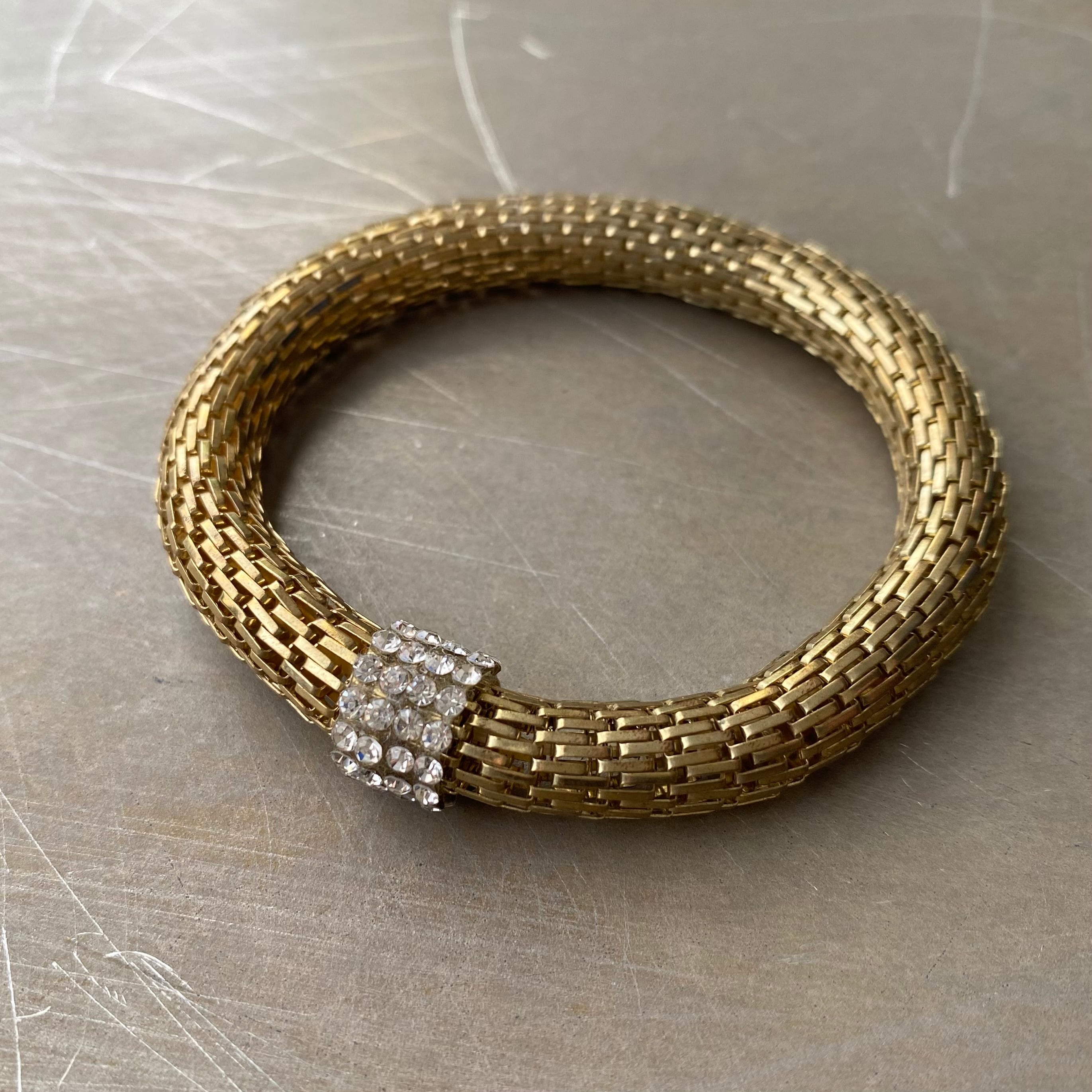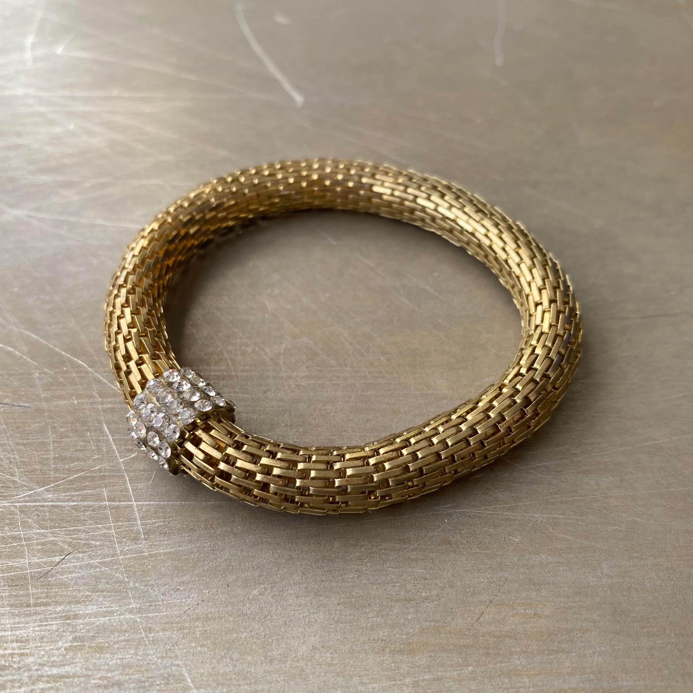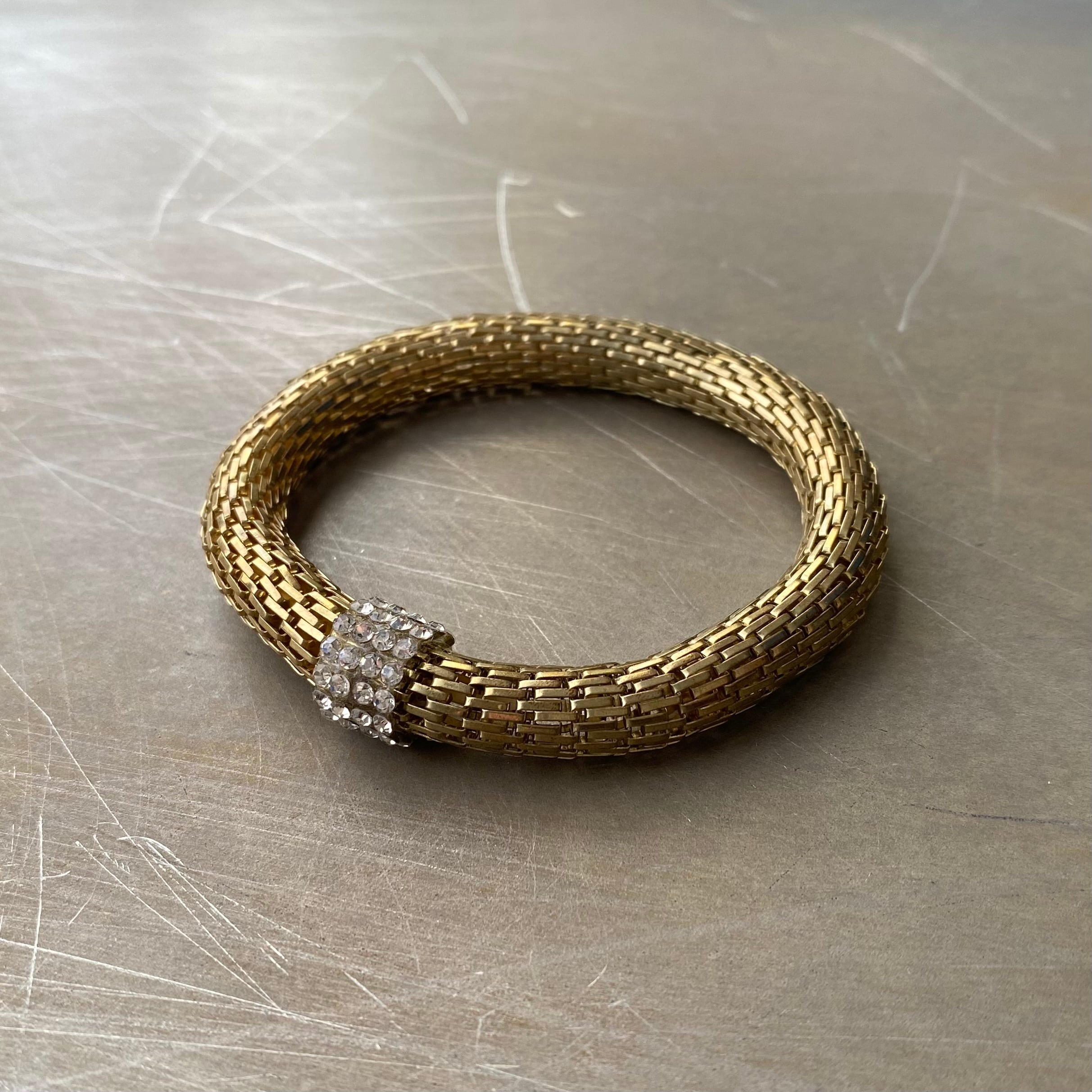 ビジューが輝くクラシカルな雰囲気のUSAヴィンテージブレスレット。メタルメッシュのブレスレット部分は伸縮性があります。カジュアルからエレガントなスタイルまで幅広くコーディネートしていただけます。