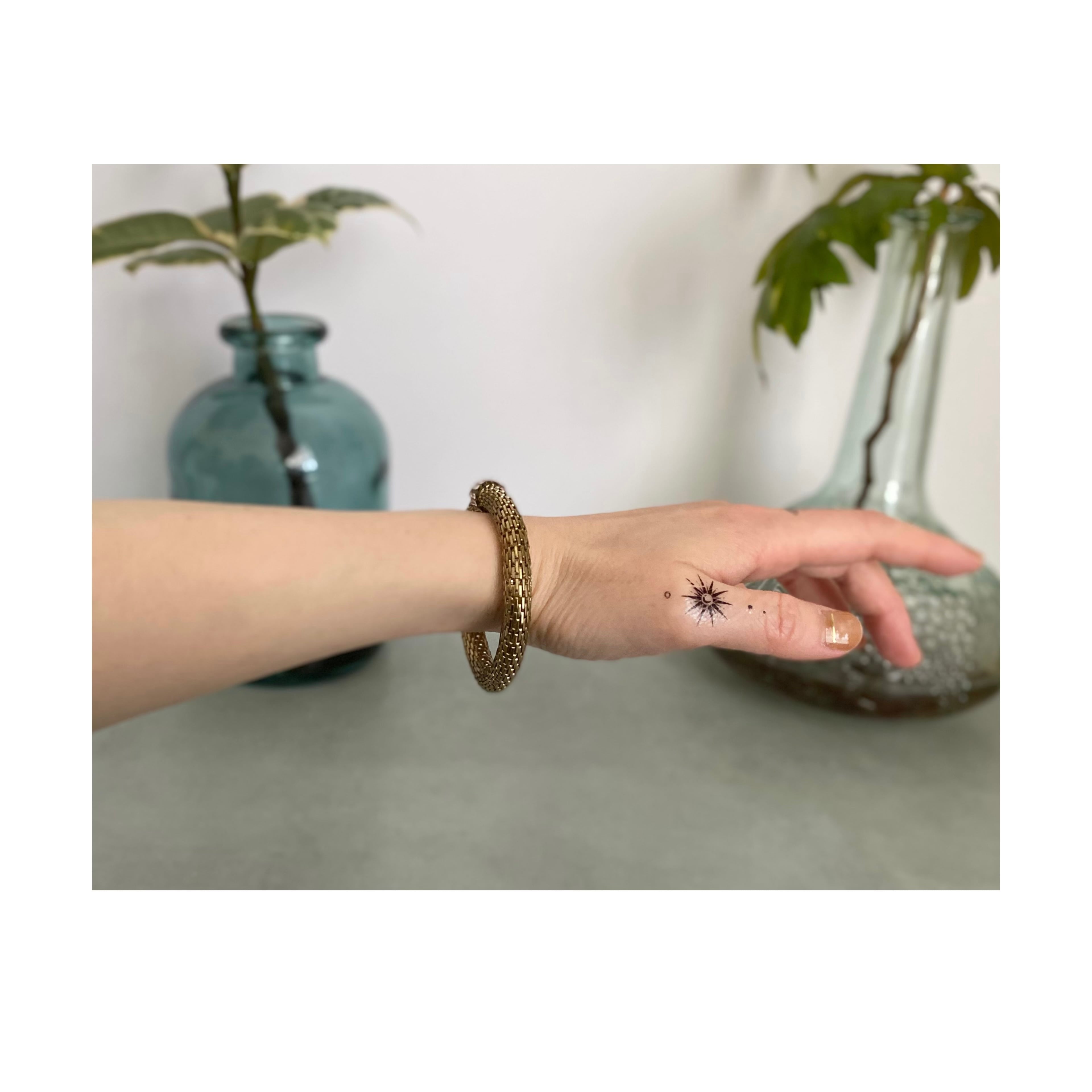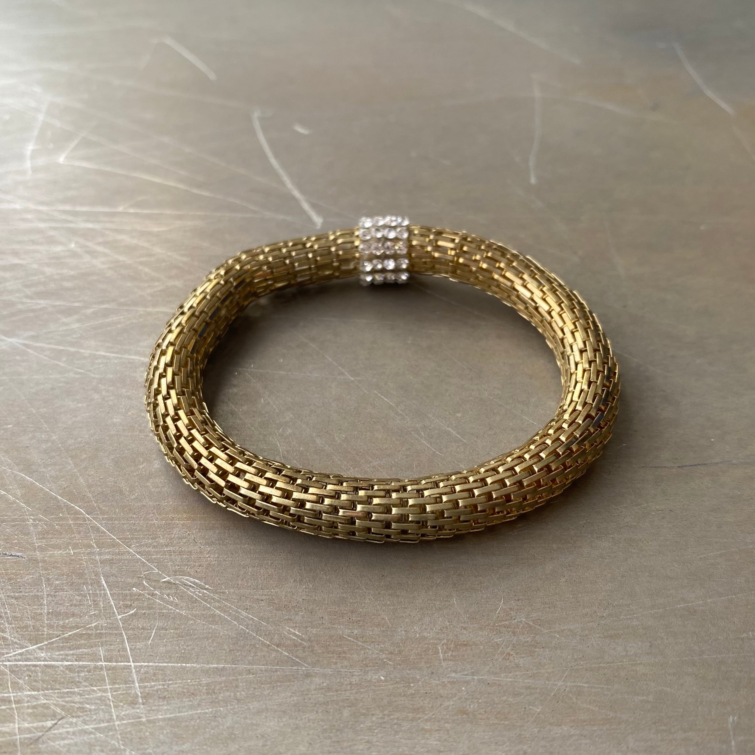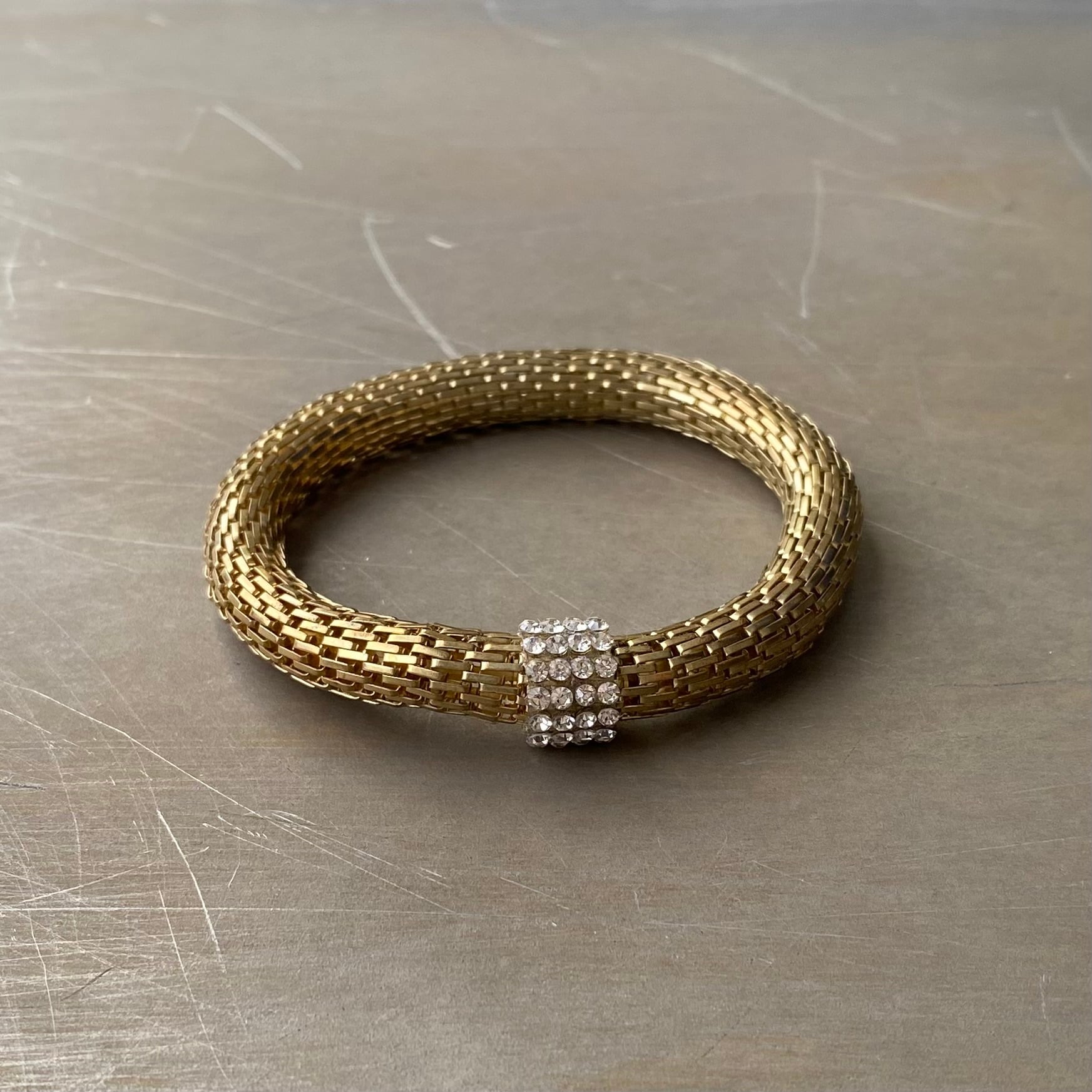 ビジューが輝くクラシカルな雰囲気のUSAヴィンテージブレスレット。メタルメッシュのブレスレット部分は伸縮性があります。カジュアルからエレガントなスタイルまで幅広くコーディネートしていただけます。