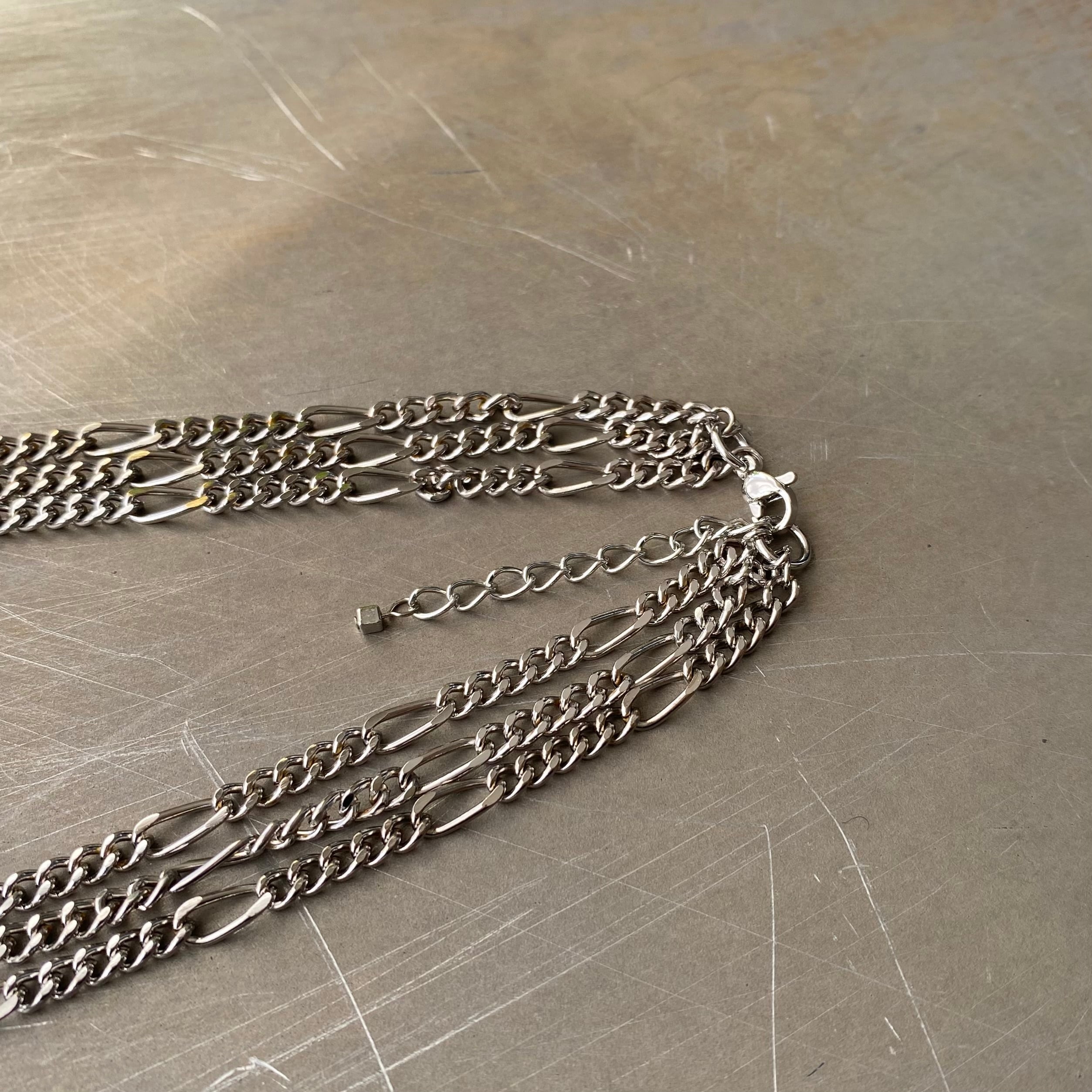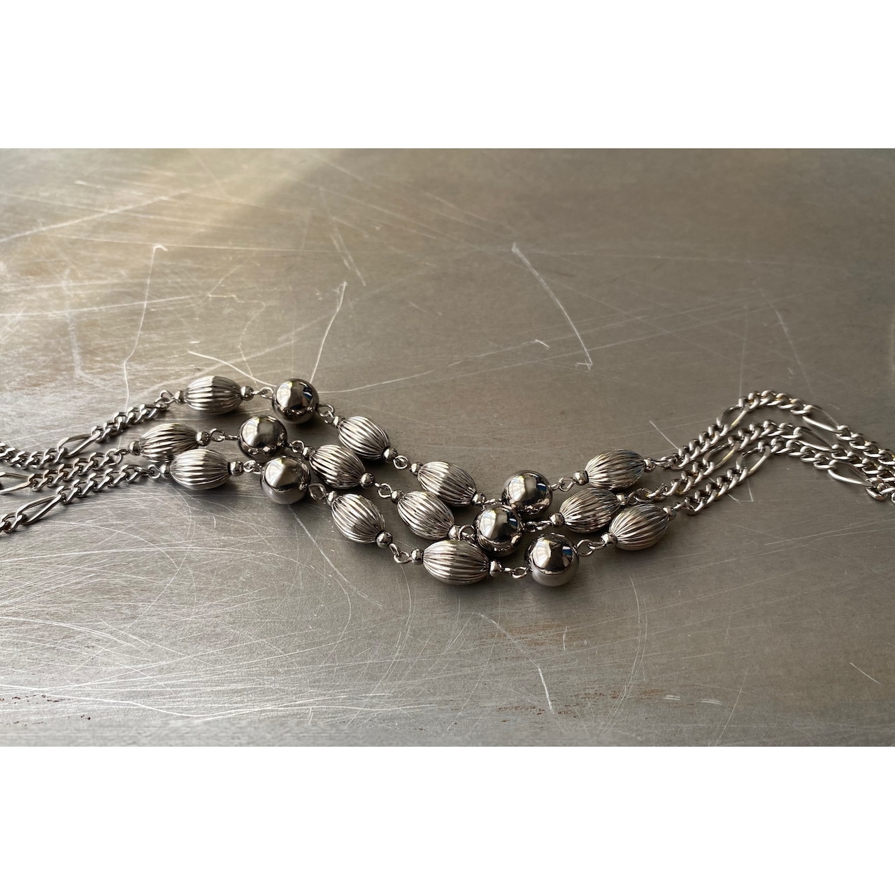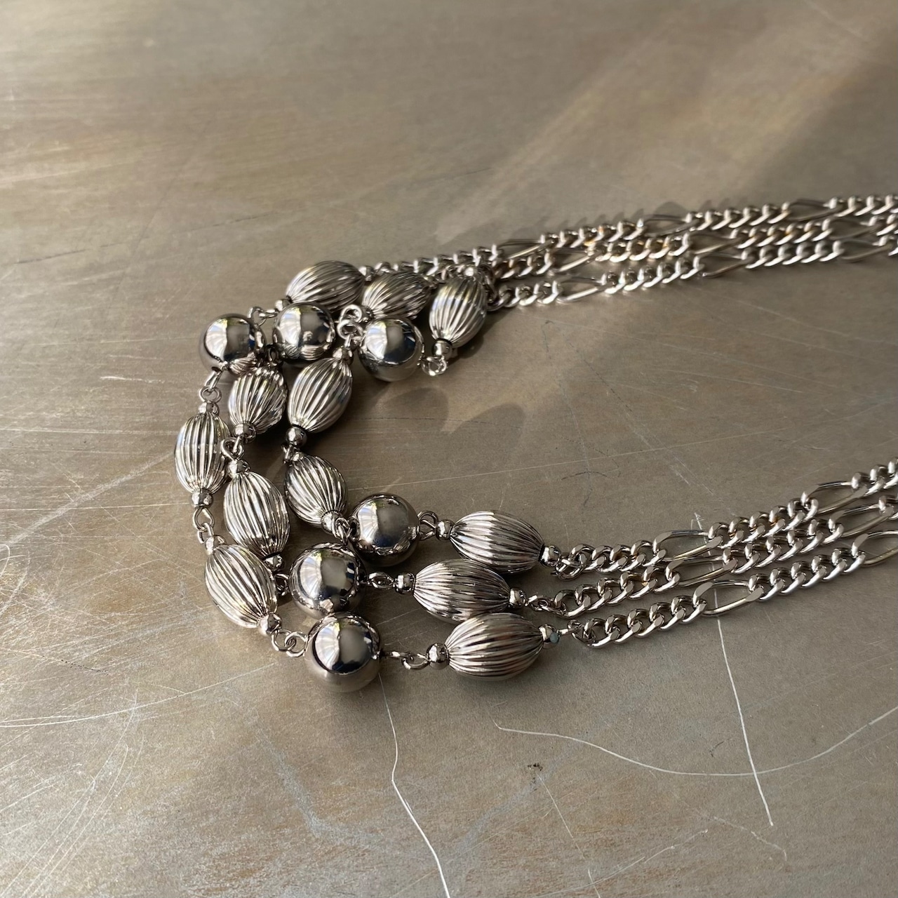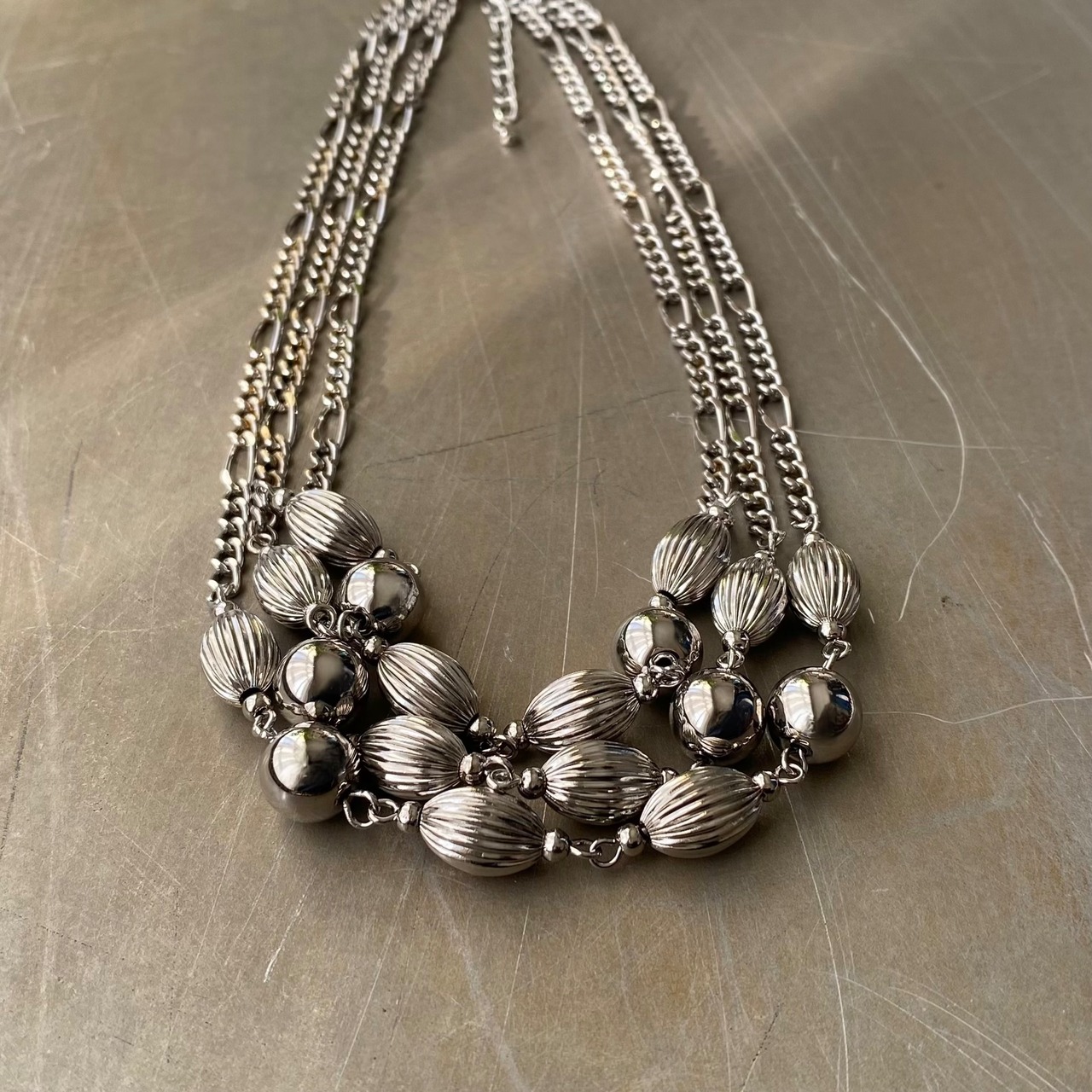 メタルビーズとチェーンがマッチしたクールな雰囲気のUSAヴィンテージネックレス。ほどよいボリューム感の3連タイプで、スタイリングにお洒落な雰囲気をプラスしてくれます。