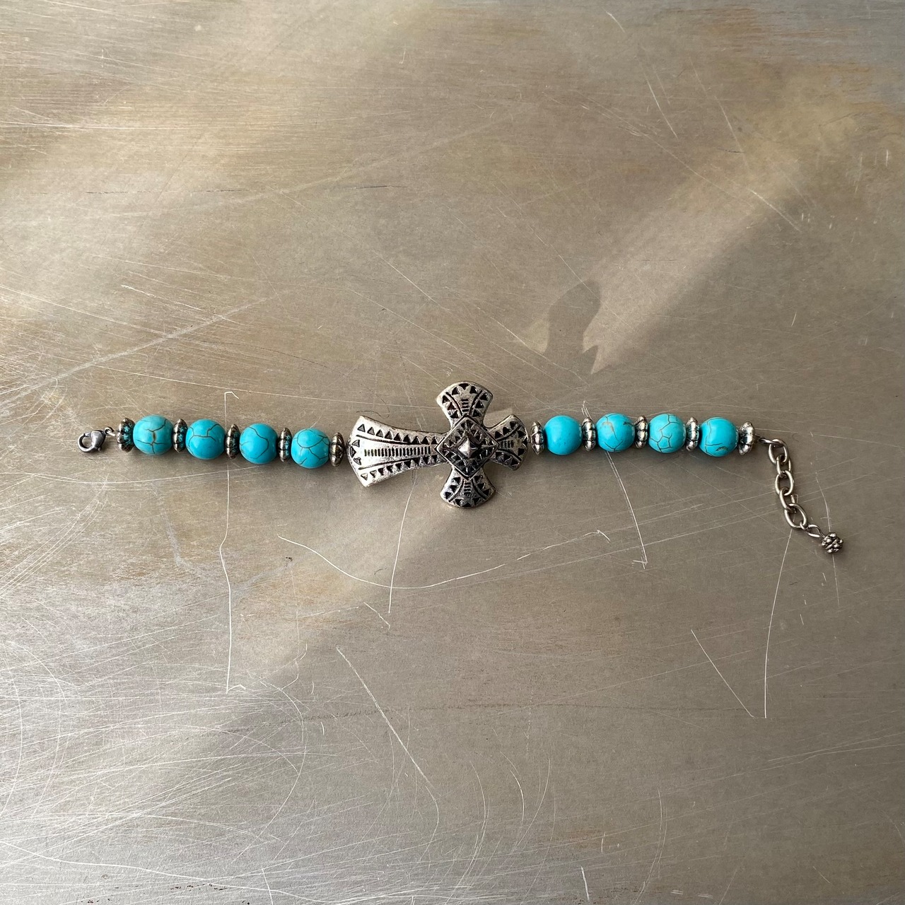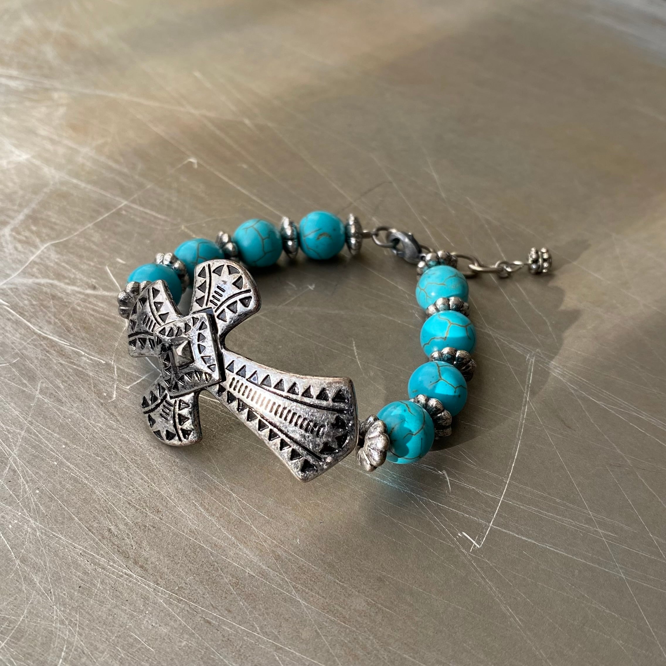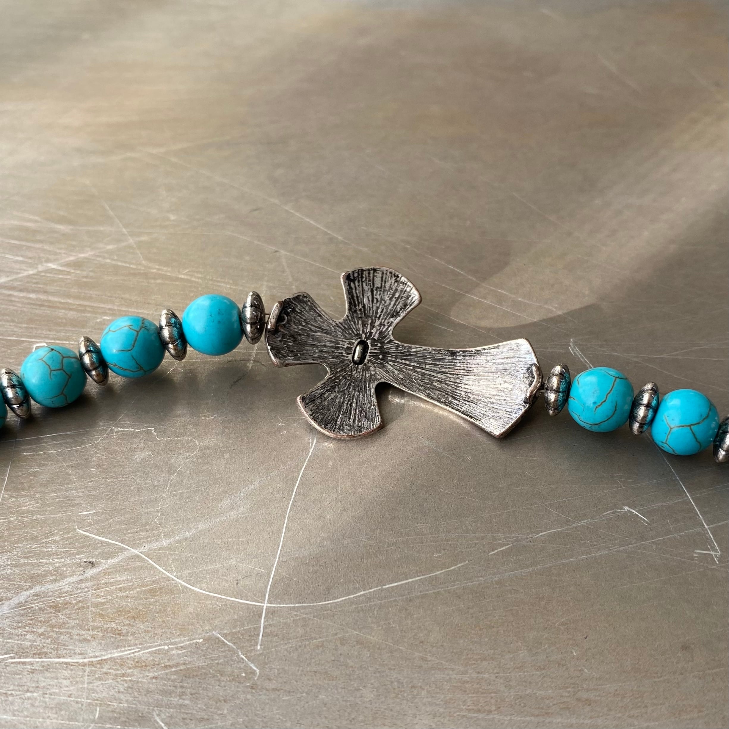 Used USA cross turquoise blue beads bracelet レトロ アメリカ ユーズド アクセサリー クロス ターコイズブルー ビーズ ブレスレット