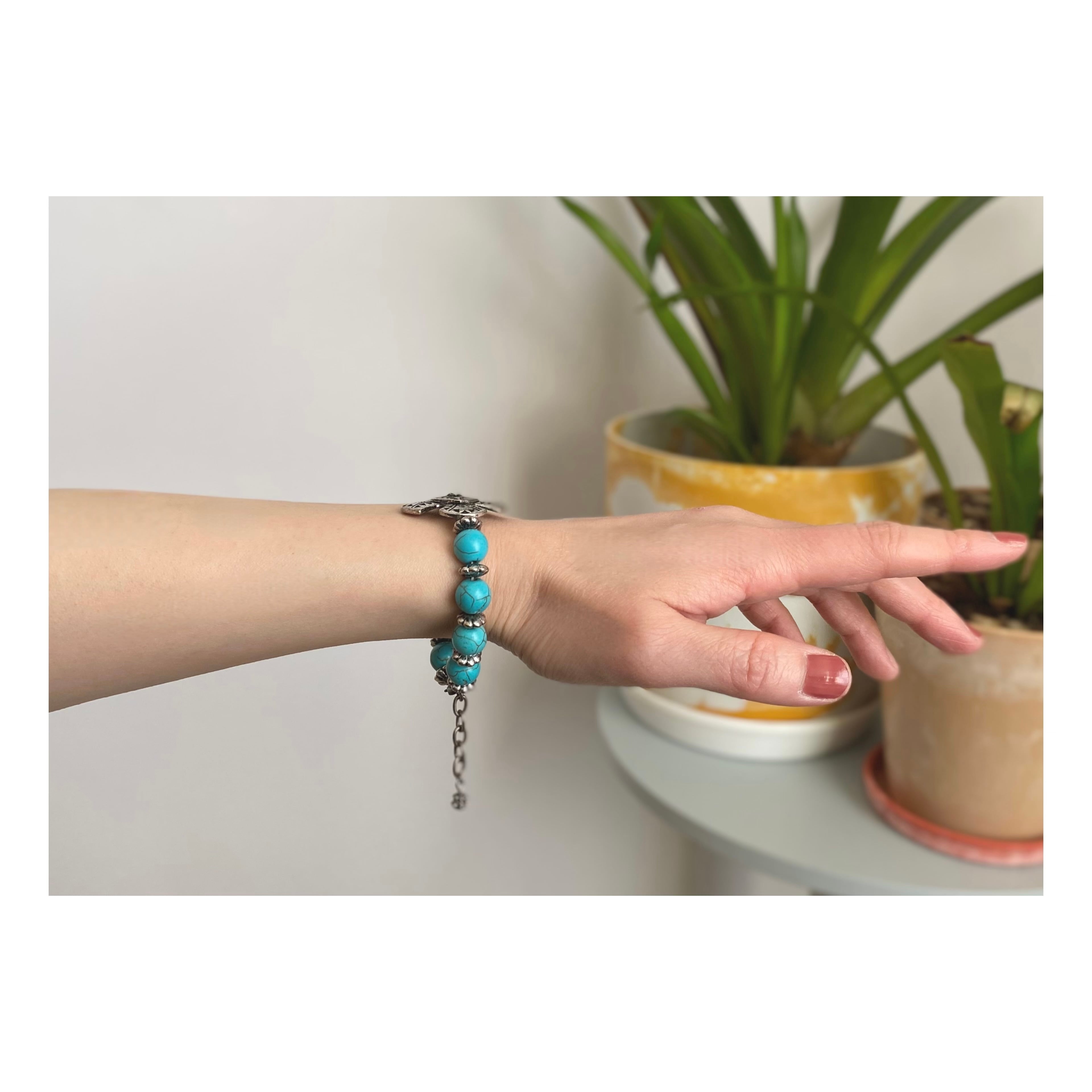 ネイティブアメリカン風デザインのクロスと爽やかなターコイズカラーのストーンが魅力的なUSAユーズドブレスレット。ボリューム感がありコーディネートの差し色に。古着スタイルにもおすすめです。