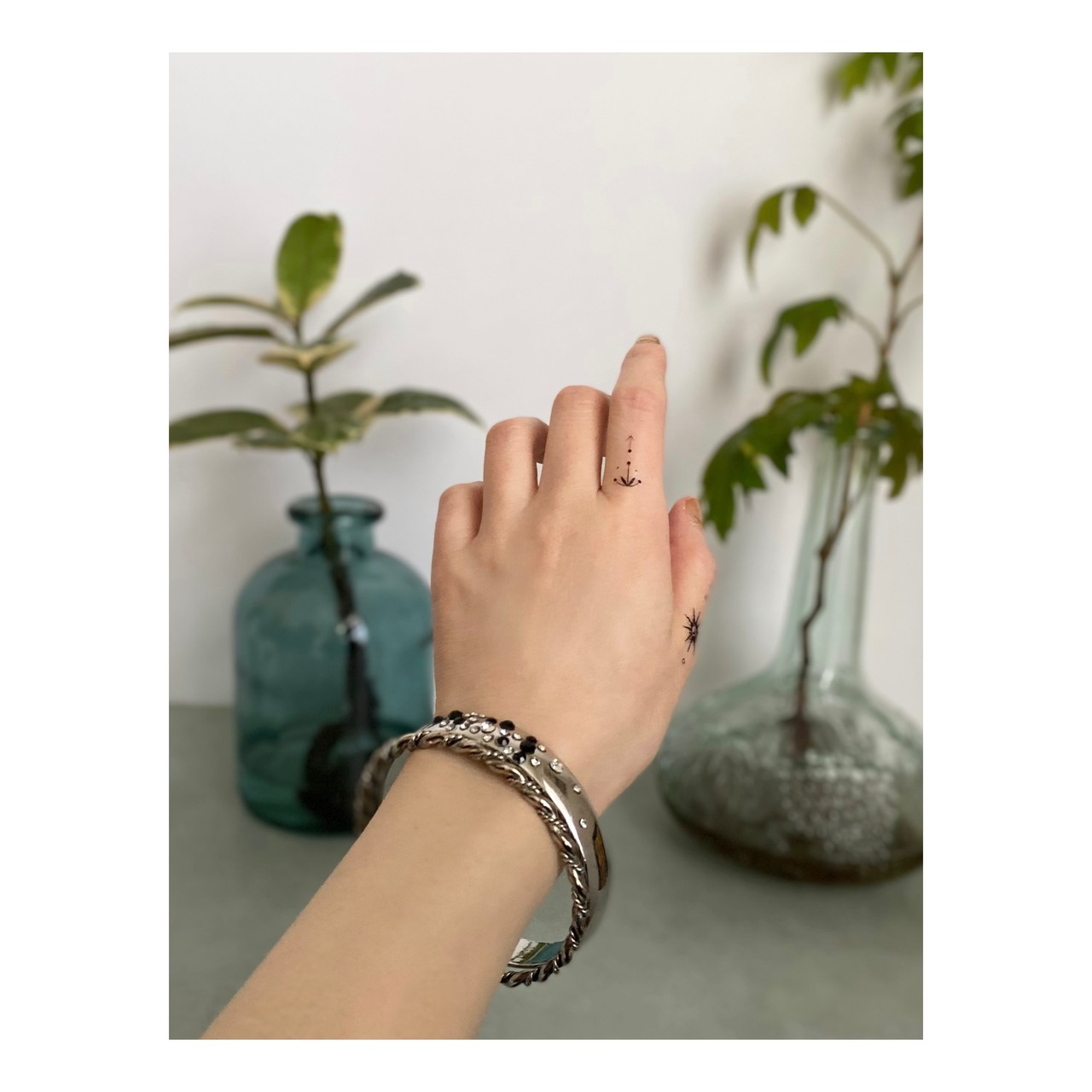 モノトーンのビジューが輝くスタイリッシュな雰囲気のUSAヴィンテージバングル。ほどよいボリューム感の2本セットで、様々なスタイルに合わせていただけます。